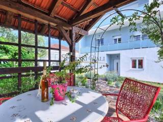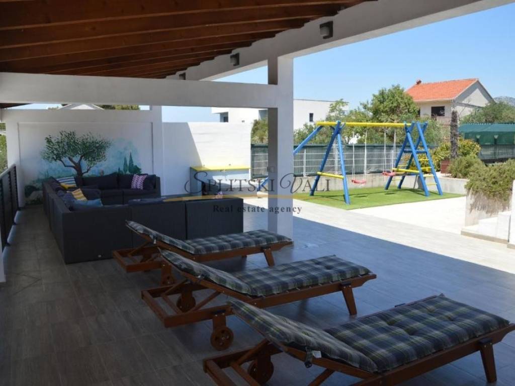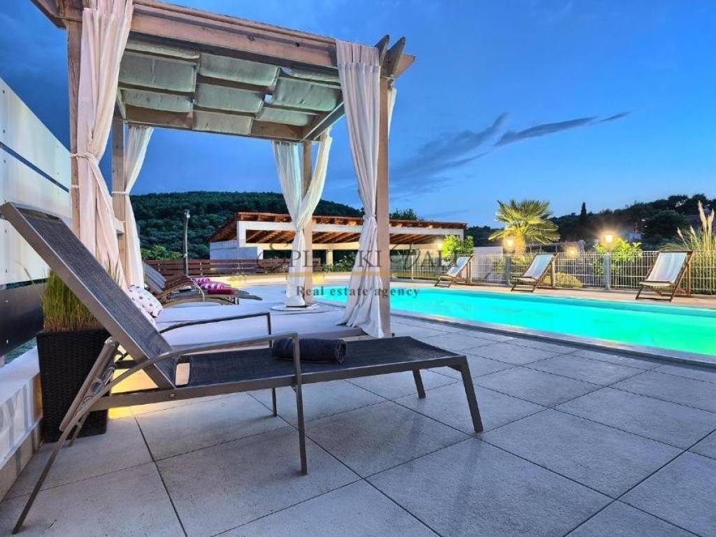 Okućnica je prostrana i privatna, s vanjskim bazenom, sunčalištem i dječjim igralištem, pružajući idealan prostor za opuštanje i druženje u prirodnom okruženju. Na vanjskom prostoru nalazi se i elegantan kamin, dok četiri natkrivena parkirna mjesta osiguravaju dodatnu funkcionalnost i praktičnost.