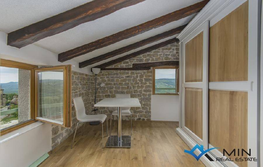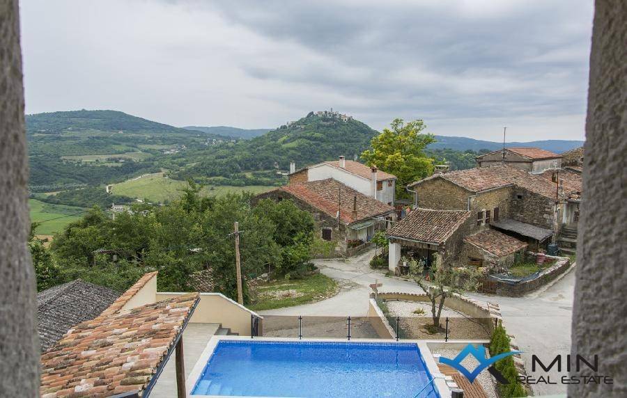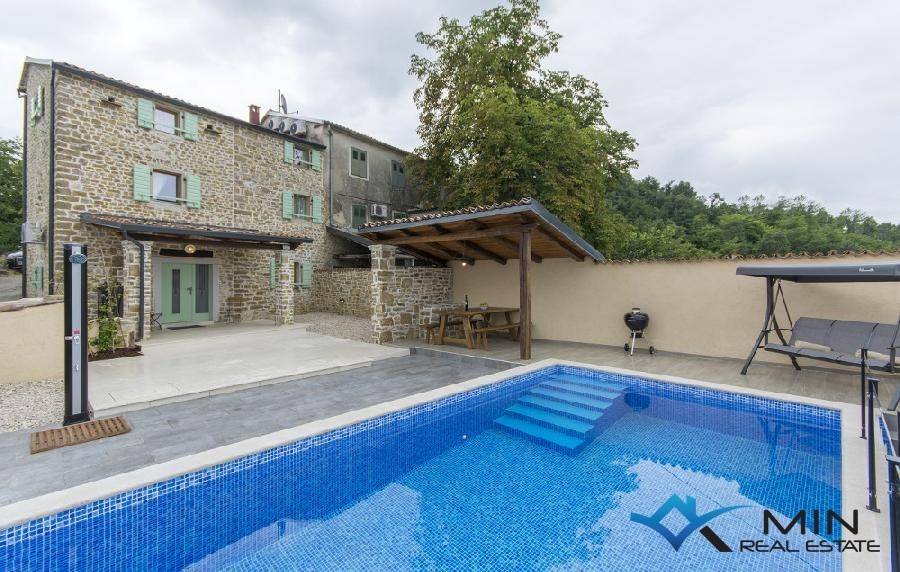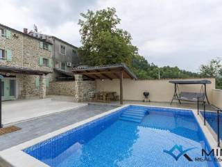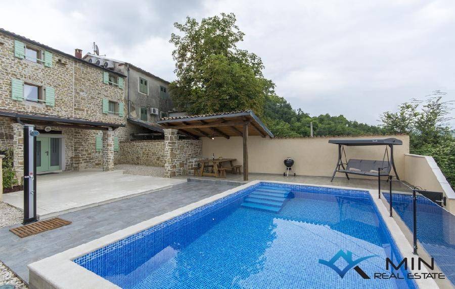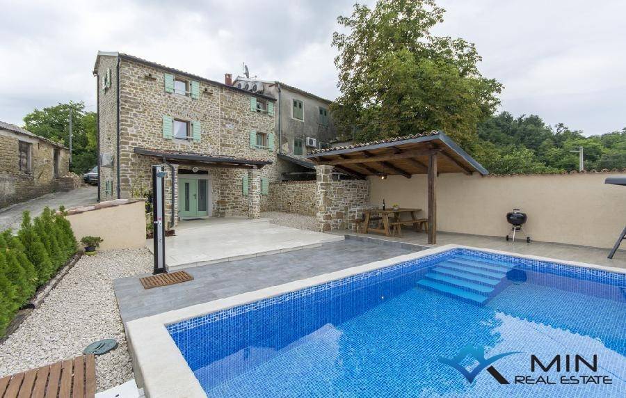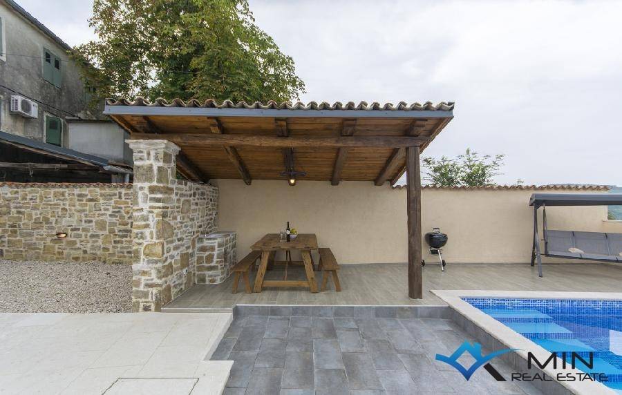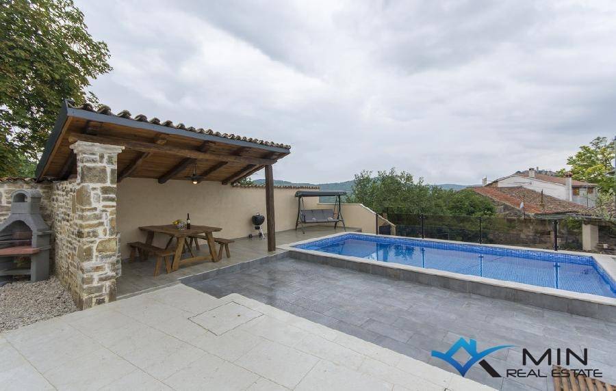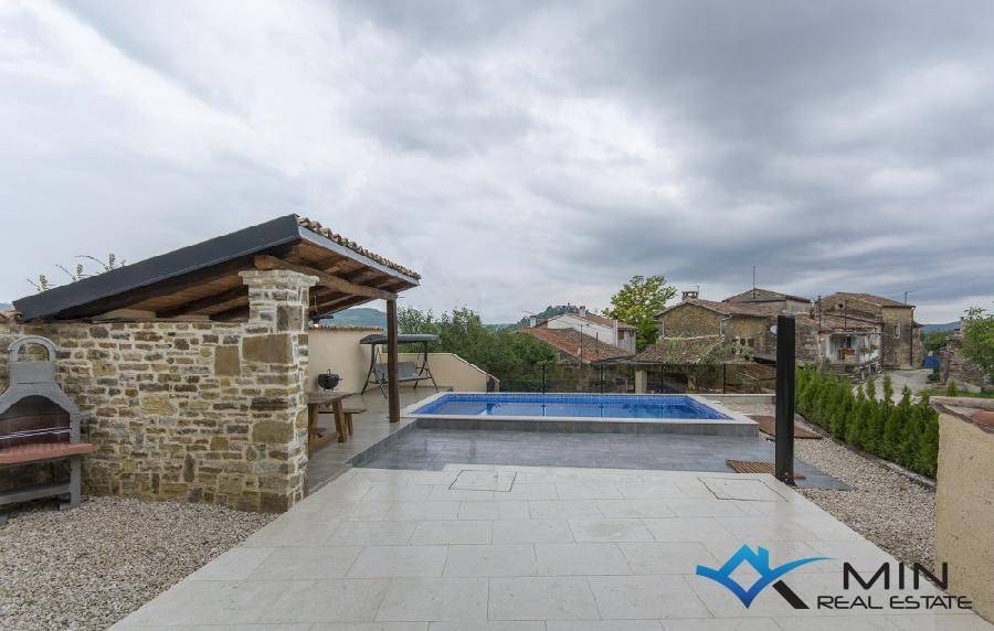Renovated stone house with swimming pool - Motovun: The stone house is located in a quiet location in the place next to Motovun. From the house there is a beautiful view of nature and Motovun. The house has 2 private parking, a beautifully landscaped garden, a swimming pool and a canopy with a fireplace. It consists of living room, kitchen, dining room, 3 bathrooms and 3 bedrooms. Completely renovated and furnished. Distance from the center of Motovun is 3-4 km and the sea is about 20 kilometers. Renovated stone house for sale with swimming pool in a quiet location near Motovun.