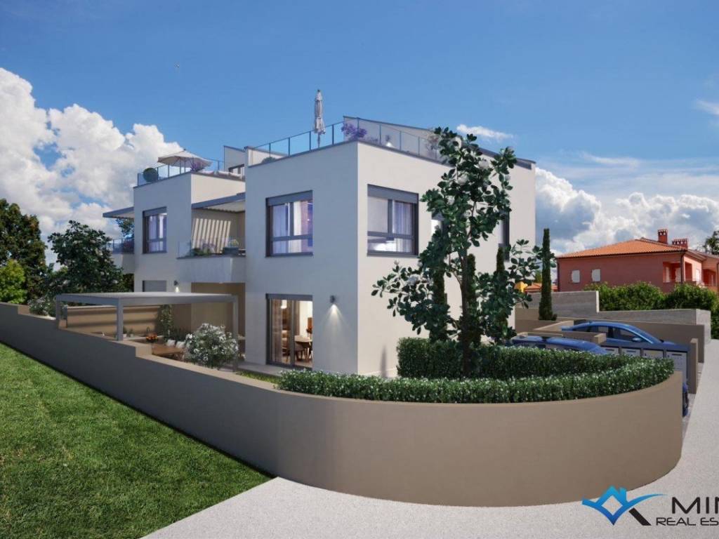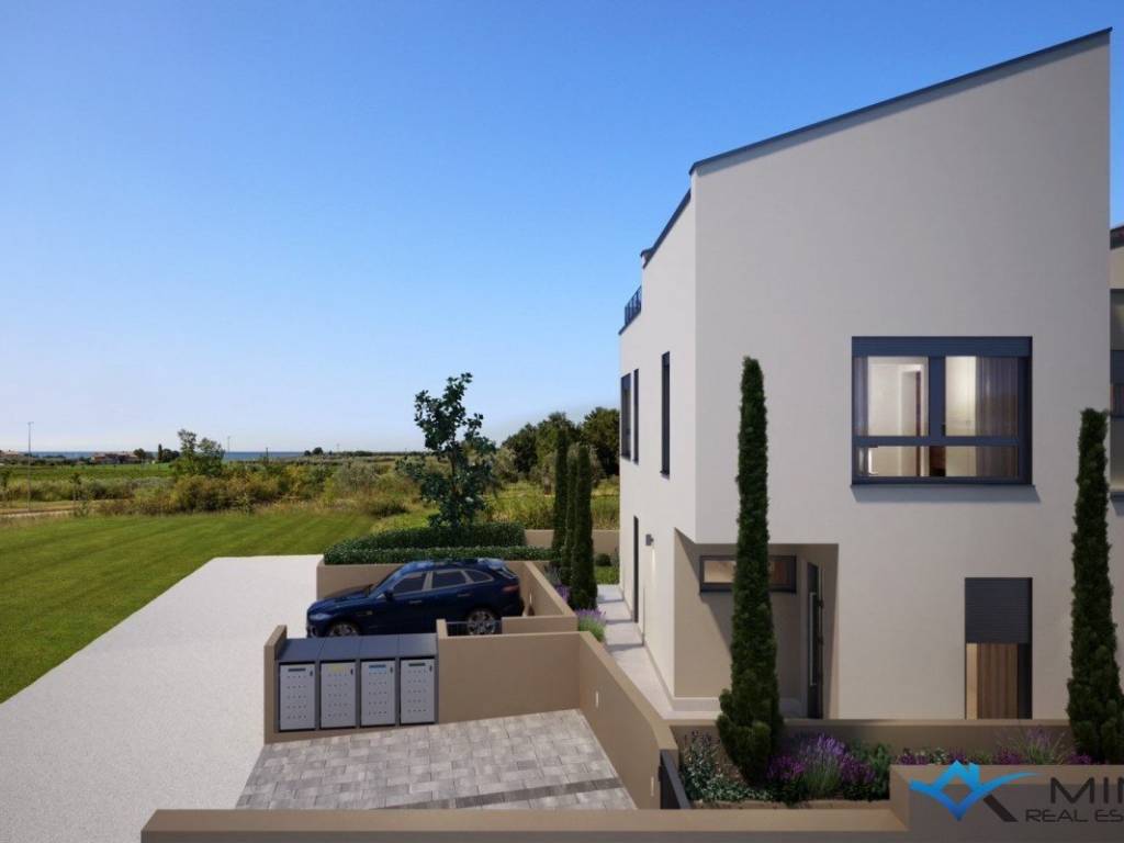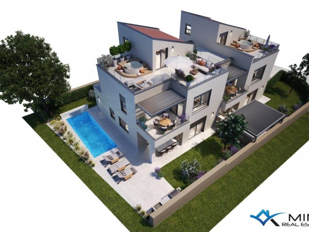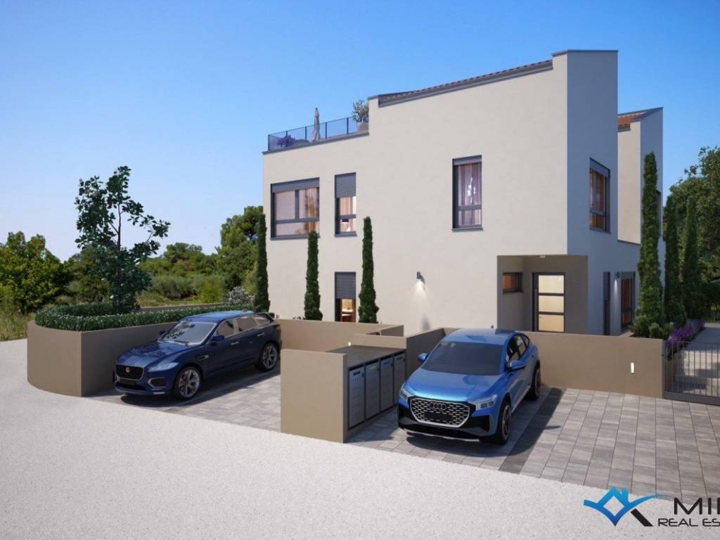 Modern semi-detached house for sale in a quiet location in Novigrad. The house is 2 km from the city center and 1.5 km from the sea and a beautifully landscaped beach. The house has 200 m2 and consists of 3 floors. On the ground floor there is an entrance hall, a storage room, a bathroom, a bedroom, a kitchen with a dining room and a living room with access to a covered terrace, garden and swimming pool. On the 1st floor there are 3 bedrooms, 2 bathrooms and 2 terraces. On the second floor there is a bedroom with a bathroom and a roof terrace of 23 m2 with a beautiful view of the sea and nature. The house is equipped with underfloor heating, a fireplace and air conditioning. The house can be used for residential or tourist purposes.