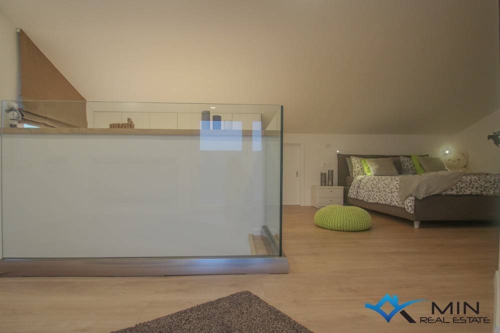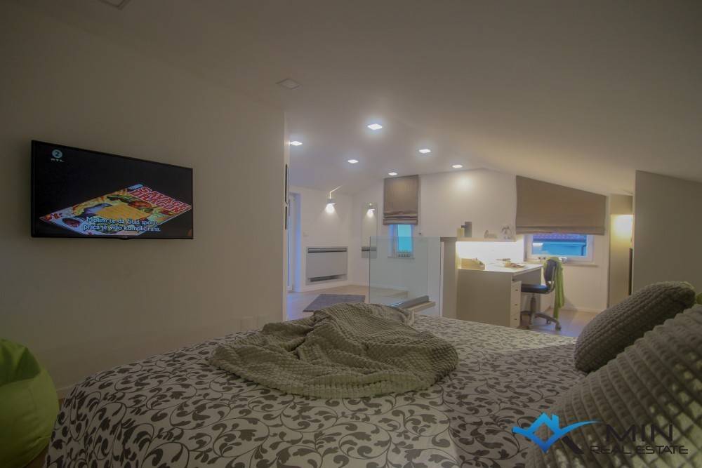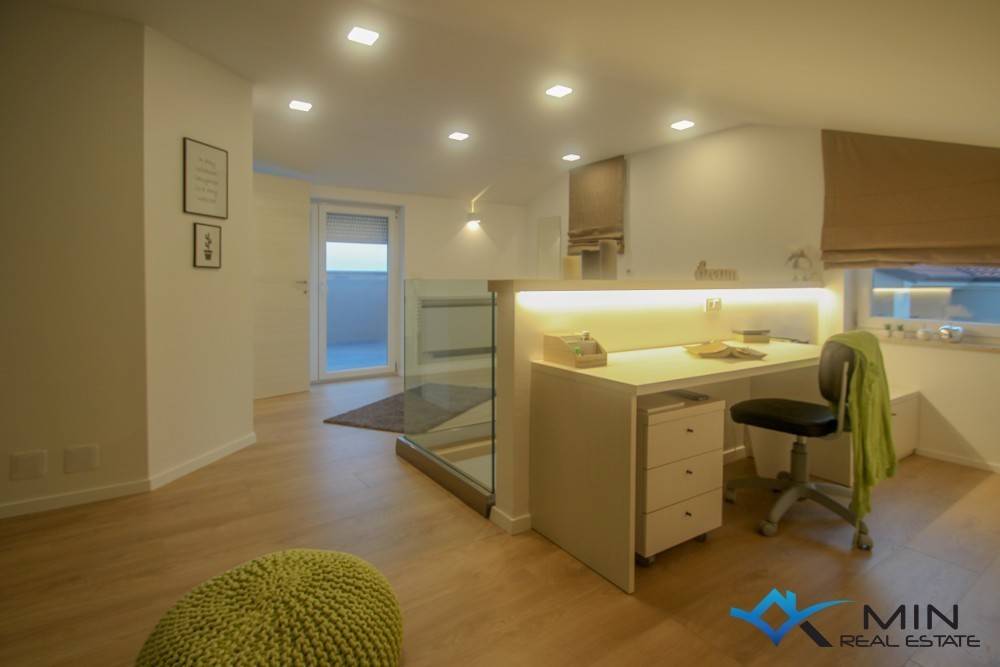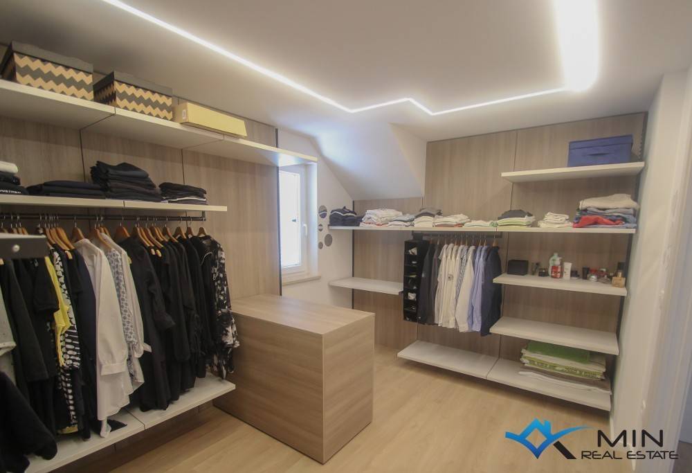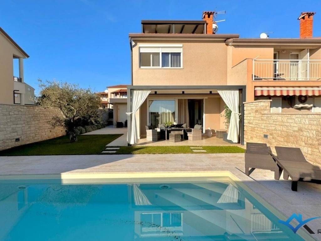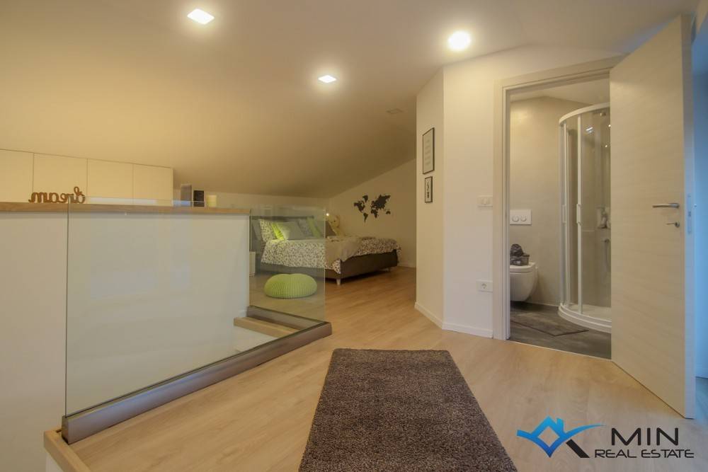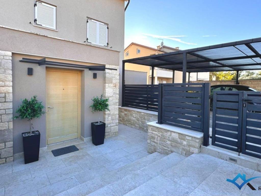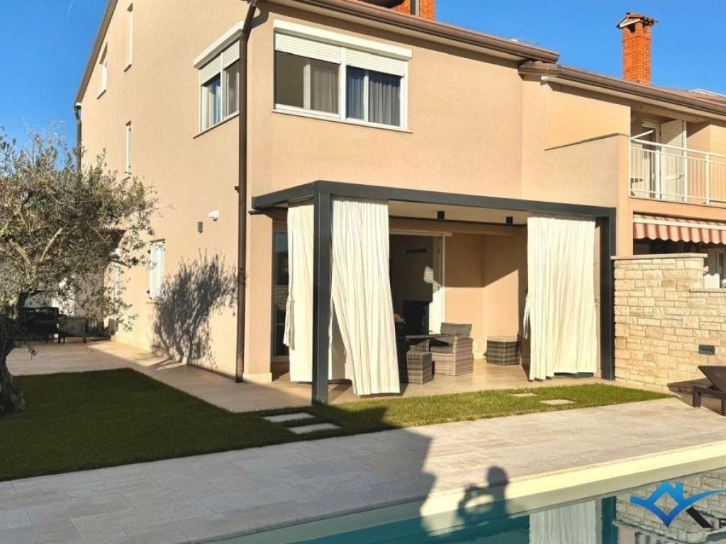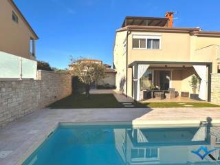 In a quiet location, only 1200 m from the sea and 1700 m from the center of Novigrad, a nicely furnished terraced house with a swimming pool is for sale. The house has 185 m2 and is divided into ground floor, first floor and attic. The ground floor consists of a hallway, a storage room, a bathroom and an open space where there is a kitchen with a dining room and a living room with access to a beautifully landscaped garden of 264 m2 with a swimming pool, and there are 2 parking spaces in front of the house. On the 1st floor there are 2 bedrooms, a bathroom and a wardrobe, and in the attic there is a bedroom with a bathroom and access to a covered terrace with a beautiful view of the sea. The ground floor of the house is heated by underfloor heating and a fireplace, and the rest of the house is heated and cooled by air conditioning. The house can be used for residential or tourist purposes.