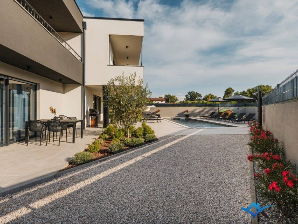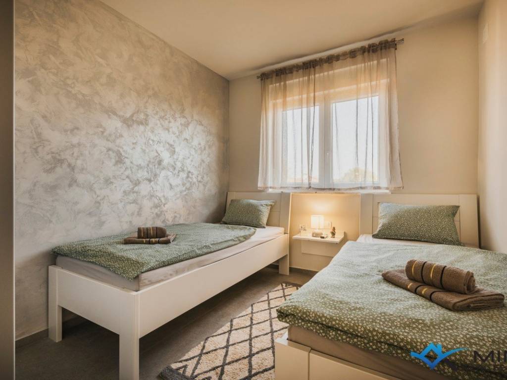 A beautiful house for sale in a quiet location near Umag. The house is located in a quiet neighborhood and is divided into 3 apartments. On the ground floor there are 2 apartments (50 m2 and 65 m2) consisting of a hallway, bathroom, 1 bedroom, kitchen with dining room and living room with access to the terrace, garden and shared pool. On the 1st floor there is a large comfortable apartment of 126 m2, which can be converted into 2 apartments. The apartment consists of a hallway, a storage room, 2 bathrooms, 3 bedrooms, a study (fitness room) and an open space consisting of a kitchen with a dining room and a living room with access to a covered terrace. The house has a beautifully landscaped yard with a swimming pool. The house can be used for residential or tourist purposes. The house is sold fully furnished.