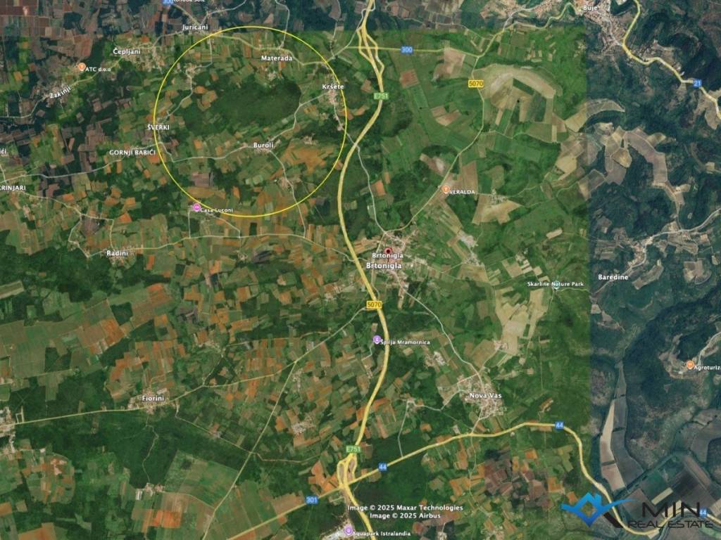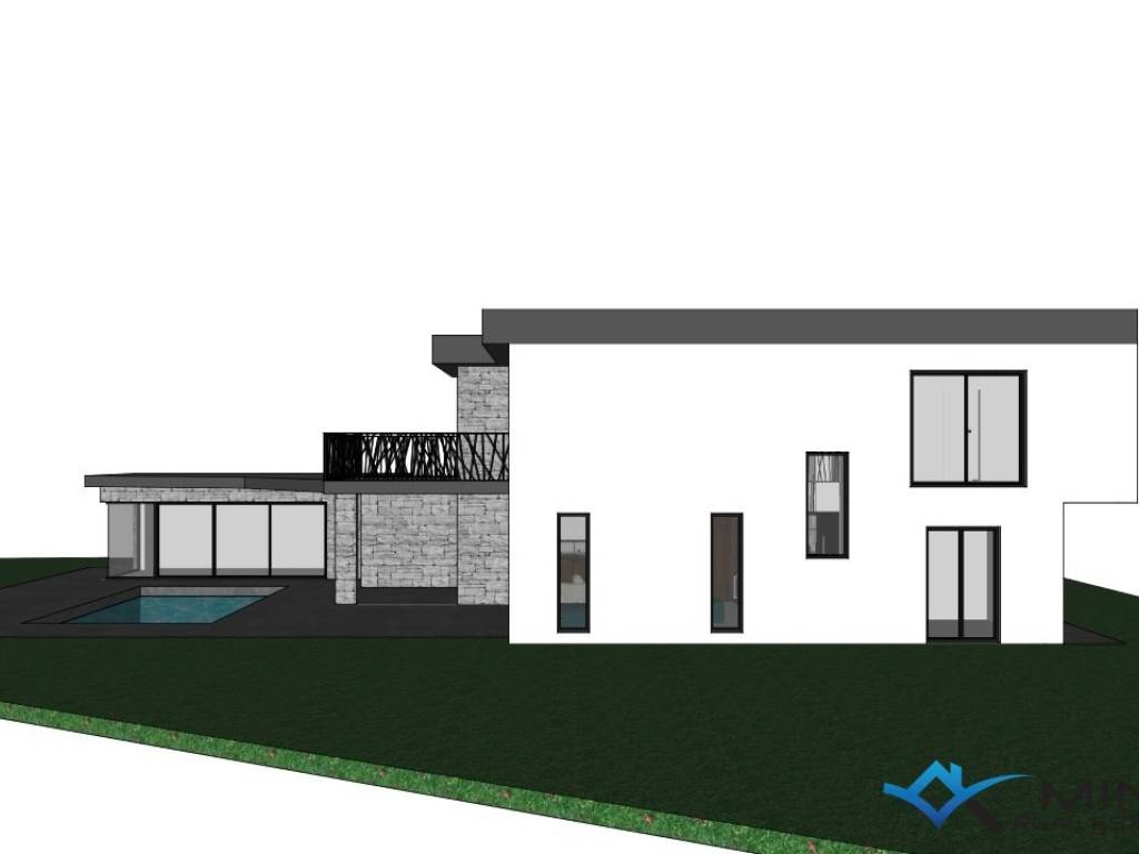A building plot is being built in a quiet location near Brtonigla. The plot has an area of 1236 m2 and a building permit has been obtained for the construction of a villa with a 200 m2 swimming pool. It extends over two floors, ground floor and first floor. The ground floor will have a hallway, living room with kitchen, dining room and pantry, study, toilet and storage room and an outdoor covered terrace from where you can reach the summer kitchen, toilet and storage room. On the first floor there are three bedrooms with two bathrooms and an uncovered terrace. The distance from the center of Brtonigla is 2 km, and the distance from the sea and the beautifully landscaped beach is 7 km.