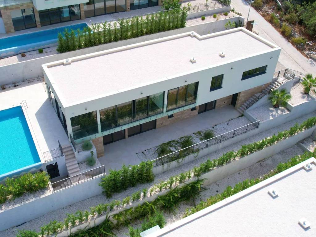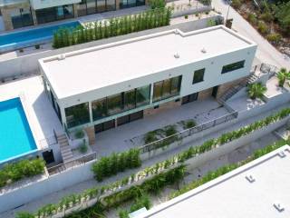 There are 3 spacious bedrooms and 3 exclusive bathrooms located on the ground floor, and each of them has direct access to the sunny bottom terrace. On the upper floor, you will find another bedroom and bathroom, as well as the living and dining room. This richly designed, glazed on either side living-dining section with a total area of 63 sq.m., along with the open kitchen, leave no doubt regarding villas exclusive style. The extensive windows fronts provide you with a beautiful view of the azure sea, which creates a perfect atmosphere for a cold drink while relaxing and enjoying that wonderful scenery.