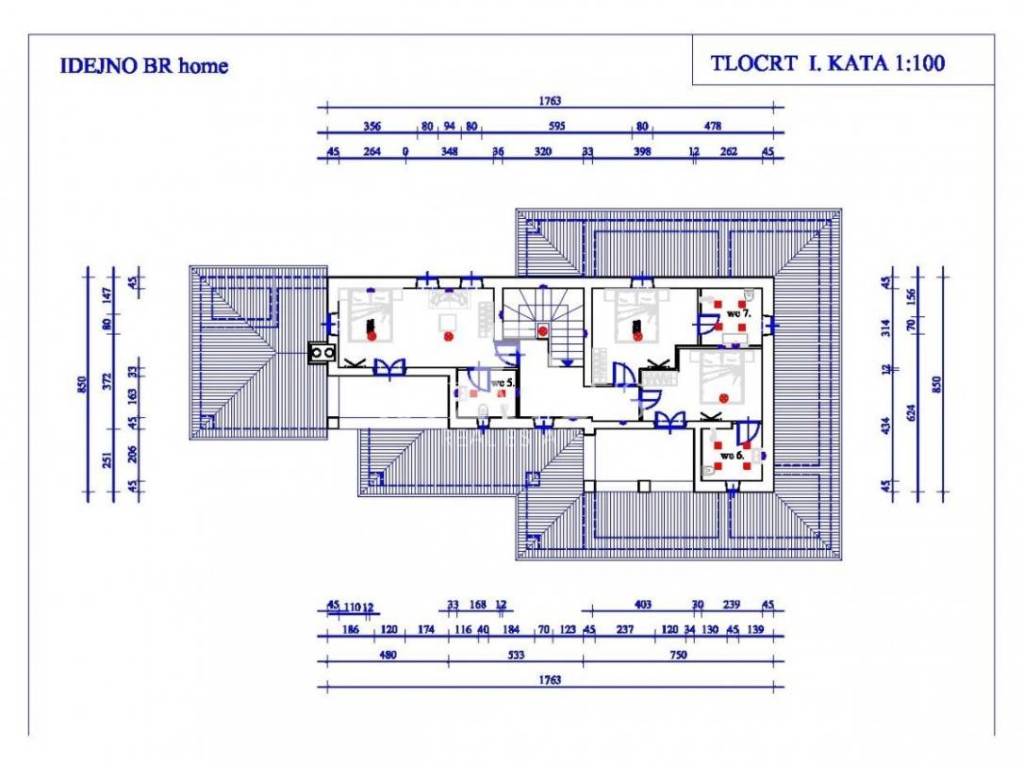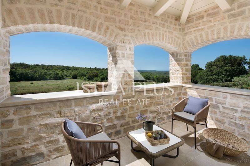 Upstairs are three double bedrooms with bathrooms and double beds. Two bedrooms have access to terraces with a beautiful view of the greenery and the sea and Rovinj in the distance.