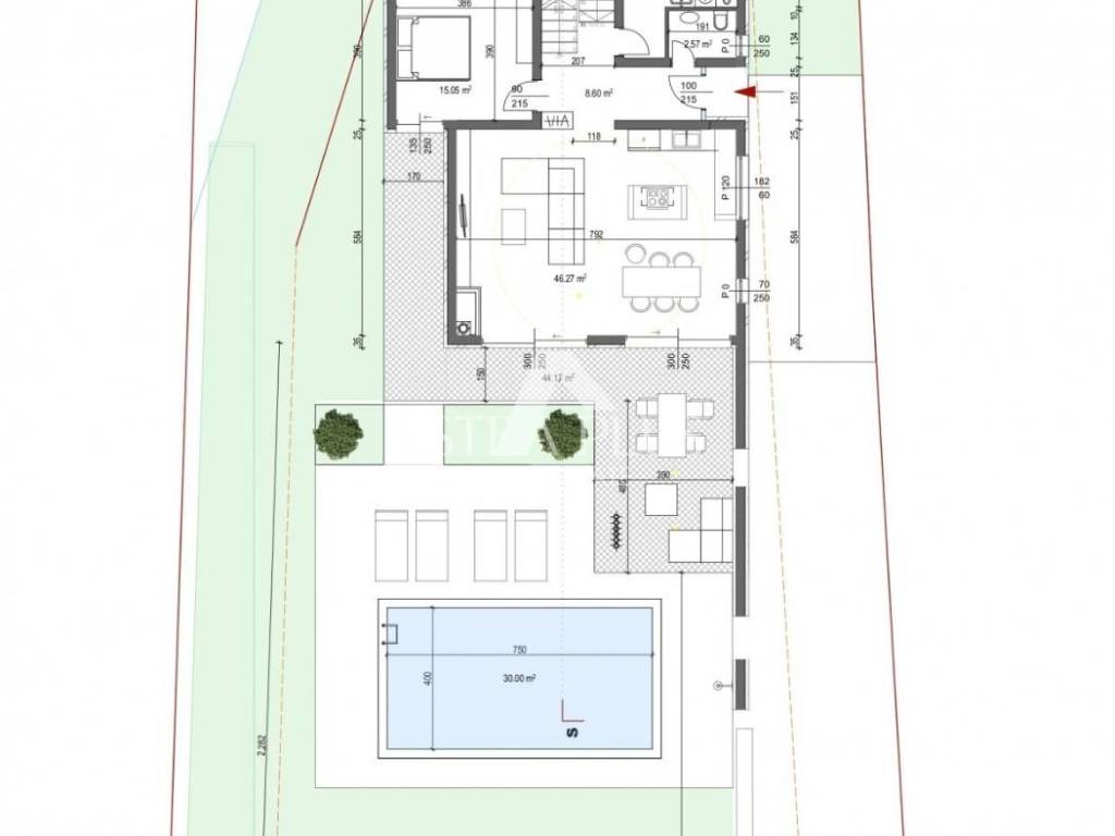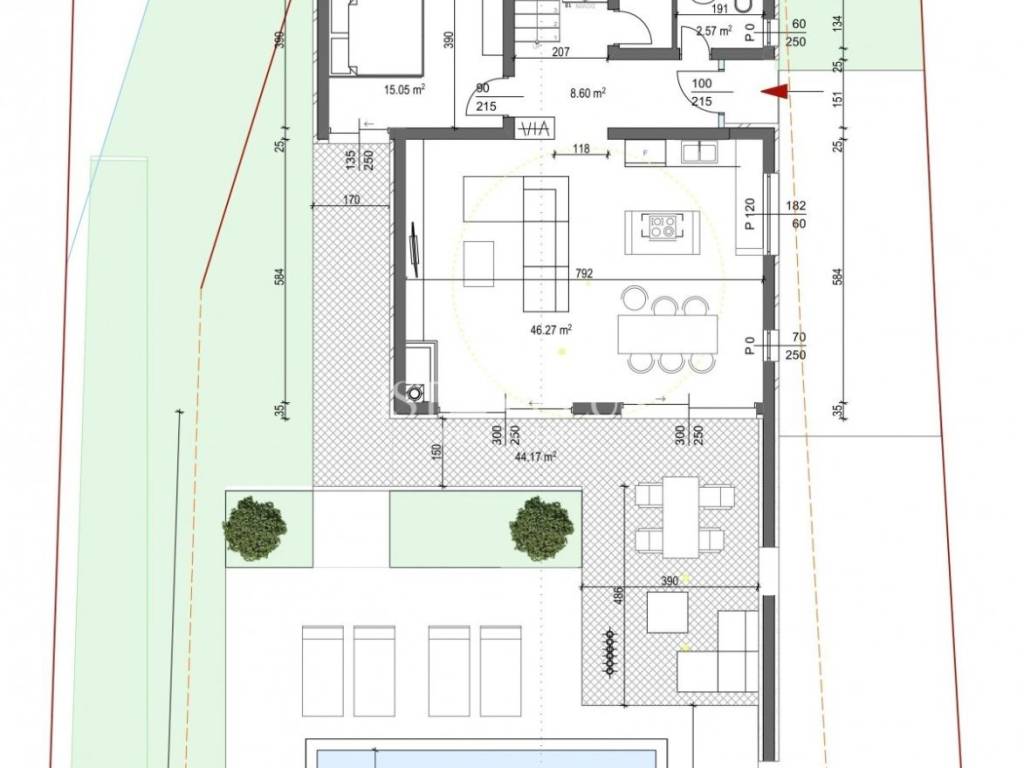 below heated pool 30m2, sun deck and outdoor shower.