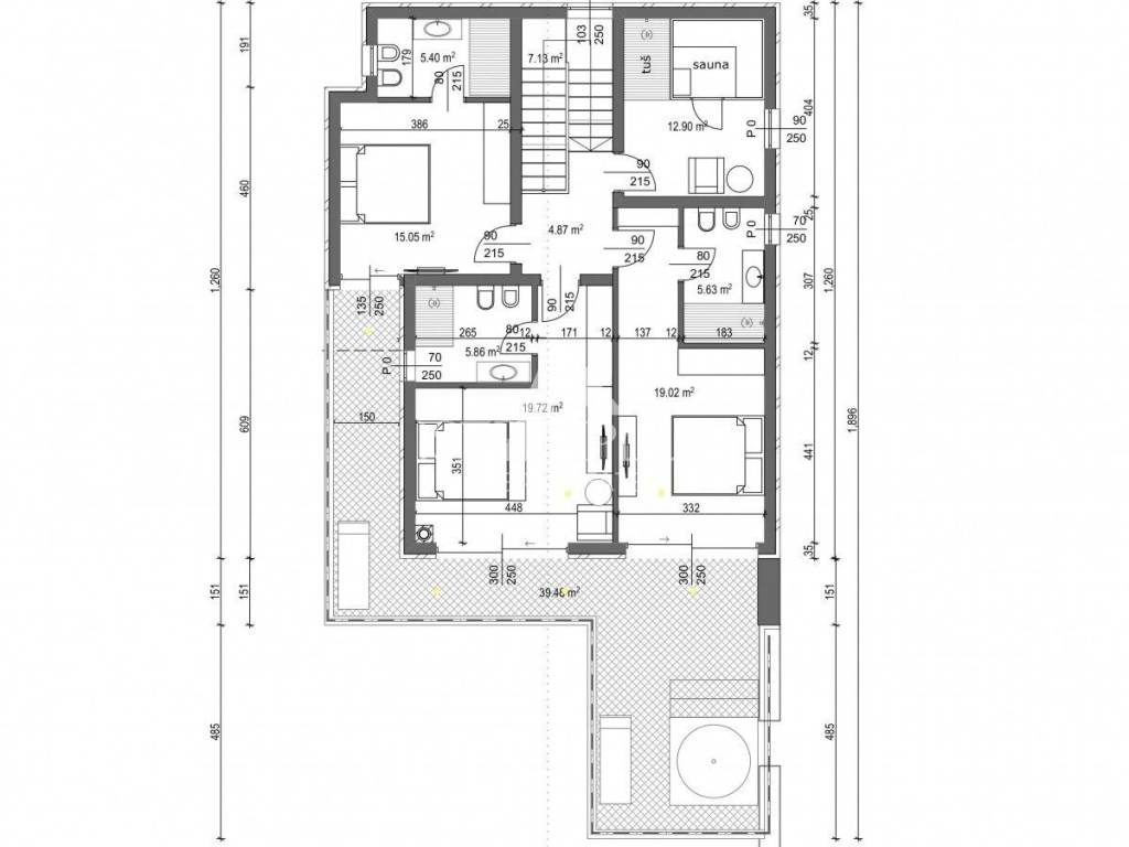 The staircase leads to the first floor where there is an entrance hall, wellness room with shower and a sauna, three bedrooms with private bathrooms and all three have access to the terrace where there are installations with jacuzzi.