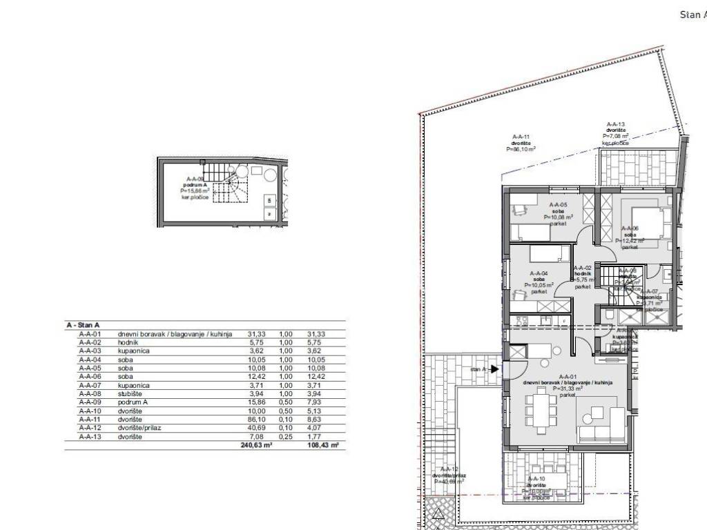 S19 If you are looking for a quality new building near the sea and Poreč, this is the ideal property for you! Two houses with four residential units are being built in the attractive Poreč settlement. While the apartments on the ground floor will have a yard, the apartments on the first floor will have beautiful roof terraces with a view of the sea. S527 APARTMENT A on the ground floor of the building - the area of the apartment is 88.83 m2, which includes a basement of 7.93 m2 and approx. 144m2 yard It consists of: hallway, living room, dining room and kitchen with access to the yard, two bedrooms with bathroom on the hallway, master bedroom with its own bathroom and access to the yard. Stairs from the hallway lead to the basement. Planned completion of construction in 05/2024