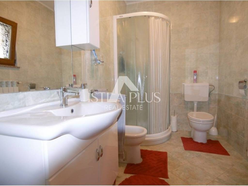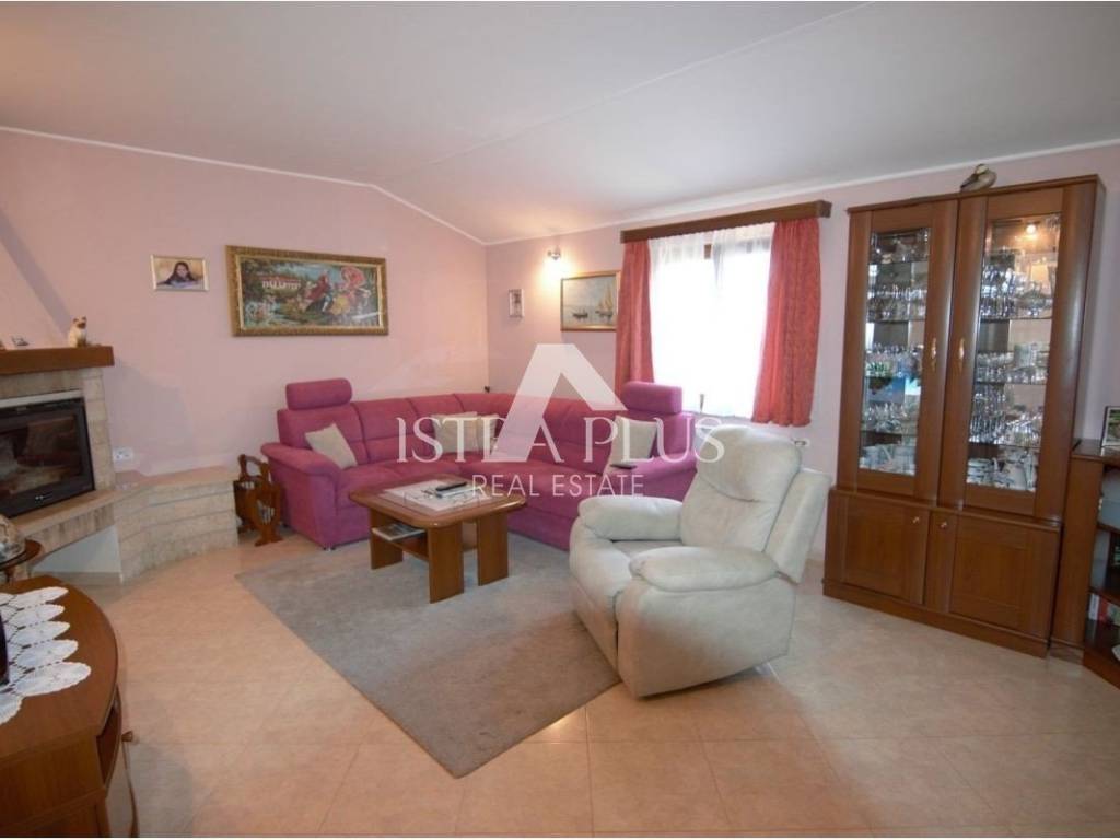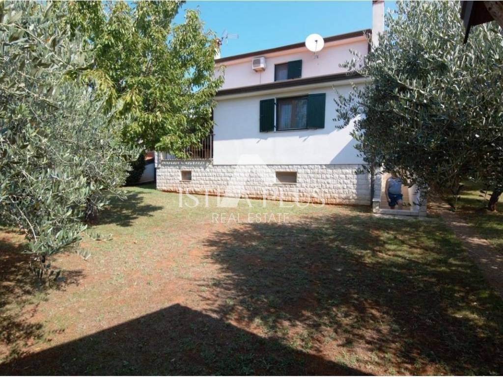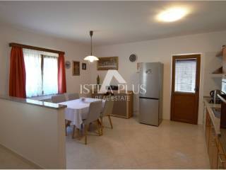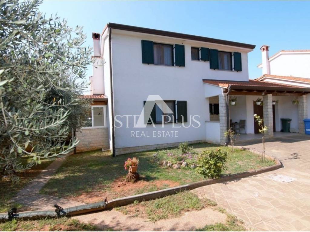 K107 A semi-detached house with a garage is for sale near Poreč and the sea. The house consists on the ground floor of a hallway, kitchen with dining room and living room, bathroom, pantry, garage and two covered terraces. Internal stairs lead us to the first floor, which consists of an entrance hall two bedrooms and bathrooms. There is a cellar in the basement. The house has central heating and air conditioning. Olive trees and herbs are planted in the yard.