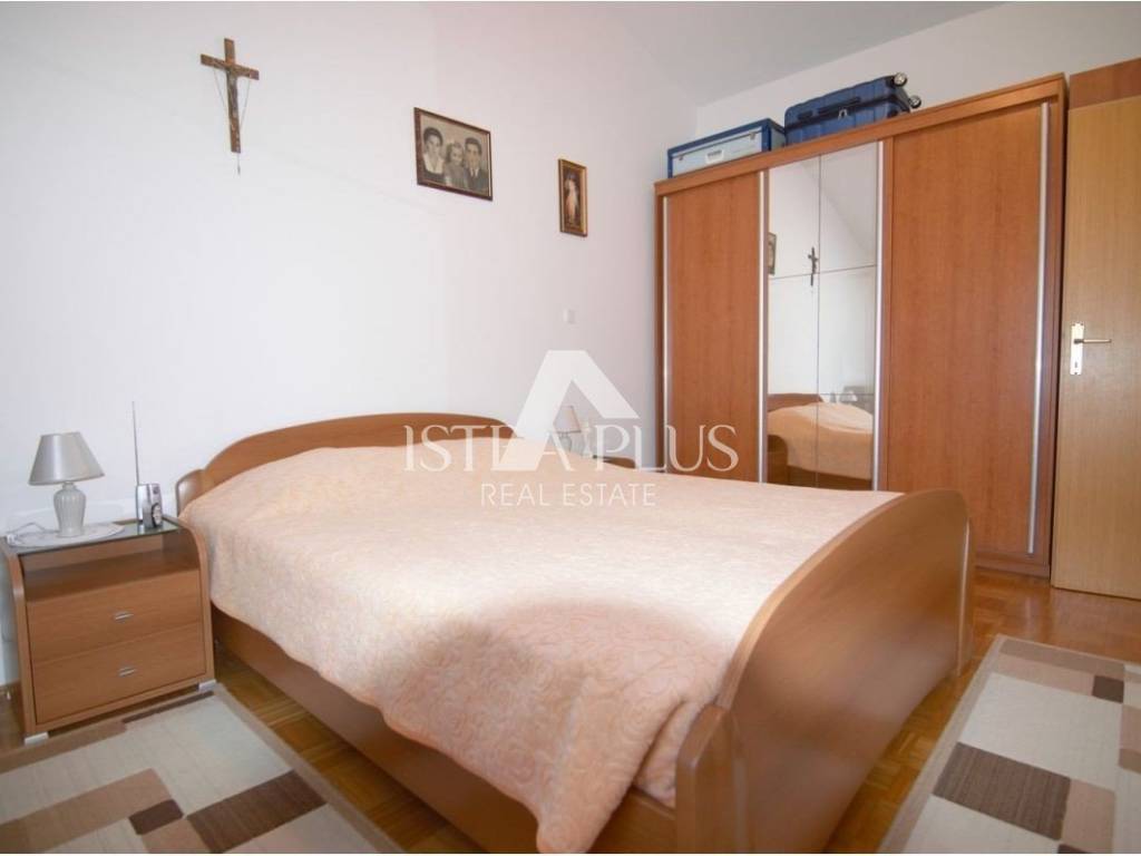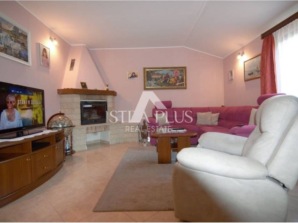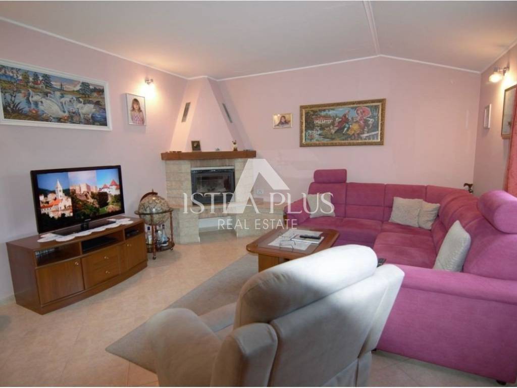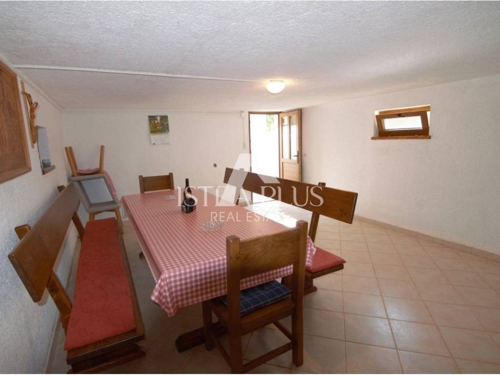 K107 A semi-detached house with a garage is for sale near Poreč and the sea. The house consists on the ground floor of a hallway, kitchen with dining room and living room, bathroom, pantry, garage and two covered terraces. Internal stairs lead us to the first floor, which consists of an entrance hall two bedrooms and bathrooms. There is a cellar in the basement. The house has central heating and air conditioning. Olive trees and herbs are planted in the yard.