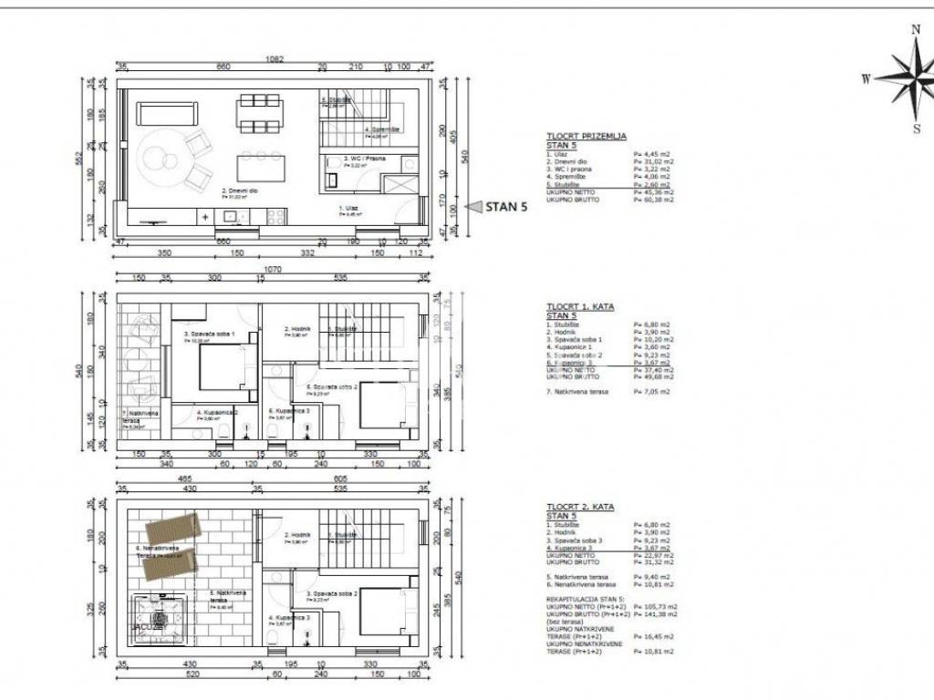 The house extends over three floors and has a total net area of 122.18m2 with covered terraces.