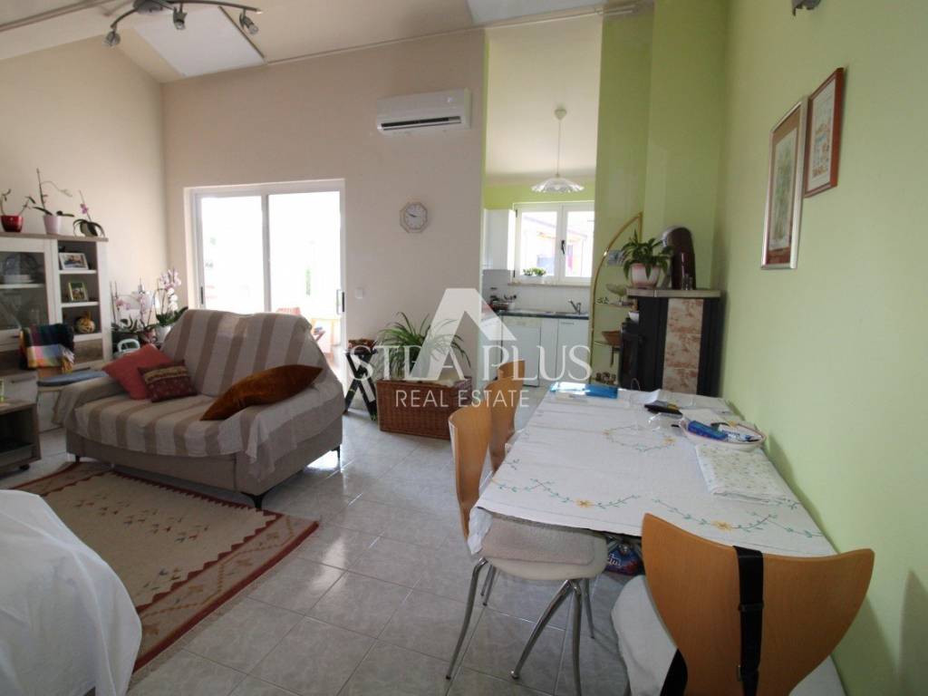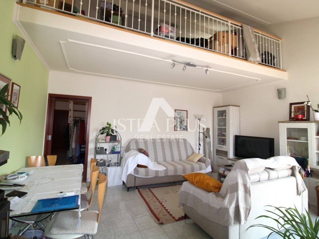 The apartment of total 140m2 consists of an entrance hall, storage room/laundry room, bathroom, 2 bedrooms, each with its own exit to a shared terrace/loggia, kitchen, dining room and living room with access to another terrace/loggia, and a staircase leads to the gallery, which consists of two space where 4 to 6 beds can be placed or used for other purposes.