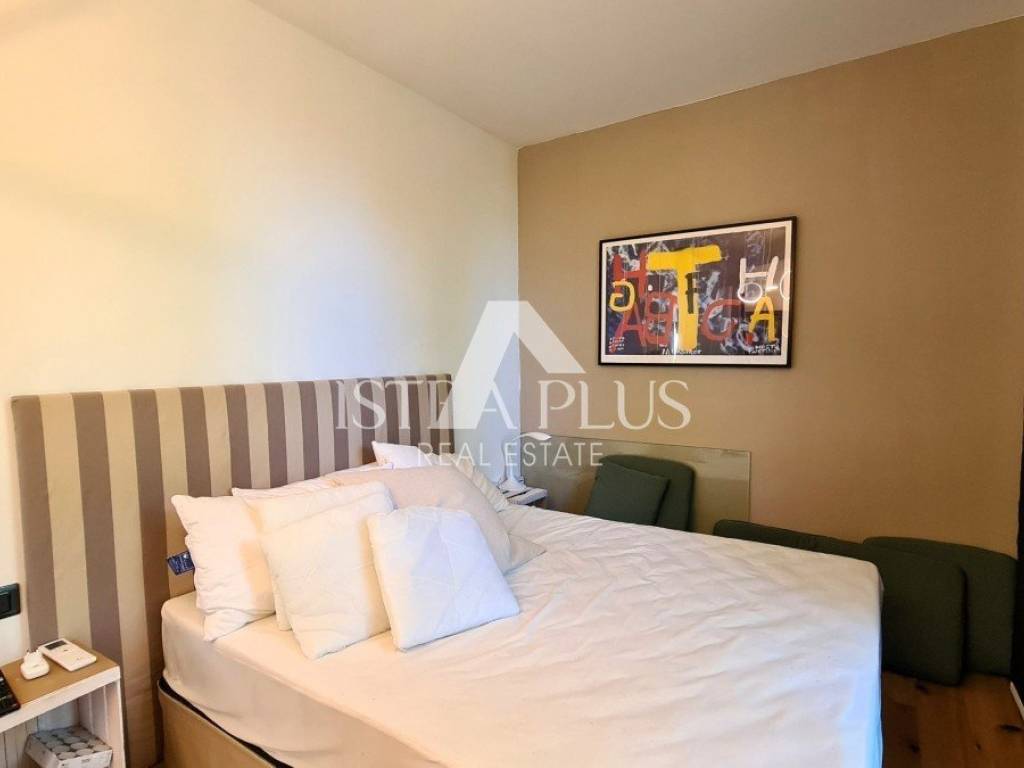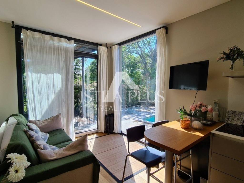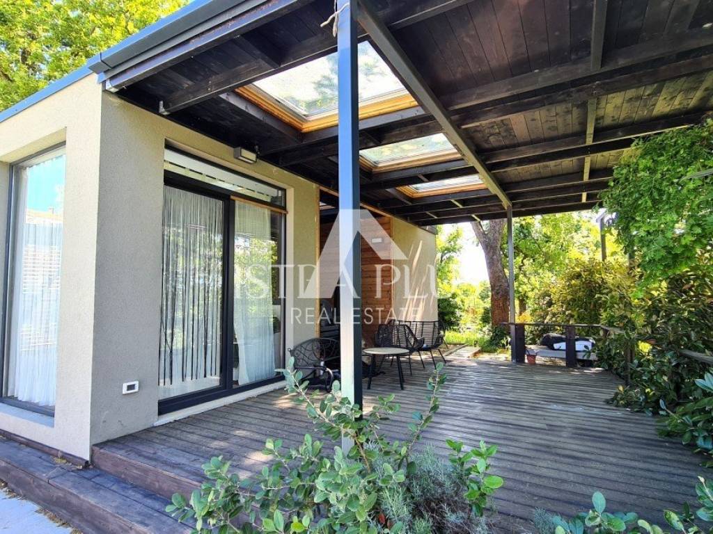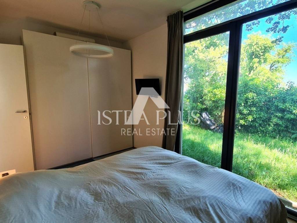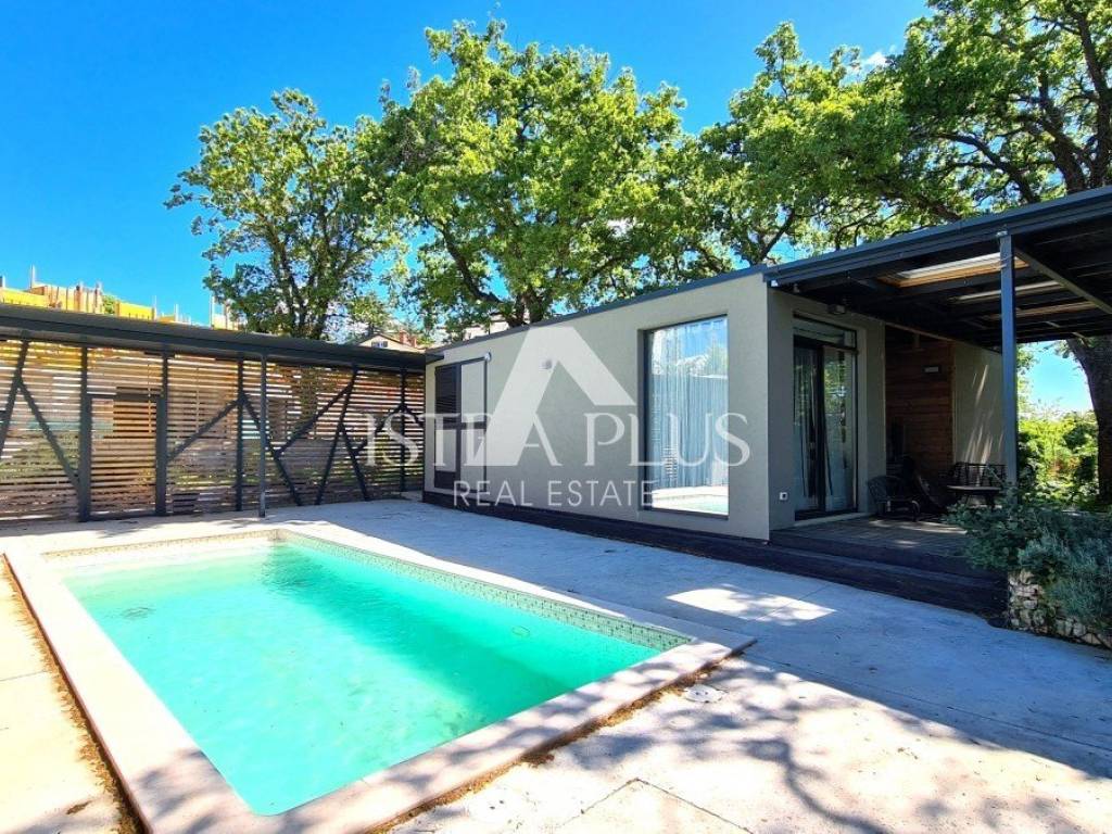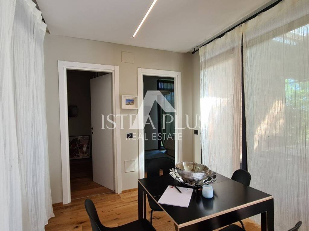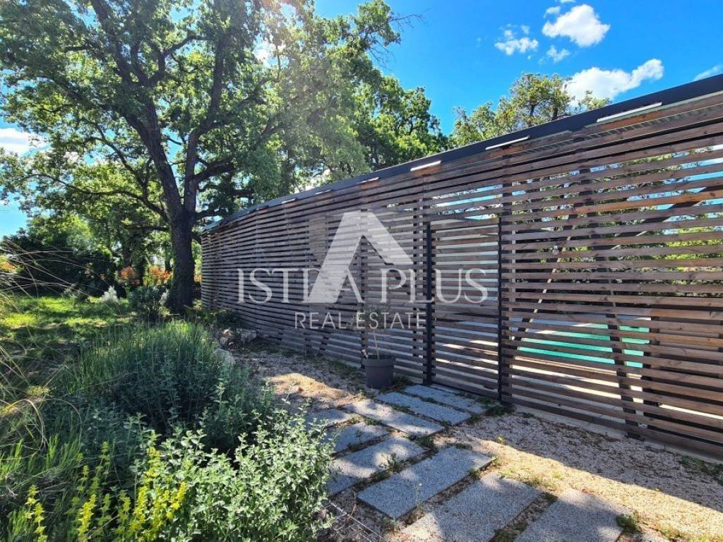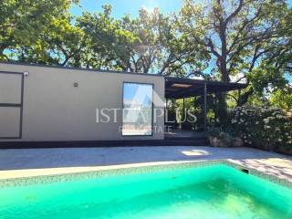 Ground floor modern design with a total area of 100 m2, 12 km from Poreč and the sea. The house consists of a covered entrance, a living room with a kitchen and dining room, two bedrooms, a bathroom and a large covered terrace. The house is located on a fenced and landscaped plot of 500 m2 with a 24 m2 swimming pool, while 2 parking spaces are outside the fenced yard. This house is an ideal solution to the housing issue or as an investment for the purpose of tourist rental.