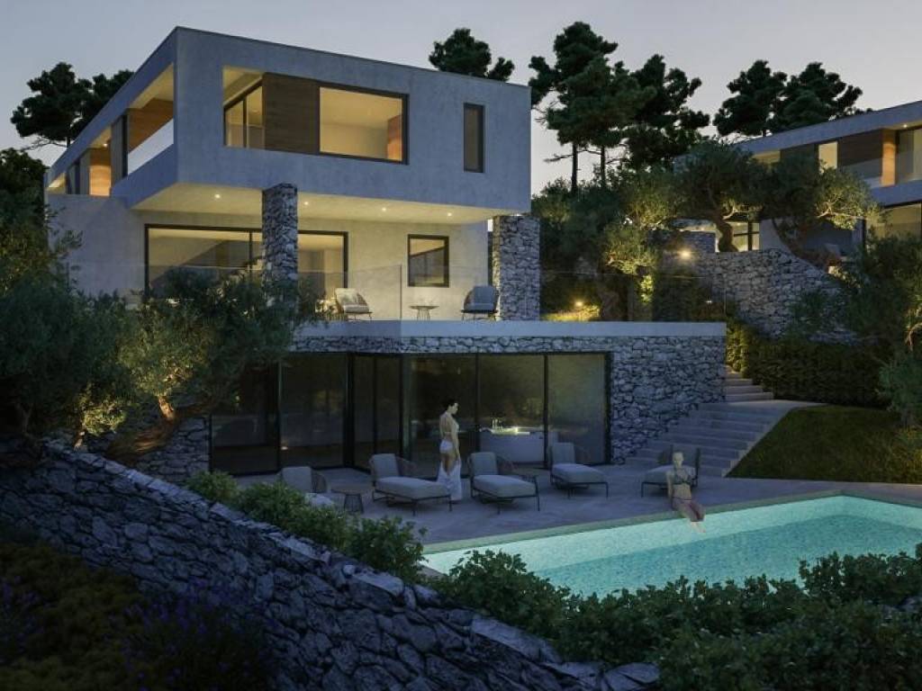 Situated on a peaceful hillside in Vodice, this modern 396m villa with a pool, wellness area, and stunning sea and island views .