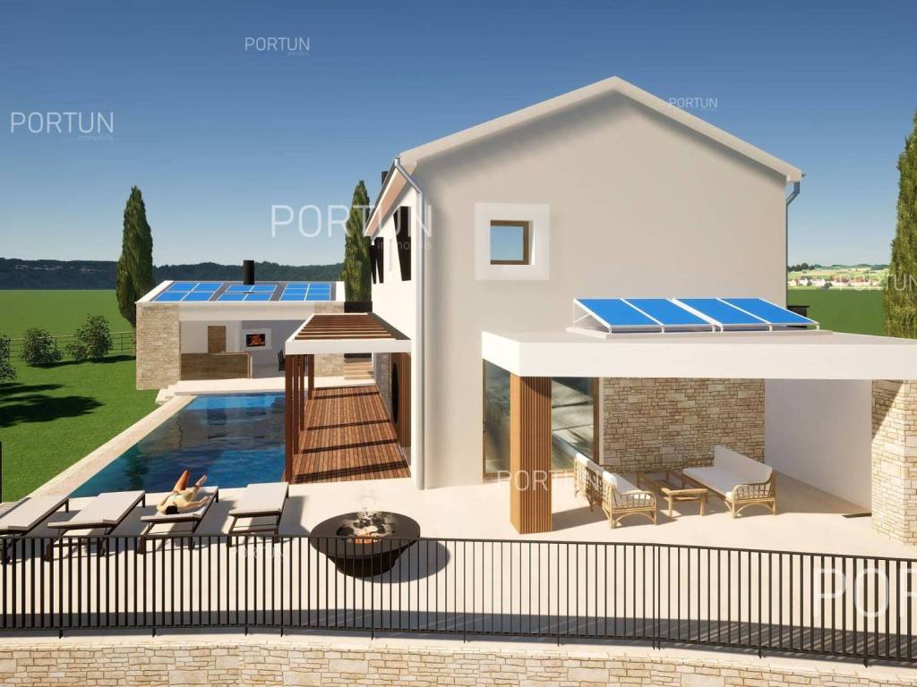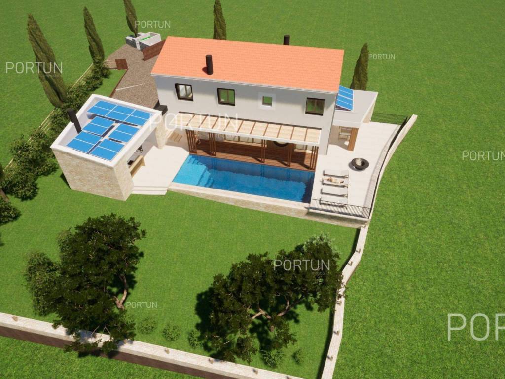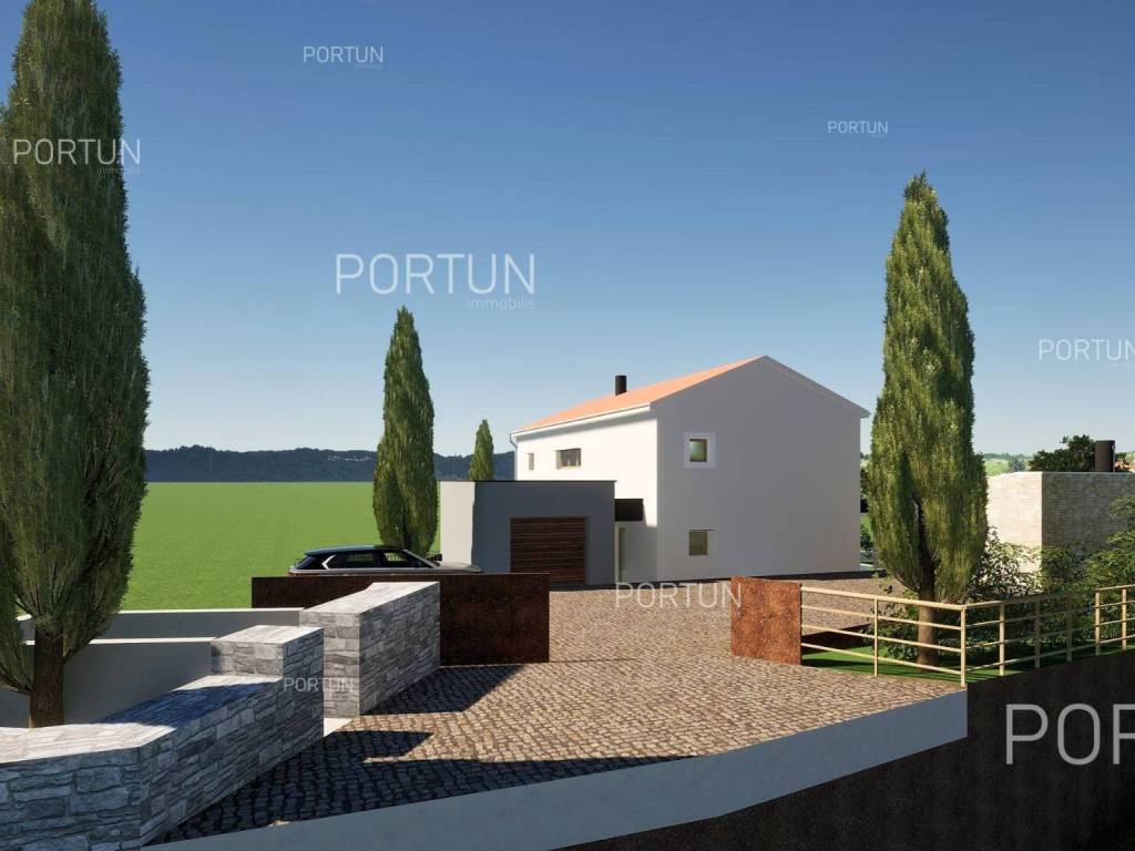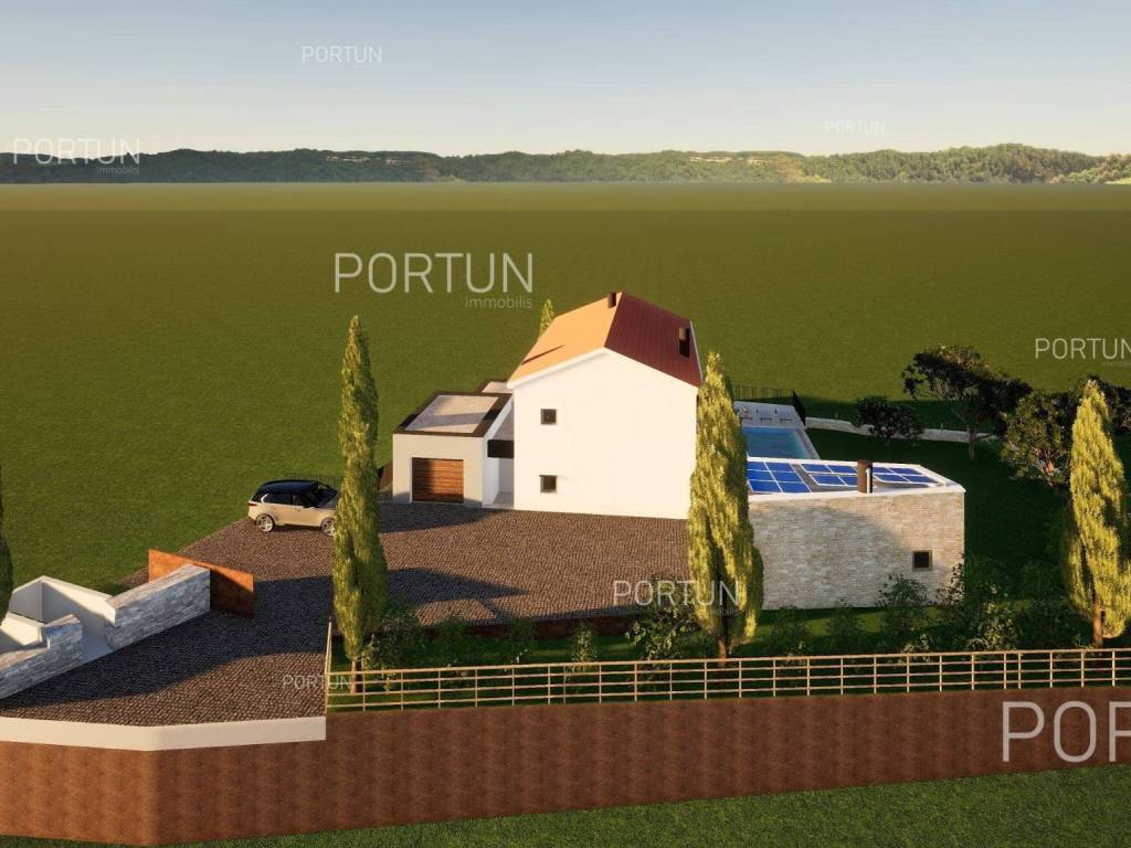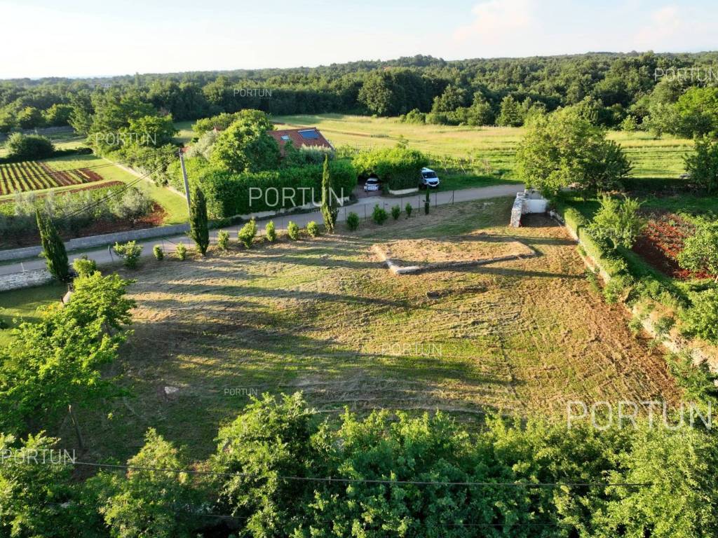 In the picturesque village of Otočani, between Svetvinčenat, Kanfanar and Žminj, a building plot of 1,200 m2 is for sale. Located on a gentle southwest-facing slope, the land offers a view of greenery and old stone houses. Infrastructure is provided, and privacy is guaranteed by greenery and stone walls.This property is a building plot in a small Istrian village. It is enclosed by stone walls, providing additional safety and privacy. An ideal opportunity for building a family home or a holiday villa in authentic Istrian surroundings.The land is situated on a gentle slope facing southwest. From this position there is an open view of the surrounding greenery and stone houses in the distanceperfect for those seeking peace and a natural environment.The land is enclosed with stone walls on three sides, while the borders are lined with laurel bushes, shrubs, and native trees. Two mulberry trees provide natural summer shade and rustic charm.The land is equipped with an electric connection of 17.25 kW, with a meter installed in the wall facing the road. A water connection is also available, with the meter in a roadside shaft. The entrance area is already formed with a space for waste and composting.It is only 3 km from Kanfanar, 4 km from Svetvinčenat and 19 km from Rovinj. Beaches are about 20 km away. Nearby are shops, restaurants, a school, kindergarten and a health center. Pula Airport is 33 km away, and the motorway is easily accessible.For more information or to schedule a viewing, feel free to contact us. This parcel is waiting for its new ownermaybe that's you!Distances from the propertyKanfanar | 3 kmSea | Beach 20 km Services | Food store 3,5 km - Cafe or bar 3,5 km - Inn or restaurant 4 km - Elementary School 4 km - Kindergarten 4 km - Health center 20 km Nearby towns | Svetvinčenat 4 km - Rovinj 19 km Traffic | Highway entry Kanfanar 7 km - Pula Airport 33 km Attractions | Abandoned medieval town Dvigrad 7 km - Cave Feštinsko Kraljevstvo 10 km Project with PermitThe land comes with a main project for the construction of a highly energy-efficient house with a swimming pool, four bedrooms and four bathrooms. A secondary building with a summer kitchen and parking for several cars is also planned next to the main house.From the living room and dining area, there is access to a large covered terrace with a decking floor extending along the pool. The kitchen opens onto another covered terrace with a planned outdoor living area, perfect for summer gatherings.Lush greenery surrounding the property ensures complete privacy and blends harmoniously with nature. From the pool terrace, steps lead down to a green garden with plenty of space for relaxation in the shade of two mulberry trees.All necessary documentation for construction is prepared, allowing for an immediate start.Services Connection to the power grid | Three-phase current | 17,25 kW Connection to the water supply network Paved public access road | Public lightingLand statusThe land is located entirely within the boundaries of the construction area. DocumentationExtracted documents | Building permit - Main projectArea calculationThe land area amounts to 1.200 square meters. Data source = Cadastre data