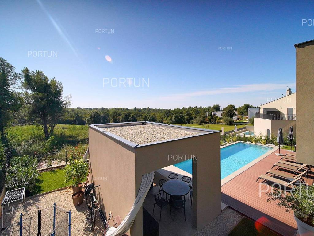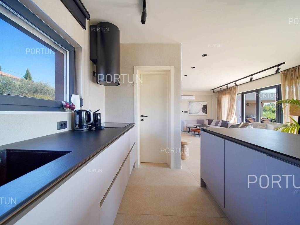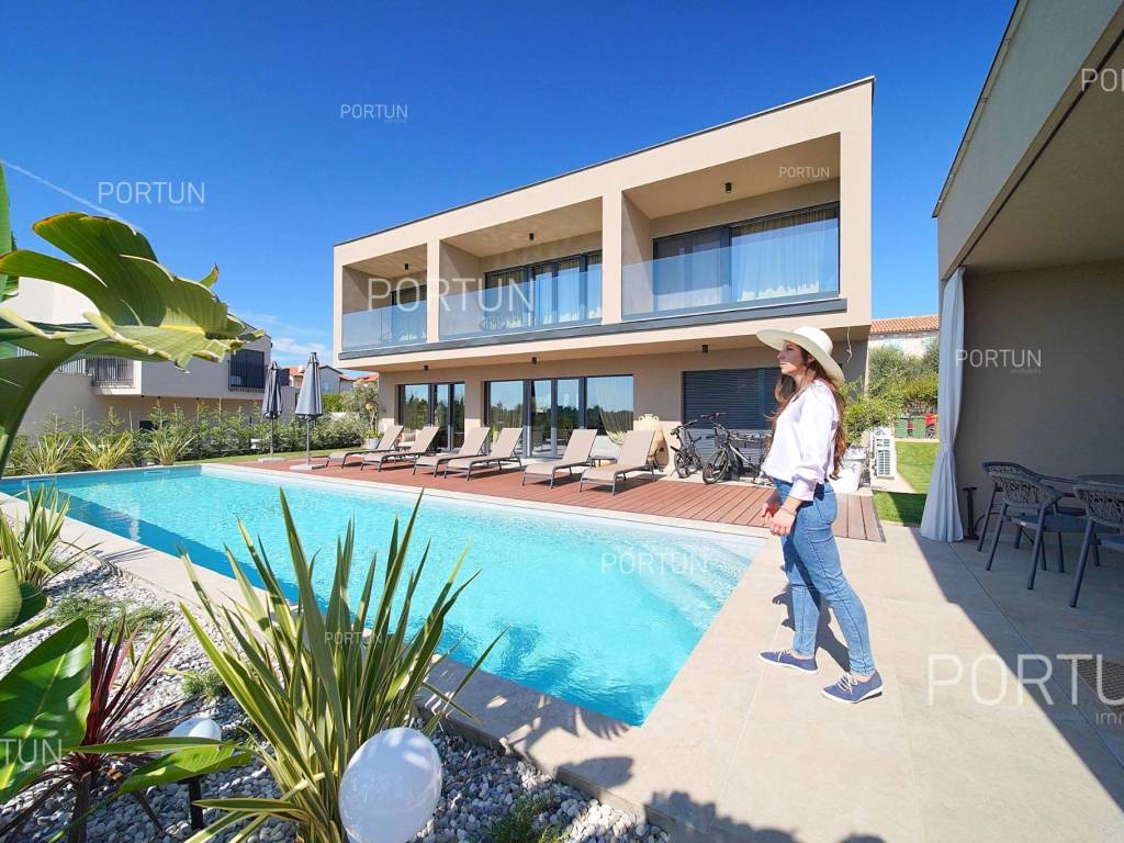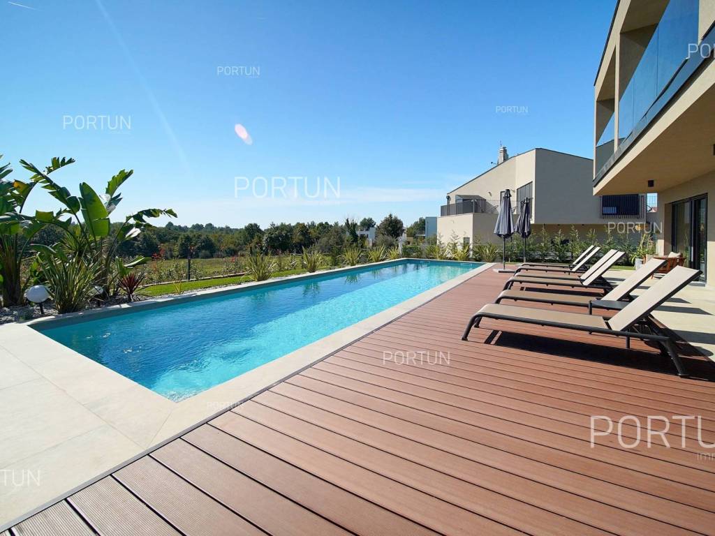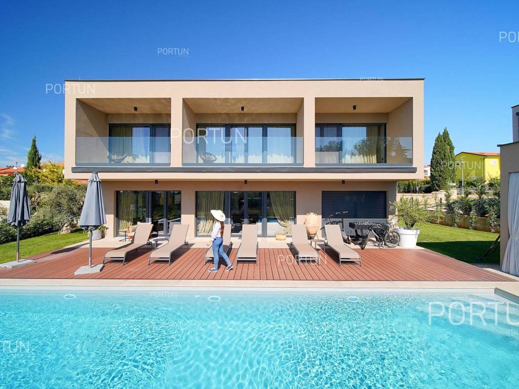The modern and airy villa on the west coast of Istria, near Poreč, in addition to its attractive design, offers a view of greenery and a large swimming pool, and is less than two kilometers from the sea. Designed with modern aesthetics in mind, the villa boasts a sleek and contemporary architectural style, characterized by its clean lines and minimalistic design. As you approach the villa, you're immediately captivated by the striking glass openings that adorn the facade and not only flood the interior spaces with natural light, creating a seamless connection between the indoor and outdoor areas. One of the standout features of this villa is its long swimming pool, which runs parallel to the villa, offering a luxurious spot for a refreshing dip. The pool stretches out invitingly, reflecting the sun's rays during the day and exuding a tranquil ambiance in the evening.Step inside, and you'll discover a thoughtfully designed layout that perfectly balances comfort and style. The villa comprises three bedrooms, each equipped with its own ensuite bathroom and terrace. These private retreats offer a sanctuary of relaxation, where you can enjoy panoramic views from the comfort of your bed. In addition to the three bedrooms, there is an extra bedroom that can serve as a guest room or a versatile space to suit your needs. The open concept living room seamlessly connects with the kitchen, creating a spacious and inviting atmosphere. This central hub of the villa is designed to foster a sense of togetherness, allowing for effortless interaction between family and friends. The south orientation ensures an abundance of natural light throughout the day, further enhancing the airy and bright ambiance.Venturing outside, you'll find a beautifully landscaped outdoor area complete with a spacious sundeck, perfect for lounging under the Mediterranean sun. Adjacent to the sundeck is a luxurious jacuzzi, offering a blissful oasis where you can unwind and enjoy the magnificent surroundings. For those who appreciate culinary delights, the villa boasts a summer kitchen in the outdoor area. Equipped with state-of-the-art appliances and a dining area, it presents an ideal setting for hosting al fresco meals and entertaining guests. In summary, this villa near Poreč embodies modern luxury and sophistication. With its captivating glass openings, long swimming pool, well-appointed bedrooms, outdoor oasis, and open living spaces, it offers a truly idyllic retreat for those seeking a refined coastal lifestyle.LocationThe lush Mediterranean greenery and forests merge with the blue seas to make a magical landscape of the Istrian oasis, which is perfect for lovers of simple and fulfilling life, but also for all those who like to combine modern living with natural ambient. On the western coast of the Istrian peninsula, there is a city with a thousand-year history, Poreč with the charming old town with its mosaics and sights under the auspices of UNESCO, the tradition of wine and olives cultivation, local varieties and groceries, quiet coves, long coastline and green interior riches make it an ideal place to live. Sea Beach 1,6 km Services Food store 350 m Cafe or bar 1000 m Inn or restaurant 1,1 km Elementary School 1,7 km Kindergarten 1,5 km Health center 7 km Pharmacy 1,6 km Marina 1,6 km Sports and fun Soccer field 1000 m Basketball court 1,7 km Cycling and hiking trail Parenzana 9,4 km Adventure park 2,3 km Traffic Nearest highway entry 10,5 km Portorož Airport 30 km Attractions Geomorphological nature monument Baredine Pit 6,2 km About the propertyThe estate which extends to 601 square meters comprises: Two storey house 4 Bedrooms 3 Bathrooms 2 Floors 153,91 m2Auxiliary building 1 Floor approx. 25,00 m2Swimming pool approx. 40,00 m2LayoutThe house with a classic layout, with 179 square meters, is spread over two floors, namely the ground floor and the 1st floor. Ground floor The entrance to the house is on the ground floor. This 101,57 m2 floor includes a living room with kitchen and dining room 43,08 m2, one bedroom, a covered terrace 20,16 m2, an covered entrance and a laundry. First floor Internal straight stairs lead to the upper level, that is to the 1st floor. This 77,34 m2 level features three bedrooms with en suite bathrooms, three covered terraces, a corridor and a staircase. The two key rooms in this house are The living room with kitchen and dining room Ground floor 43,08 m2 South facing A view of the greenery Exit to the covered terrace Spacious living room Large glass walls Island kitchen Modern design Table 6 ChairsThe bedroom First floor 19,18 m2 South facing A view of the greenery Exit to the covered terrace Modern bathroom with shower Double bed LightingExtras Parking for two carsAbout the houseThe entrance to the house is on the ground floor level, from the north side, and vertical communication takes place via an internal staircase. The basic architectural characteristics of this new multi-story building are: Floors Ground floor + First floor Orientation South Wooden floor structure Roof Flat roof E.P.C. Awaiting EPC Built in 2023Joinery Aluminum joinery with double glazing Aluminum entry door Classic interior doorsMultimedia Installation for TV in each bedroomHeating and cooling Underfloor heating with a heat pump Air conditioning Heat pumps Combined water boilerFlooring Top quality ceramic tilesOutdoor spaceEquipment Outdoor lighting Drip irrigationFences Hedge Concrete wallDriveway Metal door Motor drive Slide openingOutdoor pool Skimmer pool 40,00 m2 Concrete construction Pool liner: Ceramic tiles Disinfection of water with chlorine Sunbathing area Shower Beach lightingServices Connection to the power grid Connection to the water supply network Planned connection to the sewage network Paved public access roadReal estate statusThe property is located entirely within the boundaries of the construction areaDocumentationExtracted documents Geodetic situation Building permit Main projectArea calcu