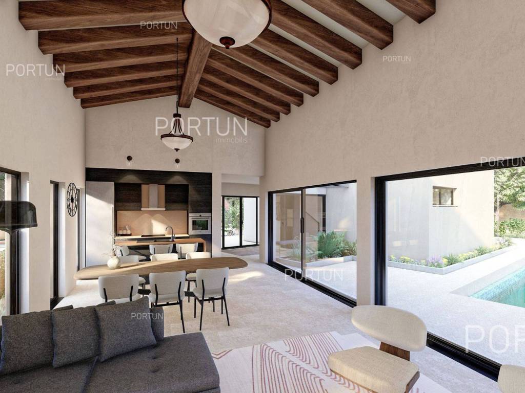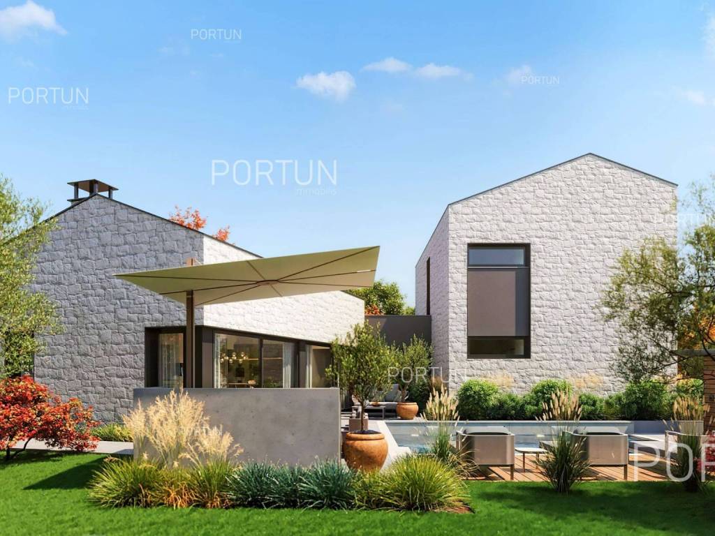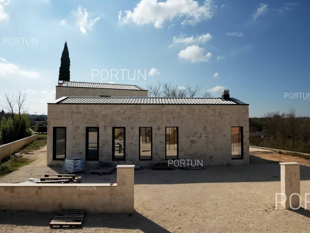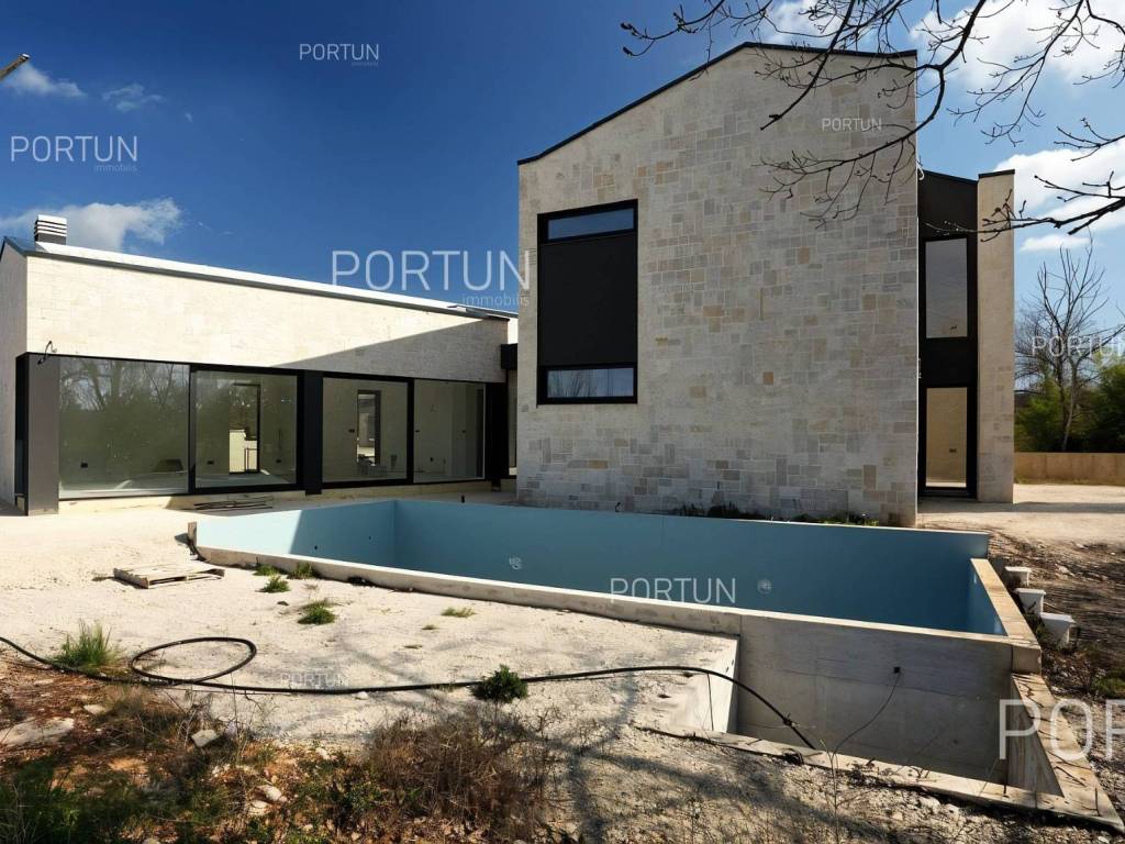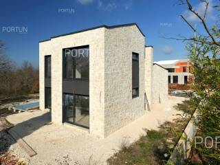 The refined contemporary holiday villa in the vicinity of Poreč offers extravagant design, lush green garden with diverse vegetation, efficient heating and cooling system, and an attractive sunbathing terrace by the pool. With four bedrooms and as many bathrooms, this extravagant villa is the perfect fit for the modern family in search of their future home in Istria. The visual solution is inspired by traditional local architecture, which in this case blends seamlessly with contemporary trends in holiday home design. In the larger house, the bedrooms are spread over two floors, totaling four, each with its own bathroom. The rooms feature modern design in warm wood tones and natural materials. On the ground floor, the larger house is connected to the smaller one, which contains an open-space living room with kitchen and dining area, as well as a technical room and laundry with a toilet. Thanks to the high ceiling with visible wooden roof structure, the living room impresses with its size and abundance of natural light. Numerous windows and a balcony allow excellent communication with the beautiful green surroundings and sunbathing terrace. It is planned that the house will be equipped with underfloor heating via a heat pump, triple carpentry, motorized blinds and solar collectors. The villa is located in a quiet location with numerous facilities nearby - restaurant 300 m, grocery store 4 km, beach 6 km and city center 6.7 km. LocationWith its cobblestone streets, old stone houses, medieval churches, endless vistas over the countryside and the sea, cute little shops, art galleries, wine bars and distinctive nature, Istria is not just a place to be, but a place to live! On the western coast of the Istrian peninsula, there is a city with a thousand-year history, Poreč with the charming old town with its mosaics and sights under the auspices of UNESCO, the tradition of wine and olives cultivation, local varieties and groceries, quiet coves, long coastline and green interior riches make it an ideal place to live. Peaceful and tranquil environment on the western part of the Istrian peninsula, not far from Poreč, where the house is positioned, is rich in various amenities:Sea | Beach 7 km Services | Food store 4 km - Cafe or bar 6 km - Inn or restaurant 300 m - Elementary School 2 km - Health center 6 km Sports and fun | Mini soccer field 250 m - Special forest vegetation reserve "Kontija" 19 km Nearby towns | Tar 10 km - Vrsar 14 km Traffic | Highway entry Baderna 12 km - Pula Airport 60 km Attractions | Geomorphological nature monument Baredine Pit 6 km LayoutThe bright house, with 168 square meters, is spread over two floors, namely the ground floor and the 1st floor. Ground floor | The entrance to the house is on the ground floor. This 117,43 m2 floor includes a living room with kitchen and dining room, two bedrooms with en suite bathrooms, a lavatory, a corridor, an covered entrance, a staircase and a laundry. First floor | Internal turning stairs lead to the upper level, that is to the 1st floor. This 50,45 m2 level features two bedrooms with en suite bathrooms and a corridor. The two key rooms in this house are The living room with kitchen and dining room | Ground floor - 44,00 m2 - Southwest facing - Living room with fireplace - Visible wooden beams contribute to the warm atmosphere - High ceilings - Large glass walls - Exit to the yard - Corner sofa set - Coffee table - TV - Island kitchen - Modern designThe bedroom | Ground floor - 19,25 m2 - South facing - Exit to the terrace - Wardrobe closet - Modern bathroom with shower - Double bed - Dressing tableAbout the houseThe entrance to the house is on the ground floor level, from the northeast side, and vertical communication takes place via an internal staircase. The basic architectural characteristics of this well-maintained two-story building are: Floors | Ground floor + First floor Orientation | Southwest External walls | Stone wall + Insulation + Block brick wall 25 cm Concrete slab floors Roof | Pitched roof covered with clay tiles Parking canopy for two cars Construction began in 2023/10 | Planned completion of construction in 2024/8Outdoor pool Skimmer pool 57,00 m2 | Concrete construction - Pool liner: Ceramic tiles - Salt water (disinfection by chlorine electrolysis) - Shallow part - Waterfall - Water heating - LED lighting Sunbathing area paved with stone | Outdoor shower Services Connection to the power grid Connection to the water supply network Unpaved public access road | Distance to the paved road 110 mReal estate statusThe land is located entirely within the boundaries of the construction area. DocumentationExtracted documents | Building permit - Main project