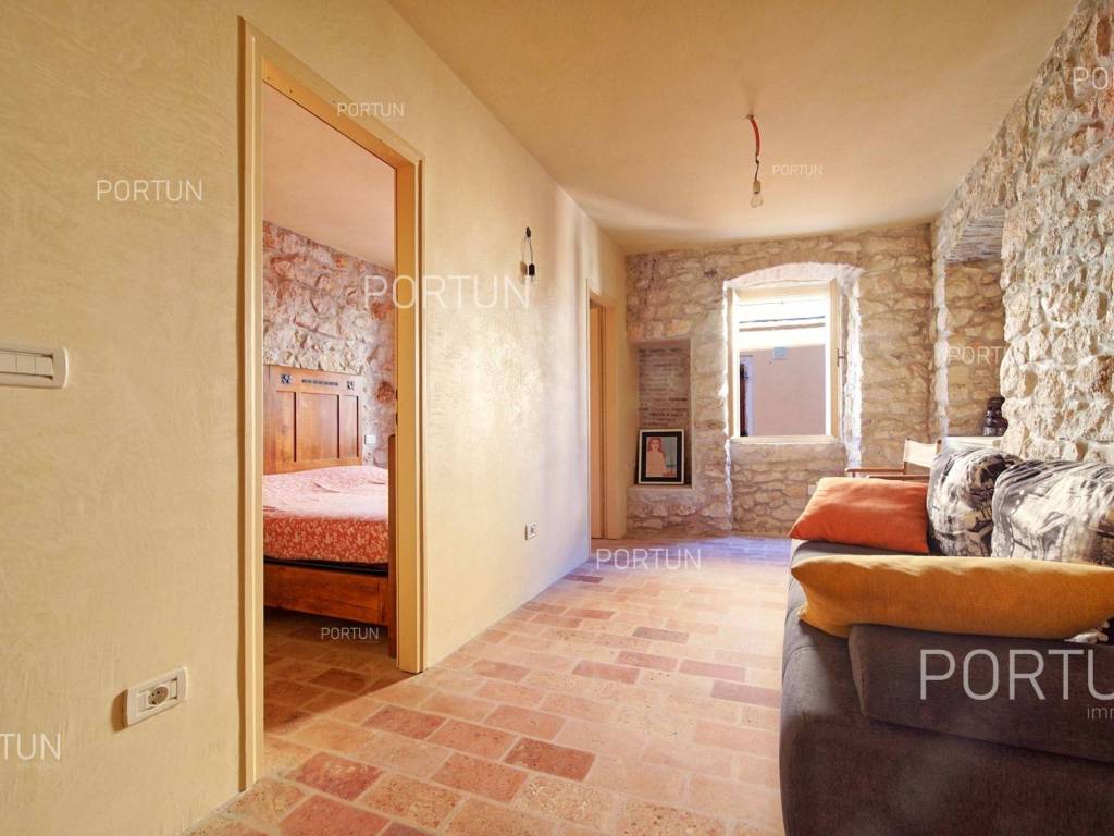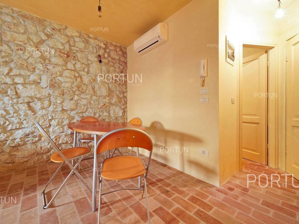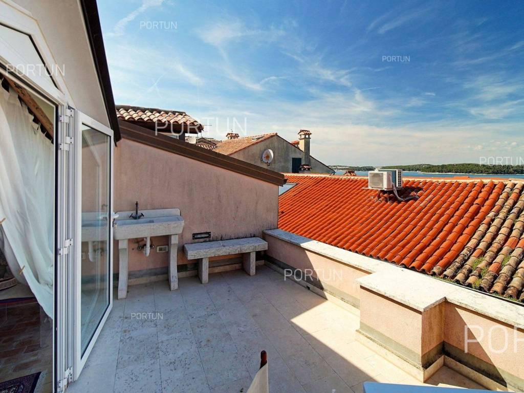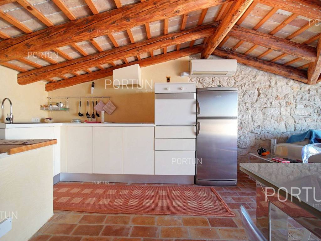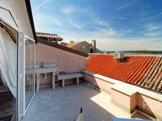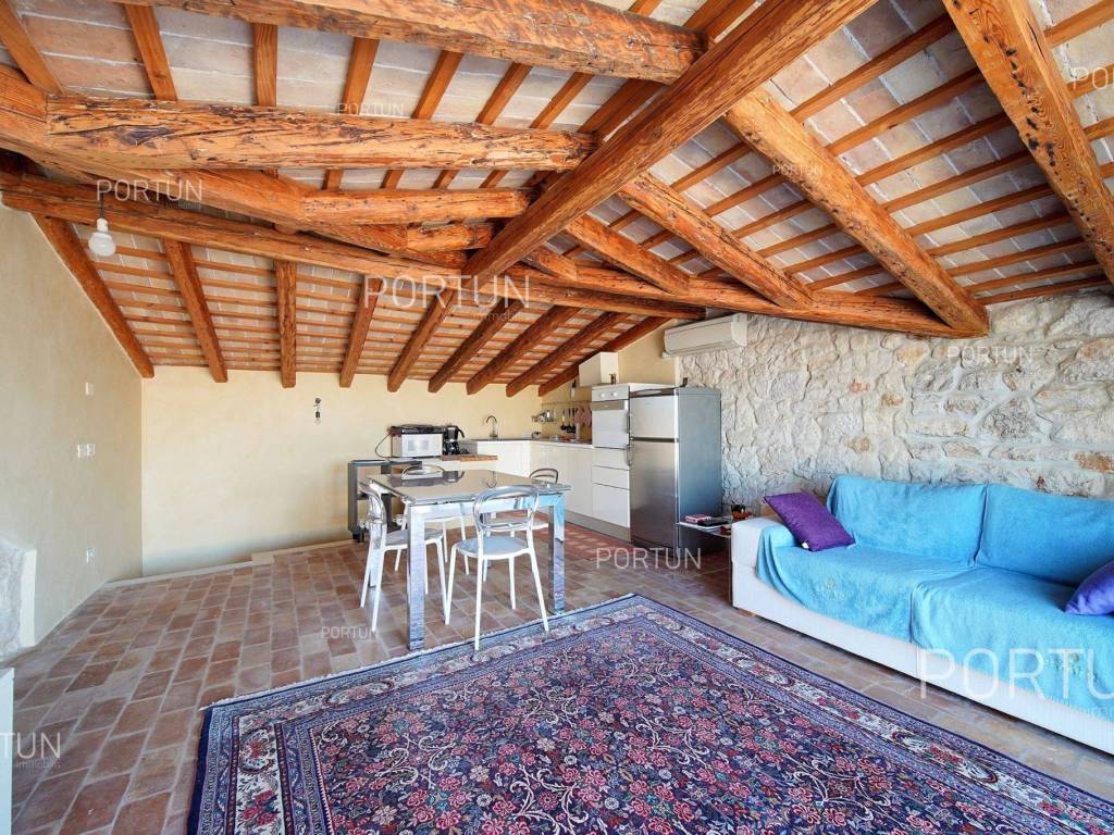 In the heart of picturesque Rovinj, a thoroughly renovated stone house is for sale, which includes two apartments, office space and a terrace with a view of the sea. The interior is full of warm, natural materials that give the house a traditional and rustic look. Especially attractive is the top floor with stunning wooden roof beams and stone walls, where the main living room and terrace with a sea view are located. The spacious house, with an area of 180 square meters, extends over four floors: ground floor, first floor, second floor and attic. Ground floor | On the ground floor level there is the entrance to the house, office space and staircase, total area 45 m2. First floor | On this floor, with an area of 45 m2, there is a one-room apartment. The second floor and the attic are connected in a unique space of about 90 m2. On the second floor there is a bedroom with a bathroom, while in the attic there is a living room, a kitchen, a dining room and an attractive terrace. Located in an idyllic location in the heart of old Rovinj, this house full of warmth and Mediterranean charm is ideal as a summer home for two small families. Feel free to contact us if you have any questions, we will be happy to show you this beautiful property. LocationThe peninsula full of fairy-tale nature, rich cultural heritage and valuable preserved buildings that have been writing the history of the local areas for centuries make Istria a unique treasure of Croatia. The charm of Rovinj, Istrian most known seaside town, perhaps comes from the mixture of the Venetian architecture with the lovely harbor and the Italian vibes. Stone-paved alley in the old part of Rovinj, where the house is positioned, offers numerous amenities:Sea | Baluota beach 160 m Services | Food store 300 m - Cafe or bar 160 m - Inn or restaurant 190 m - Elementary School 500 m - Kindergarten 750 m - Health center 850 m - Pharmacy 850 m Sports and fun | Handball court 1000 m - Basketball court 500 m - Public swimming pool 3 km - Forrestal park Punta Corrente 2,4 km Nearby towns | Bale 14 km - Kanfanar 18 km Traffic | Highway entry Kanfanar 15 km - Pula Airport 40 km Attractions | Special ornithological reserve Palud 10 km Parking spaces Parking lot Valdibora 330 mAbout the houseThe entrance to the house is on the ground floor level, from the northeast side, and vertical communication takes place via an internal staircase. The basic architectural characteristics of this restored stone house are: Floors | Ground floor + First floor + Second floor + Attic Orientation | Northeast External walls | Stone wall Concrete slab floors Roof | Pitched roof covered with clay tiles Built approx. in 1800 Thoroughly renovated 2011FurnitureFurniture | All furniture is included in the priceJoinery | Wooden joinery with double glazing - Wooden shutters - Wooden entry door - Internal wooden doorsHeating and cooling | Air conditioningFlooring | TerracottaServices Connection to the power grid Connection to the water supply network Connection to the sewage system Stone-paved street | Distance to the paved road approx. in 200 mArea calculationThe area of the house (approx. 180,00 m2) includes the areas of these spaces:Living area (Ground floor + First floor + Second floor + Attic) = 170,00 m2*Terrace (Attic) = 10,00 m2**Areas are calculated with coefficient c= 1,00Data source = Unofficial measurment of the space