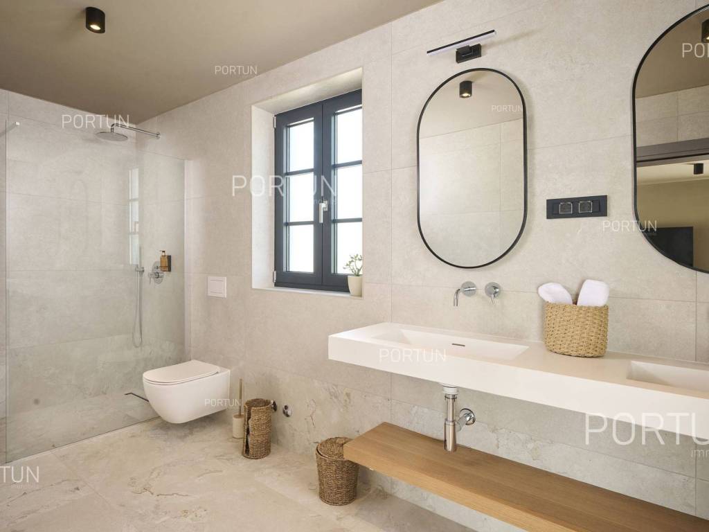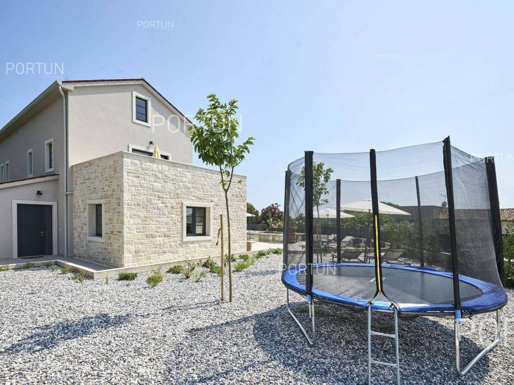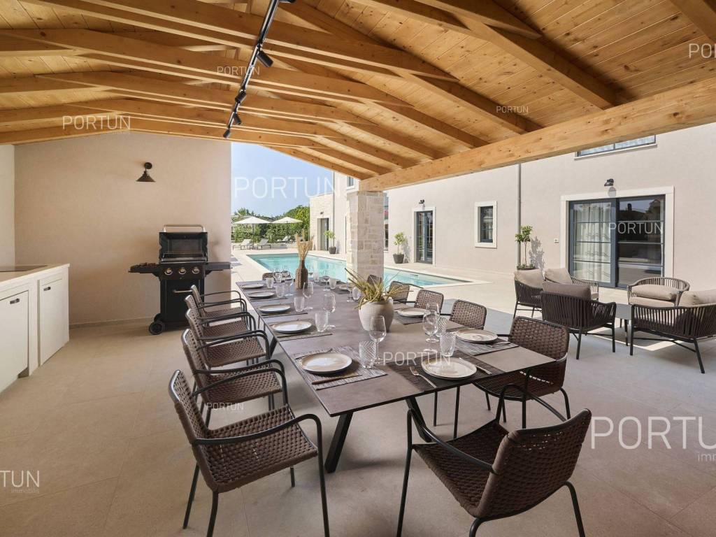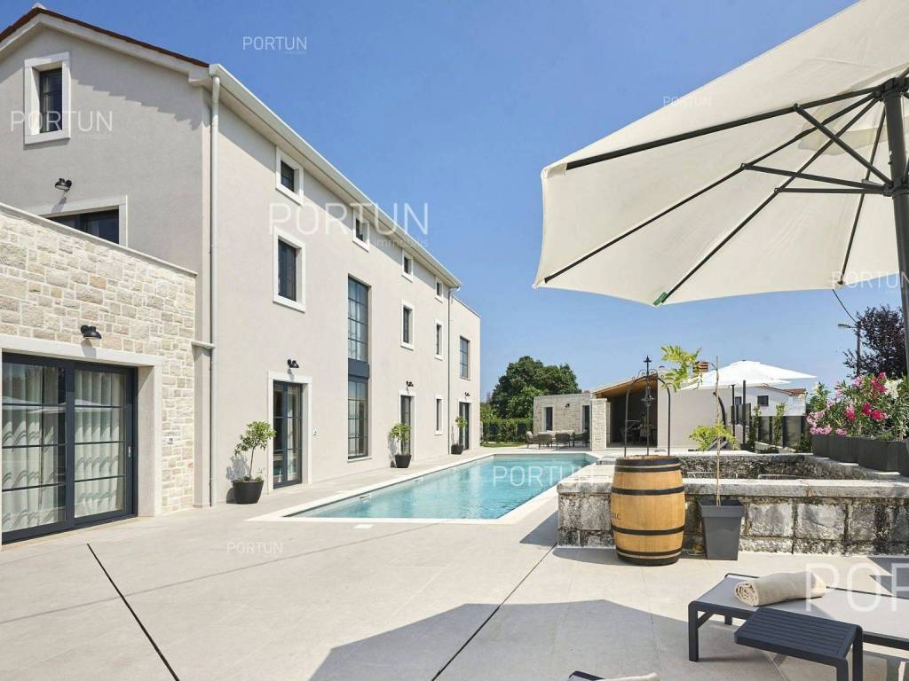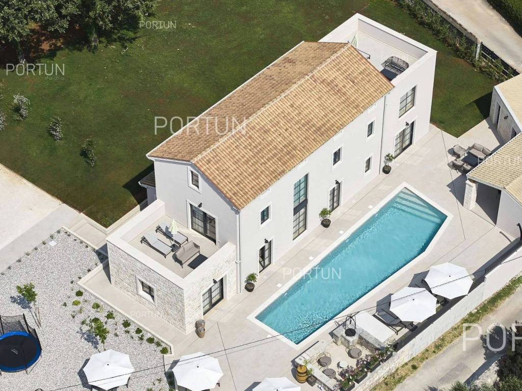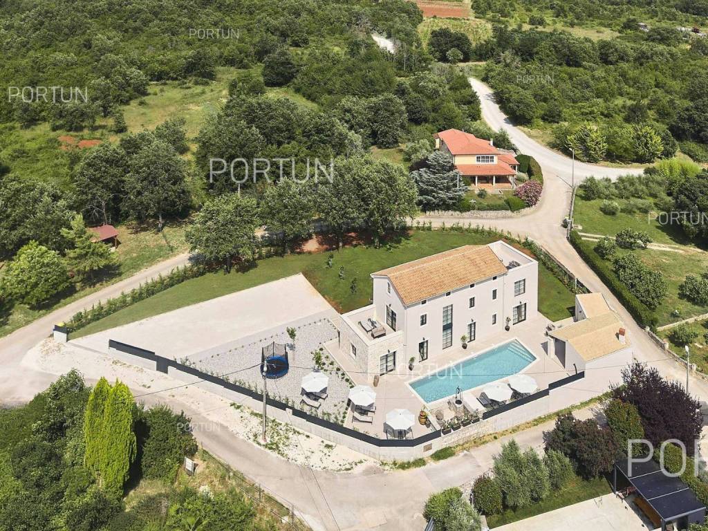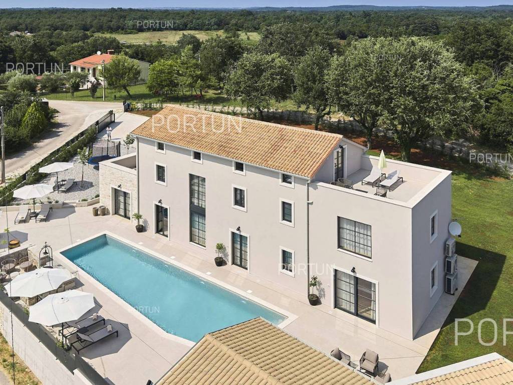 This beautiful luxury holiday villa, located near Poreč, offers five spacious bedroomswith en-suite bathrooms and is ideal for larger families or groups of friends. Located in a quiet little village, only ten kilometers from the coast, this villa radiates traditional charm and refined elegance. The interior of the villa fascinates with its light, airiness and modern design, providing the perfect combination of comfort and luxury for relaxing and enjoying your vacation. The house is still under construction, but it already offers an exceptional set of contents. The outdoor space is also impressive, with a spacious 1,364 square meter courtyard surrounding the house, and a 50 square meter swimming pool. Heating and cooling are solved smartly and efficiently, through floor heating on a heat pump. There is also an auxiliary building in the yard that contains a large dining room with a fireplace, a sauna and technical rooms. The location of this house is ideal for those looking for a combination of peaceful country life and proximity to urban facilities. The sea and the beach are 12 km away, while the shop and cafe or bar are 2.3 km away. Poreč is 10 km away, and Rovinj is 25 km away. The layout of the house is practical and spacious. On the ground floor there is a living room with a dining room, a kitchen, a bedroom with a bathroom and a wardrobe, a covered terrace, one toilet, a corridor and a boiler room. On the first floor there are three bedrooms with bathrooms, a terrace, a corridor and a staircase. In the attic there is a master bedroom with a living room and a terrace with a hot tub. This elegant Istrian house offers everything you need for a comfortable and luxurious life, and our team is available for additional information. LocationOne of the most developed and beautiful regions of Croatia is green-blue Istria, known as the "new Tuscany", which represents a combination of unique natural sights and rich cultural heritage. On the western coast of the Istrian peninsula, there is a city with a thousand-year history, Poreč with the charming old town with its mosaics and sights under the auspices of UNESCO, the tradition of wine and olives cultivation, local varieties and groceries, quiet coves, long coastline and green interior riches make it an ideal place to live. A typical rural location in the vicinity of Poreč, where the villa is situated, offers a whole spectrum of amenities nearby:Sea | Beach 12 km Services | Food store 2,3 km - Cafe or bar 2,3 km - Inn or restaurant 2,5 km - Elementary School 2,4 km - Health center 9 km Sports and fun | Soccer field 9 km - Basketball court 9 km - Water Park Aquacolors 11 km - Special forest vegetation reserve "Kontija" 8 km Nearby towns | Tar 16 km - Rovinj 25 km Traffic | Highway entry Baderna 5 km - Pula Airport 46 km Attractions | Geomorphological nature monument Baredine Pit 15 km About the propertyThe estate which extends to 1.364 square meters comprises: Main house | 5 Bedrooms - 5 Bathrooms - 3 Floors - 319,76 m2Auxiliary building | 1 Floor - 59,76 m2Swimming pool | 50,00 m2LayoutThe beautifully decorated villa with an excellent layout, with 320 square meters, is spread over three floors, i.e. through the ground floor, the 1st floor and the attic. Ground floor | The entrance to the villa is on the ground floor. This 154,30 m2 floor includes a living room with dining room, a kitchen, one bedroom with en suite bathroom and walk in closet, a covered terrace, a lavatory, a corridor and a boiler room. First floor | Internal straight stairs lead to the upper level, that is to the 1st floor. This 109,66 m2 level features three bedrooms with en suite bathrooms, a terrace, a corridor and a staircase. Attic | Internal straight stairs lead to the attic, the highest level of this villa. This floor, with 55,80 m2, boasts the second living room, a master's bedroom and a terrace. Parking spaces Parking for six carsAbout the villaThe entrance to the villa is on the ground floor level, from the northeast side, and vertical communication takes place via an internal staircase. The basic architectural characteristics of this well-maintained villa are: Floors | Ground floor + First floor + Attic Orientation | Southwest External walls | Styrofoam insulation 10 cm + Block brick wall 25 cm Concrete slab floors Roof | Pitched roof covered with clay tiles Construction began in 2023 | Construction is underwayFurniture and equipmentFurniture | All furniture is included in the priceEquipment | Video intercom - Video surveillanceJoinery | Aluminum joinery with double glazing - Schüco profiles - Wooden shutters - Aluminum entry door - Internal wooden doorsMultimedia | TV in the living room - SAT TVHeating and cooling | Underfloor heating with a heat pump - Air conditioning - Heat pumps - Combined water boilerFlooring | Top quality ceramic tilesOutdoor spaceEquipment | Outdoor lighting - Automatic irrigation - Drip irrigationFences | Privet hedge - A wall with a metal fenceDriveway | Metal door - Motor drive - Wing openingRelaxation zones Outdoor pool Skimmer pool | Concrete construction - Pool liner: Ceramic tiles - Disinfection of water with chlorine - Water heating - Pool cover Sunbathing area | Outdoor shower - Beach lighting Terrace Hydro massage bathServices Connection to the power grid Connection to the water supply network | Rainwater tank Septic tank Paved public access roadReal estate statusThe land is located entirely within the boundaries of the construction area. DocumentationExtracted documents | Building permit - Main projectArea calculationThe area of the villa (319,76 m2) includes the areas of these spaces:Living area (Ground floor + First floor + Attic) = 304,72 m2*Terraces (First floor + Attic) = 11,22 m2**Covered terrace (Ground floor) = 3,82 m2****Areas are calculated with coefficient c= 1,00**Areas are calculated with coefficient c= 0,25***Areas are calculated with coefficient c= 0,50Data source = Main projectThe total land area including the f