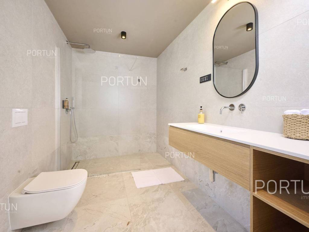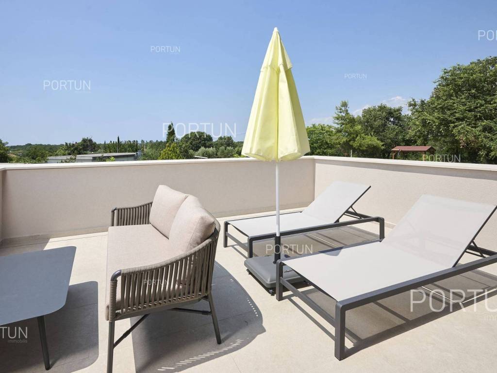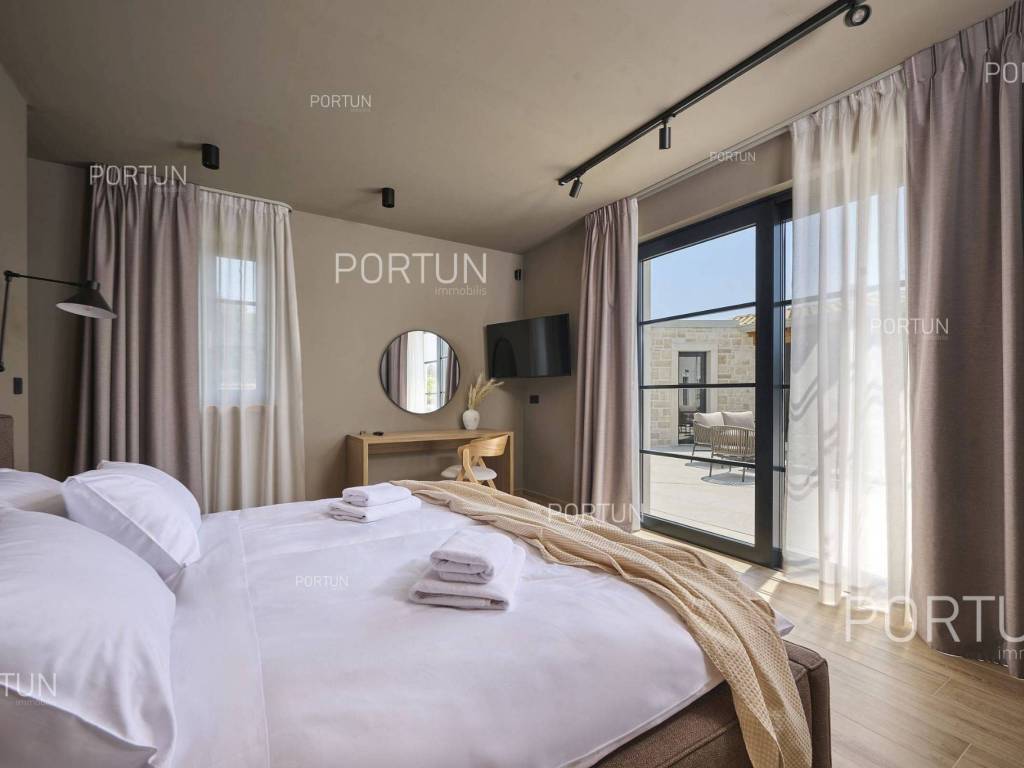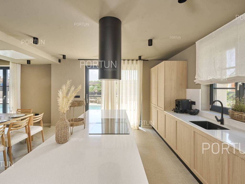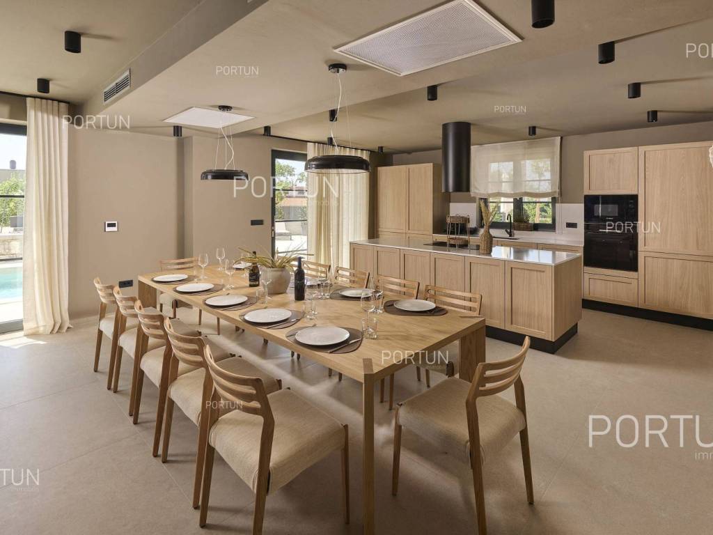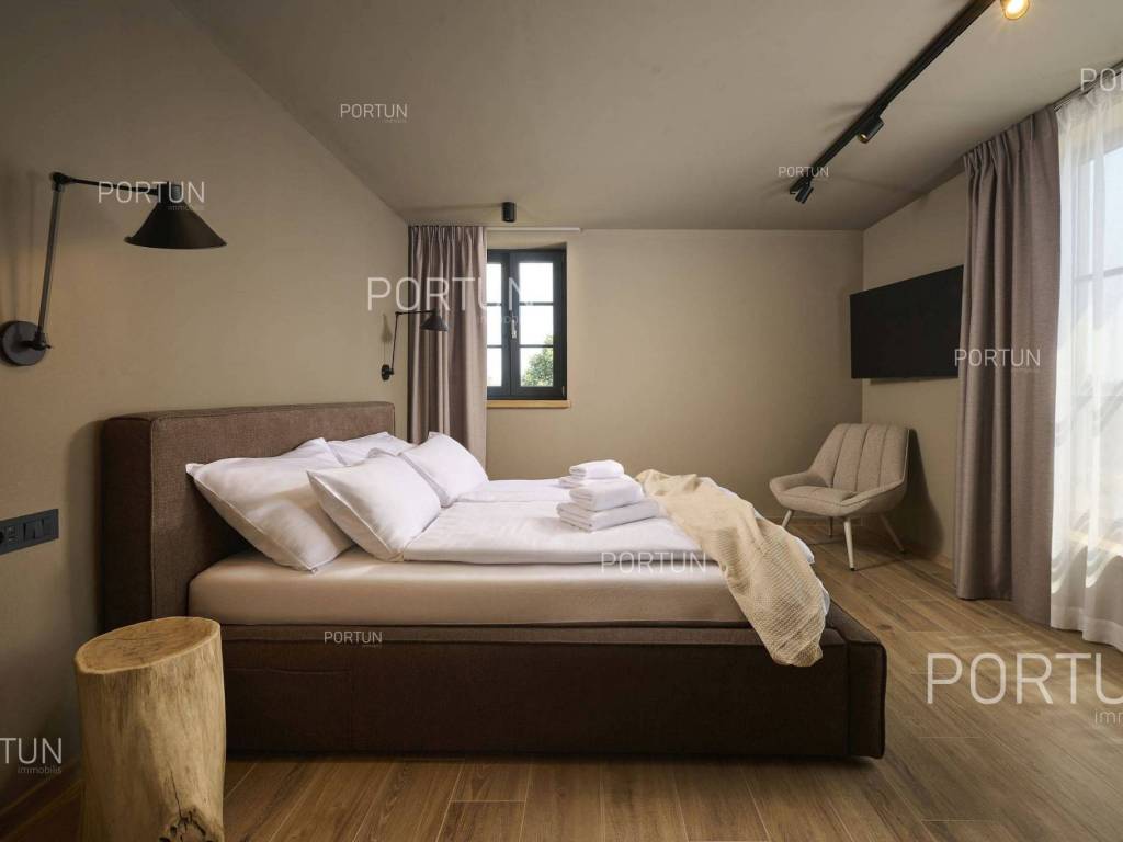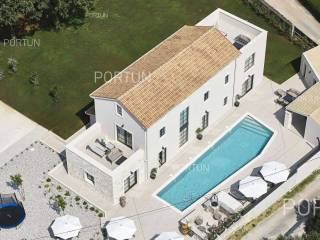 This beautiful luxury holiday villa, located near Poreč, offers five spacious bedroomswith en-suite bathrooms and is ideal for larger families or groups of friends. Located in a quiet little village, only ten kilometers from the coast, this villa radiates traditional charm and refined elegance. The interior of the villa fascinates with its light, airiness and modern design, providing the perfect combination of comfort and luxury for relaxing and enjoying your vacation. The house is still under construction, but it already offers an exceptional set of contents. The outdoor space is also impressive, with a spacious 1,364 square meter courtyard surrounding the house, and a 50 square meter swimming pool. Heating and cooling are solved smartly and efficiently, through floor heating on a heat pump. There is also an auxiliary building in the yard that contains a large dining room with a fireplace, a sauna and technical rooms. The location of this house is ideal for those looking for a combination of peaceful country life and proximity to urban facilities. The sea and the beach are 12 km away, while the shop and cafe or bar are 2.3 km away. Poreč is 10 km away, and Rovinj is 25 km away. The layout of the house is practical and spacious. On the ground floor there is a living room with a dining room, a kitchen, a bedroom with a bathroom and a wardrobe, a covered terrace, one toilet, a corridor and a boiler room. On the first floor there are three bedrooms with bathrooms, a terrace, a corridor and a staircase. In the attic there is a master bedroom with a living room and a terrace with a hot tub. This elegant Istrian house offers everything you need for a comfortable and luxurious life, and our team is available for additional information. LocationOne of the most developed and beautiful regions of Croatia is green-blue Istria, known as the "new Tuscany", which represents a combination of unique natural sights and rich cultural heritage. On the western coast of the Istrian peninsula, there is a city with a thousand-year history, Poreč with the charming old town with its mosaics and sights under the auspices of UNESCO, the tradition of wine and olives cultivation, local varieties and groceries, quiet coves, long coastline and green interior riches make it an ideal place to live. A typical rural location in the vicinity of Poreč, where the villa is situated, offers a whole spectrum of amenities nearby:Sea | Beach 12 km Services | Food store 2,3 km - Cafe or bar 2,3 km - Inn or restaurant 2,5 km - Elementary School 2,4 km - Health center 9 km Sports and fun | Soccer field 9 km - Basketball court 9 km - Water Park Aquacolors 11 km - Special forest vegetation reserve "Kontija" 8 km Nearby towns | Tar 16 km - Rovinj 25 km Traffic | Highway entry Baderna 5 km - Pula Airport 46 km Attractions | Geomorphological nature monument Baredine Pit 15 km About the propertyThe estate which extends to 1.364 square meters comprises: Main house | 5 Bedrooms - 5 Bathrooms - 3 Floors - 319,76 m2Auxiliary building | 1 Floor - 59,76 m2Swimming pool | 50,00 m2LayoutThe beautifully decorated villa with an excellent layout, with 320 square meters, is spread over three floors, i.e. through the ground floor, the 1st floor and the attic. Ground floor | The entrance to the villa is on the ground floor. This 154,30 m2 floor includes a living room with dining room, a kitchen, one bedroom with en suite bathroom and walk in closet, a covered terrace, a lavatory, a corridor and a boiler room. First floor | Internal straight stairs lead to the upper level, that is to the 1st floor. This 109,66 m2 level features three bedrooms with en suite bathrooms, a terrace, a corridor and a staircase. Attic | Internal straight stairs lead to the attic, the highest level of this villa. This floor, with 55,80 m2, boasts the second living room, a master's bedroom and a terrace. Parking spaces Parking for six carsAbout the villaThe entrance to the villa is on the ground floor level, from the northeast side, and vertical communication takes place via an internal staircase. The basic architectural characteristics of this well-maintained villa are: Floors | Ground floor + First floor + Attic Orientation | Southwest External walls | Styrofoam insulation 10 cm + Block brick wall 25 cm Concrete slab floors Roof | Pitched roof covered with clay tiles Construction began in 2023 | Construction is underwayFurniture and equipmentFurniture | All furniture is included in the priceEquipment | Video intercom - Video surveillanceJoinery | Aluminum joinery with double glazing - Schüco profiles - Wooden shutters - Aluminum entry door - Internal wooden doorsMultimedia | TV in the living room - SAT TVHeating and cooling | Underfloor heating with a heat pump - Air conditioning - Heat pumps - Combined water boilerFlooring | Top quality ceramic tilesOutdoor spaceEquipment | Outdoor lighting - Automatic irrigation - Drip irrigationFences | Privet hedge - A wall with a metal fenceDriveway | Metal door - Motor drive - Wing openingRelaxation zones Outdoor pool Skimmer pool | Concrete construction - Pool liner: Ceramic tiles - Disinfection of water with chlorine - Water heating - Pool cover Sunbathing area | Outdoor shower - Beach lighting Terrace Hydro massage bathServices Connection to the power grid Connection to the water supply network | Rainwater tank Septic tank Paved public access roadReal estate statusThe land is located entirely within the boundaries of the construction area. DocumentationExtracted documents | Building permit - Main projectArea calculationThe area of the villa (319,76 m2) includes the areas of these spaces:Living area (Ground floor + First floor + Attic) = 304,72 m2*Terraces (First floor + Attic) = 11,22 m2**Covered terrace (Ground floor) = 3,82 m2****Areas are calculated with coefficient c= 1,00**Areas are calculated with coefficient c= 0,25***Areas are calculated with coefficient c= 0,50Data source = Main projectThe total land area including the f