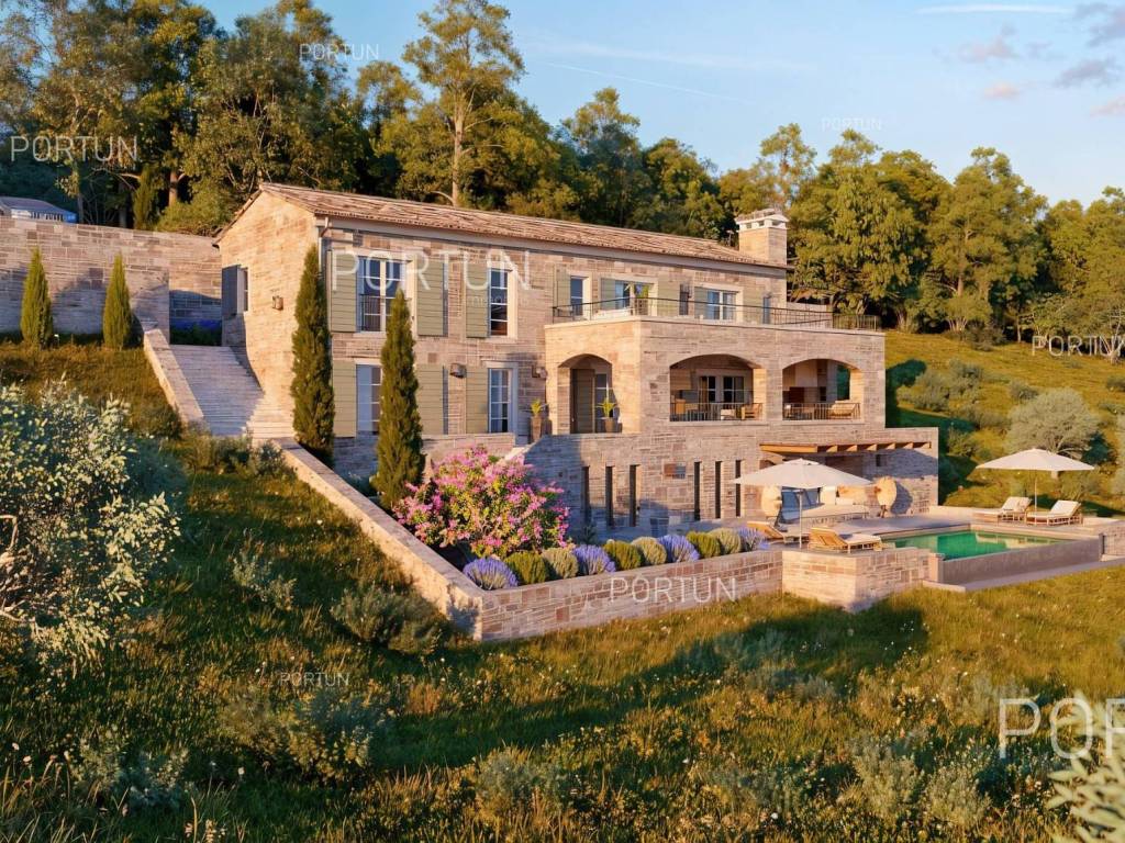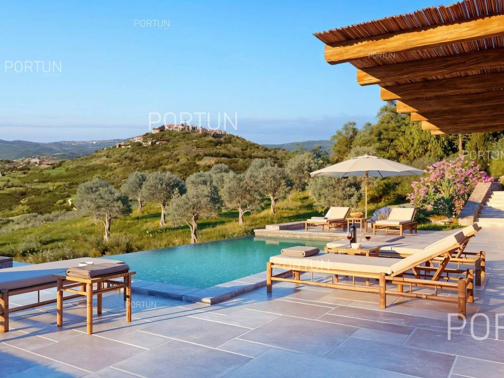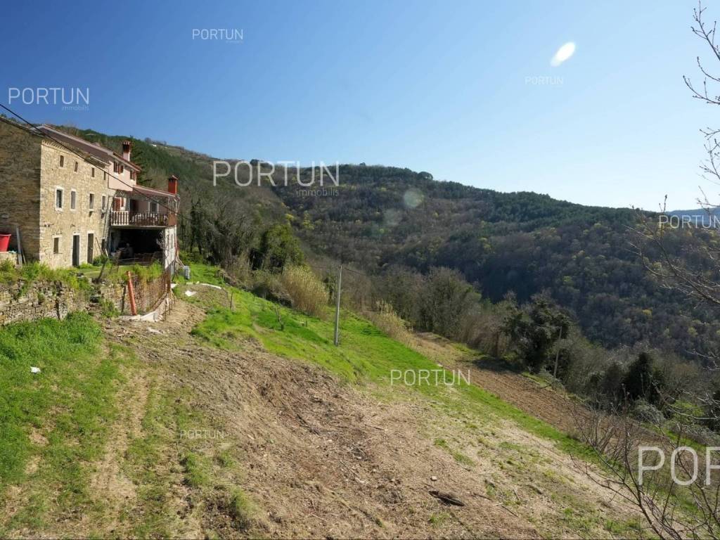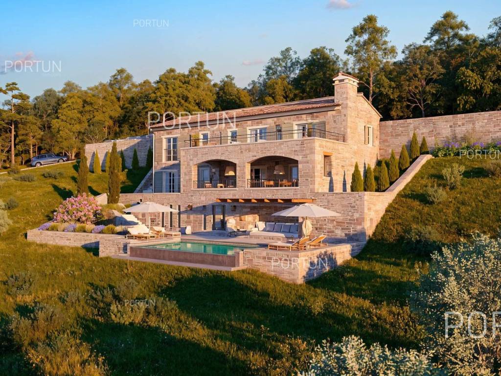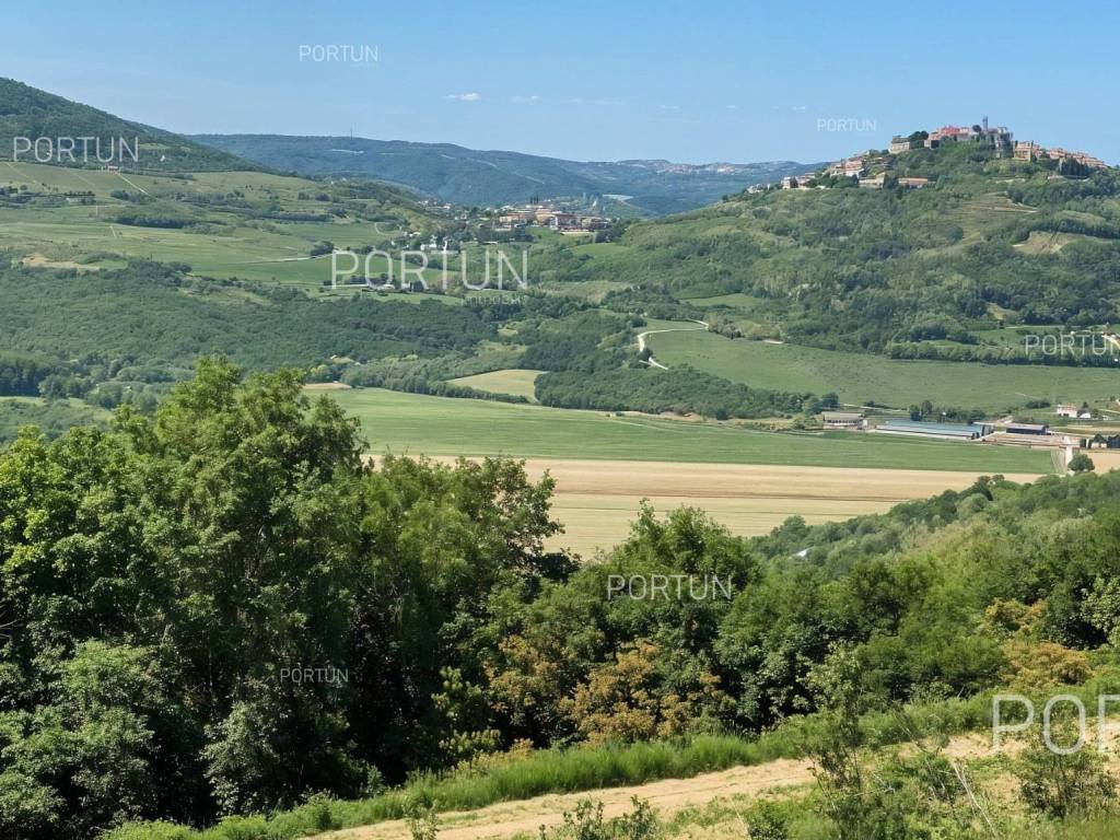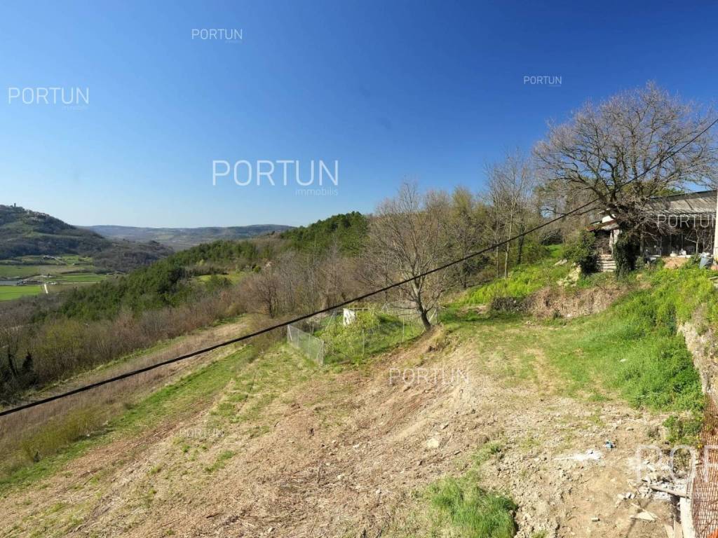 On an attractive location near Motovun, situated on a hill with a panoramic view, this building plot offers a perfect opportunity to build a luxurious villa. Oriented southwest, it ensures plenty of sunshine and stunning sunsets. The land comes with a building permit and is located next to an asphalt road, providing ideal conditions for an investment or a private residence in the heart of Istria.This building land is located in an attractive area near Motovun, known for its fairytale landscapes and rich history. From the hill, there is an unobstructed view of the rolling Istrian landscapes, while the southwest orientation ensures maximum sun exposure throughout the day. Thanks to its location at the edge of the building zone, privacy and tranquility are guaranteed, with only agricultural land in front, preserving the scenic beauty.The plot comes with a building permit for the construction of an exclusive villa in Tuscan style, significantly speeding up the construction process. The planned villa can include spacious terraces, a swimming pool, and all the amenities needed for top-level comfort. The total area of 1878 m2 provides ample space for a designed garden and additional facilities, while the proximity to the asphalt road ensures easy access and connectivity to key destinations in the region.Located just 7 km from Motovun, the land is in the immediate vicinity of shops, restaurants, and cafes, as well as all necessary services such as a pharmacy, school, and sports facilities. For outdoor enthusiasts, the famous Parenzana cycling and walking trail is nearby, along with various opportunities for sports and recreation. The connectivity is excellent the highway entrance is 24 km away, and Portorož Airport can be reached in just 33 km.Situated in the idyllic landscape of Istria, this land offers a perfect balance between privacy and access to amenities. The sea and the nearest beaches are 30 km away, while historic Istrian towns such as Karojba (11 km) and Oprtalj (13 km) are easily accessible. Nature lovers will enjoy the protected forest in the Mirna River valley, just 6 km away, offering unique landscapes and exploration opportunities.Interested? Contact us for more information and to schedule a viewing of this unique property!Distances from the propertyMotovun | 7 kmSea | Beach 30 km Services | Food store 7 km - Cafe or bar 7 km - Inn or restaurant 6 km - Elementary School 7 km - Pharmacy 7 km Sports and fun | Soccer field 6 km - Cycling and hiking trail Parenzana 4 km Nearby towns | Karojba 11 km - Oprtalj 13 km Traffic | Highway entry Nova Vas 24 km - Portorož Airport 33 km Attractions | Protected forest in the Mirna river valley 6 km ProjectAccording to the project, the villa is designed with an emphasis on comfort and elegance, offering four spacious bedrooms, each with its own bathroom. The construction includes massive external walls (stone wall 15 cm + insulation 10 cm + brick block 25 cm), reinforced concrete interfloor construction and a sloping gable roof, ensuring high energy efficiency and durability.The entrance to the villa is located on the first floor, where there are three luxurious bedrooms with en-suite bathrooms, a spacious hallway and a covered entrance. An additional impression of openness is provided by a large terrace, ideal for relaxing and enjoying the view.The ground floor is designed as a central space for socializing and living, with an elegant living room connected to the kitchen and dining room. Here is also another bedroom with a private bathroom, an additional toilet, a hallway, a laundry room and a practical storage room. The living area opens onto a covered terrace, which provides a perfect place to enjoy the outdoors.The villa was designed with special attention to the outdoor space - an overflow pool, lined with decorative gravel, with an advanced water purification system through electrolysis is planned. Three covered parking spaces are provided in the parking lot, which ensures additional convenience and protection of vehicles.This luxurious residence offers the perfect combination of modern design, top-quality materials and top functionality - the ideal home for those seeking exclusivity and comfort.Services Public water and mains electricity infrastructure: along the land boundary Paved public access roadLand statusThe land is located entirely within the boundaries of the construction area. DocumentationExtracted documents | Building permit - Main projectArea calculationThe land area amounts to 1.878 square meters. Data source = Cadastre data