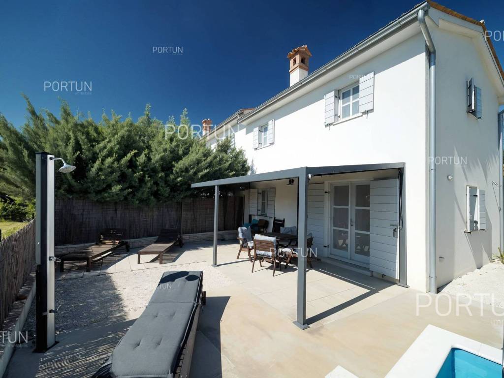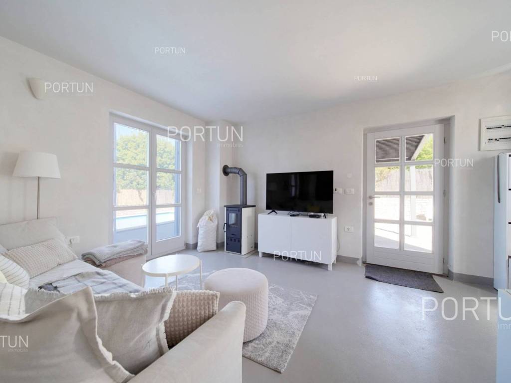 In a quiet village near Svetvinčenat, a house with two separate apartments and two private pools is for sale, ideal for two families or as a tourism investment. Each apartment has its own entrance and fenced yard, and the house was built in 2017 to high construction standards. The location offers peace and privacy while being well connected with the rest of Istria.The house consists of two floors ground floor and first floor, and includes two completely separate two-bedroom apartments. Each unit has a private entrance and access to a private pool, ensuring full independence and privacy.Construction is of high quality: the exterior walls consist of 25 cm block bricks and 10 cm styrofoam insulation. It also features a reinforced concrete floor structure and a gabled roof. The southwest orientation ensures plenty of daylight.The total land area, including the building footprint, is 484 m2. The entire parcel is within the building zone. The yard is fenced with a hedge and stone wall, and the entrance gate is metal with motor drive and sliding opening.The house is equipped with underfloor heating, air conditioning, and two chimneys for additional heating options. The woodwork includes double glazing, and the floors are covered with polished concrete and ceramic tiles. All furniture is included in the price, enabling immediate occupancy without further investment.The location is ideal for peaceful living and close to amenities: Svetvinčenat is 3 km away, Žminj 9 km, Vodnjan 17 km, and beaches 24 km. Within a 3 km radius youll find a shop, café, restaurant, school, and clinic. The motorway entrance is 11 km away, and Pula airport is 31 km away.Request more information or schedule a viewing well gladly answer all your questions and help you make the right decision!Distances from the propertySvetvinčenat | 3 kmSea | Beach 24 km Services | Food store 3 km - Cafe or bar 3 km - Inn or restaurant 3 km - Elementary School 3 km - Health center 3 km Sports and fun | Soccer field 3 km - Basketball court 3 km - Adventure park Glavani 16 km Nearby towns | Žminj 9 km - Vodnjan 17 km Traffic | Highway entry Kanfanar 11 km - Pula Airport 31 km Attractions | Cave Feštinsko Kraljevstvo 9 km About the houseThe entrance to the house is on the ground floor level, from the northeast side, and vertical communication takes place via an internal staircase. The basic architectural characteristics of this pleasant house are: Floors | Ground floor + First floor Orientation | Southwest External walls | Styrofoam insulation 10 cm + Block brick wall 25 cm Concrete slab floors Roof | Double-pitch roof Built in 2017FurnitureFurniture | All furniture is included in the priceJoinery | Wooden joinery with double glazing - Wooden shutters - Wooden entry door - Internal wooden doorsHeating and cooling Air conditioning - Boilers (2) - Chimneys (2) Underfloor heating - electric | All roomsFlooringPolished concrete | Ground floor (Living rooms with dining rooms and kitchens - Bedrooms - Corridors) - First floor (Living rooms with dining rooms and kitchens - Bedrooms - Corridors)Ceramic tiles | Ground floor (Bathrooms) - First floor (Bathrooms)Outdoor spaceFences | Hedge - A stone wallDriveway | Metal door - Motor drive - Slide openingServices Connection to the power grid Connection to the water supply network Septic tank Paved public access roadReal estate statusThe land is located entirely within the boundaries of the construction area. DocumentationExtracted documents | Usage permission - Main projectArea calculationThe total land area including the footprint of the building(s) amounts to 484 square meters. Data source = Cadastre data