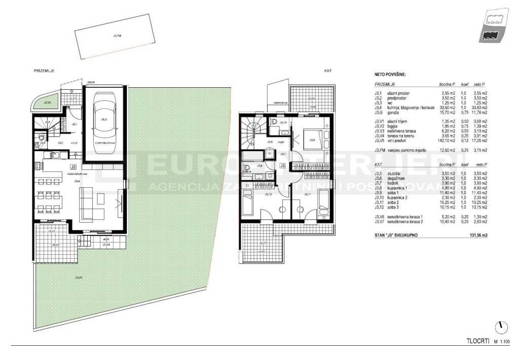 - prizemlje (Pr) garaža, ulazni prostor sa stubištem, dnevni boravak, blagovanje, kuhinja, wc