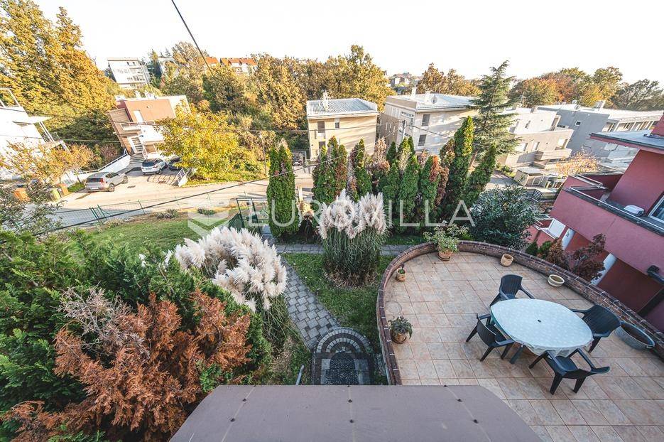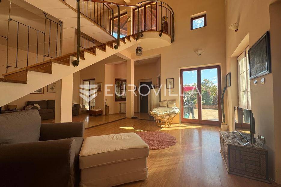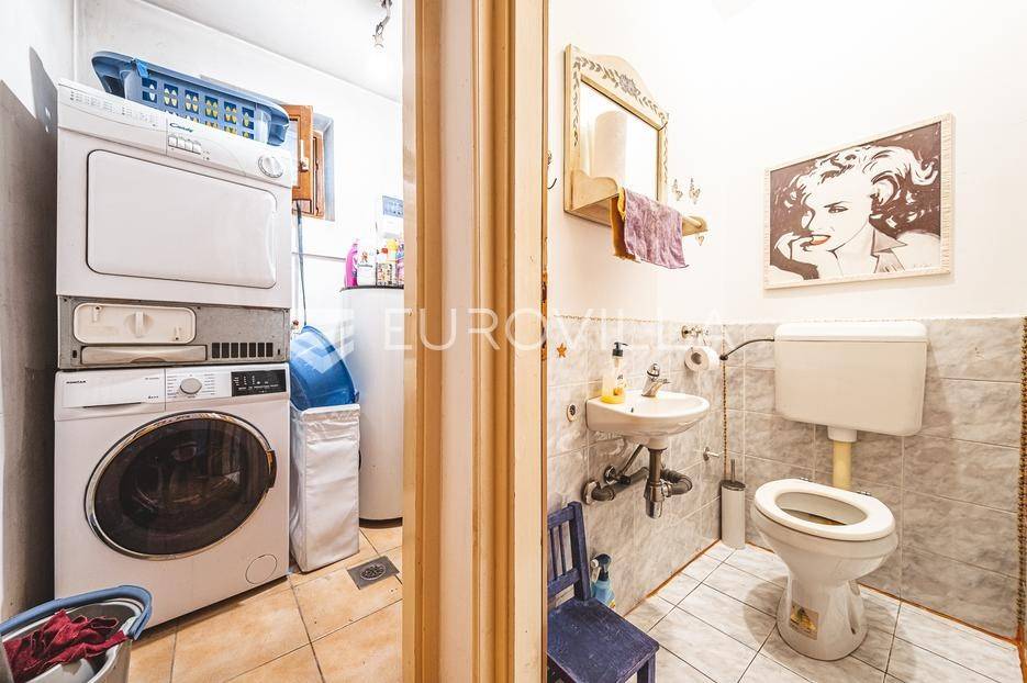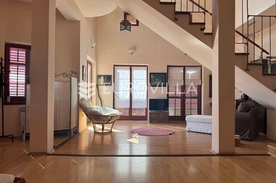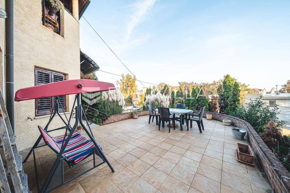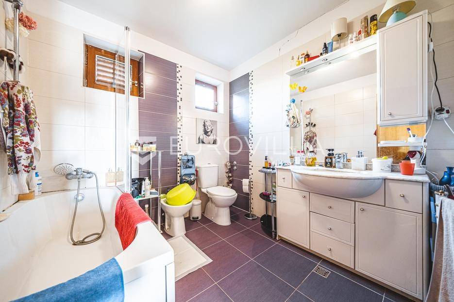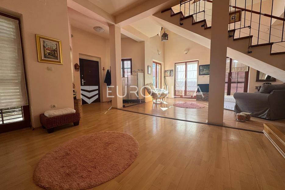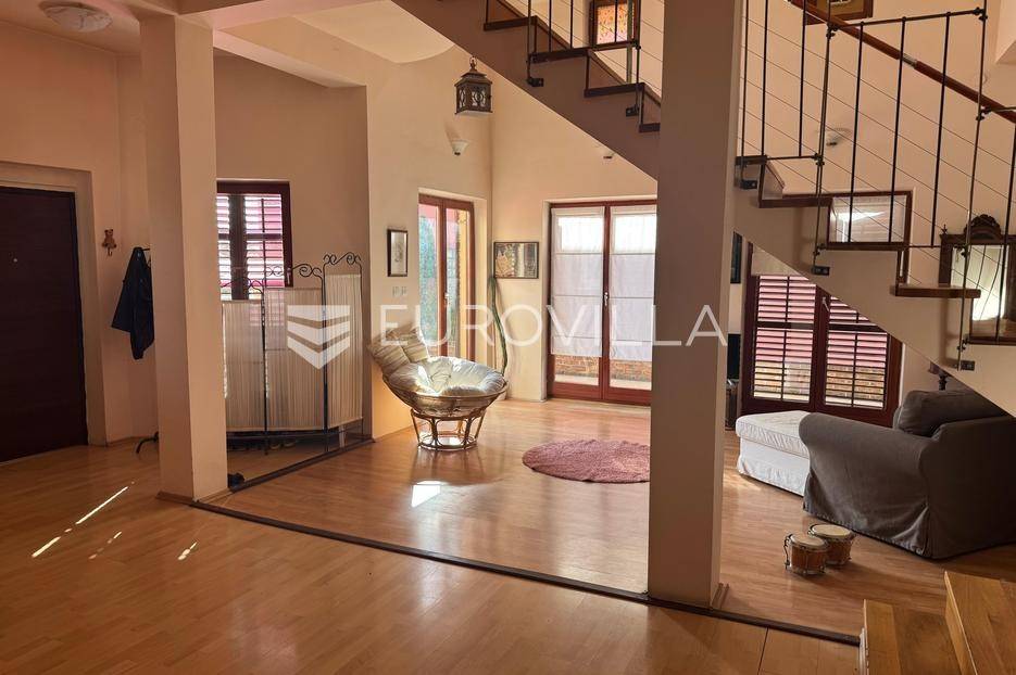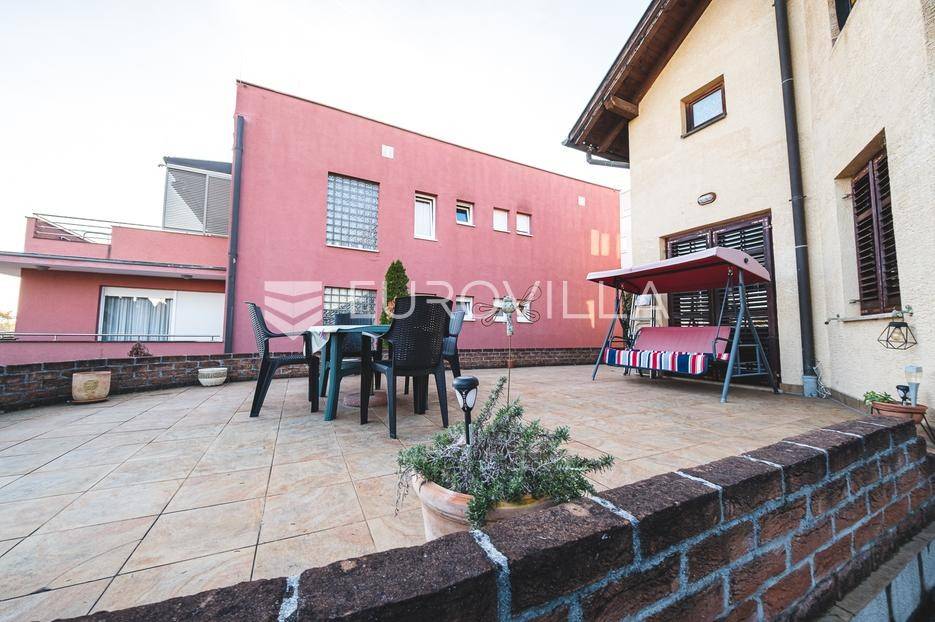 Odličan raspored, orijentacija na sve strane što doprinosi izuzetnoj svjetlini svih soba. U dvorištu je parking za pet automobila, a uz kuću nalazi se pomoćna zgrada površine 34 m² koja se sastoji od dvije prostorije i WC-a, idealna za ured ili salon. Kuća je namještena i potpuno opremljena kuhinja, a dvorište je prostrano i mirno, idealno za obiteljski život. Lokacija je uvučena od glavne ceste i mirna, nalazi se u blizini tramvaja, vrtića, osnovne škole i svih potrebnih sadržaja.
