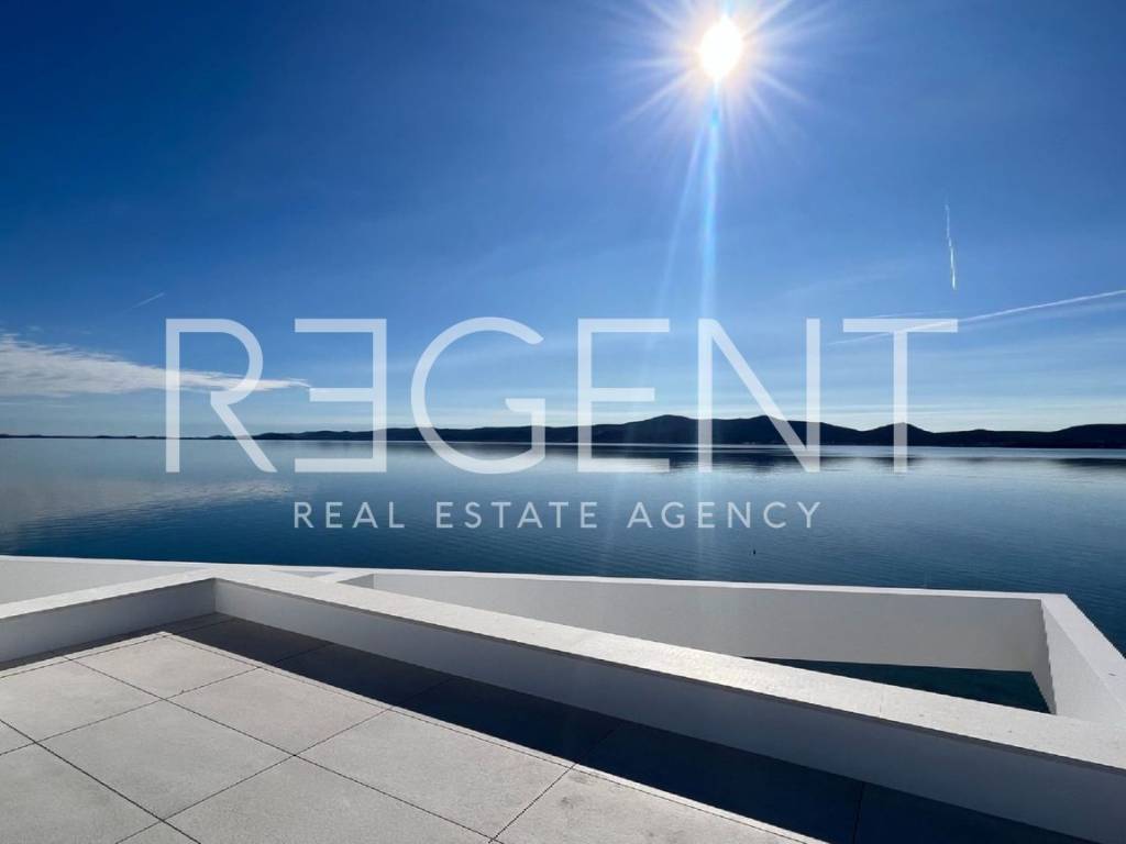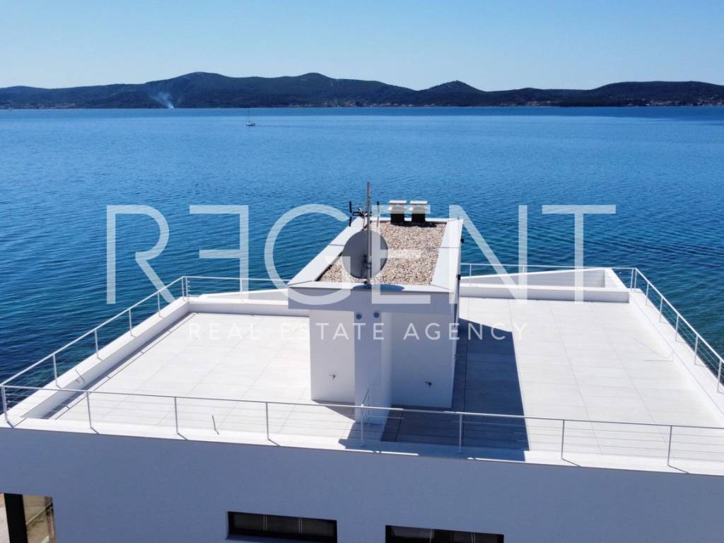 A beautiful luxury apartment, located in the first row to the sea. The apartment is fully furnished with designer Italian furniture. It is located in an extremely desirable location, close to a beautiful beach, directly by the sea, and only a few kilometers away from the city of Zadar, which makes it even more attractive.The apartment is located on the first and second floor of the building and consists of a living room with dining room, kitchen, three bedrooms, two of which have their own bathroom, additional bathroom, wardrobe and hallway of 103 m2 and two terraces of 44 m2.The apartment has a roof terrace with a beautiful view of the place and islands, one garage parking space and one storage room. The total usable area of the apartment with accessories is 218 m2.