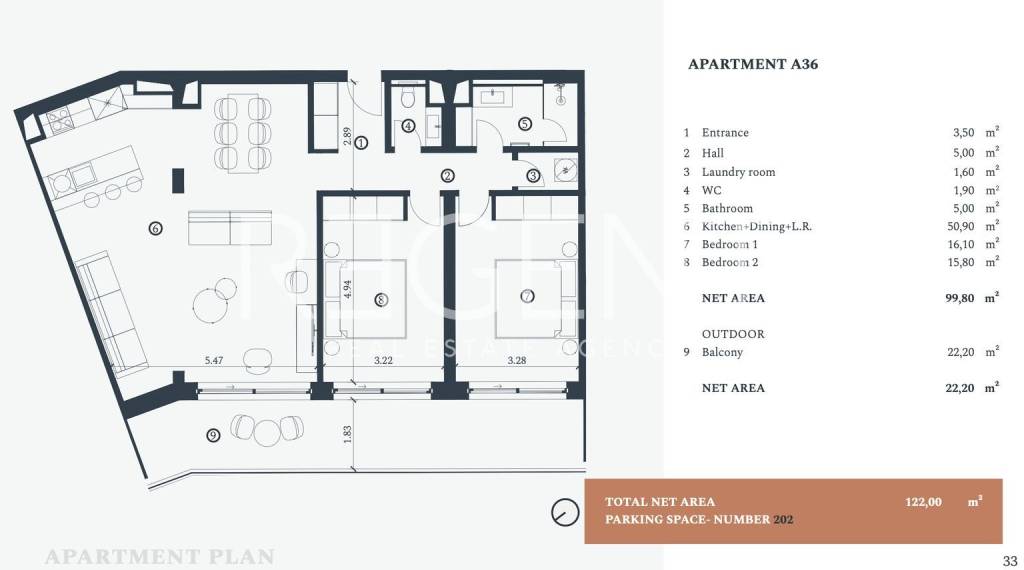 In the heart of Mediterranean Europe, in the Alberi micro-location right next to the sea, in Savudrija, in a modern complex with a touch of luxury that provides relaxation and rest, is a modern three-room apartment on the 2nd floor of 122 m2. The apartment is oriented to the west. The apartment consists of: a hallway, two luxurious bedrooms, a bathroom, a spacious living room with a dining room and kitchen, a toilet, a laundry/laundry room and a balcony and a parking space.The apartments and apartments are modern and open with a view, with the right dose of luxury and privacy that will allow you to enjoy all occasions unhindered. High construction standards ensure maximum privacy and undisturbed rest for you and everyone around you, even if your guests are a little loud.For each apartment, you can choose an interior design package that suits your style and preferences. You can also opt for a maintenance package. All our apartments include seamless and priority use of all services that the resort offers.The price includes a parking space, VAT is not included.The price of the apartment with included furniture is: EUR 862,462