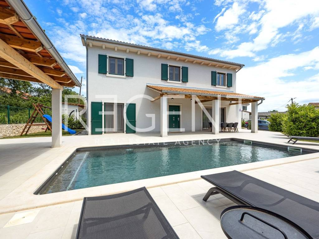 In the interior of Istria, in the municipality of Barban, this modern villa with its beautifully decorated garden, swimming pool and outdoor gazebo is for sale. The villa has a total area of 160 m2 and a garden area of 474 m2, providing complete peace and privacy. The ground floor consists of a large living room with dining room, kitchen, master bedroom with bathroom. The first floor consists of two bedrooms, a hallway and a bathroom. The garden includes a large heated swimming pool, a summer kitchen, a playground for the youngest, a slide and swings, as well as two outdoor parking spaces. Each room has air conditioning, and heating is also possible via a fireplace. Additional underfloor heating has been installed in all bathrooms. New solar panels have also been installed. A bike ride or walk through this beautiful landscape full of greenery, beautiful nature, olive groves and orchards will make everyone fall in love with this region. The nearest airport is Pula Airport, which is 20 km away. The property is sold with all the furniture visible in the photos.