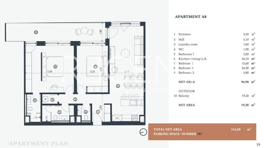 In the heart of Mediterranean Europe, in the Alberi micro-location right next to the sea, in Savudrija in a modern complex with a touch of luxury that provides relaxation and rest, there is a modern three-room apartment on the 1st floor of 114.20 m2. It consists of: a hallway, two luxurious bedrooms, two bathrooms, a spacious living room with a dining room and kitchen, a toilet, a laundry room and a balcony, and a parking space. The apartments are modern and open with a view, with the right amount of luxury and privacy that will allow you to enjoy all occasions without interruption. High construction standards ensure maximum privacy and undisturbed rest for you and everyone around you, even if your guests are a little loud. For each apartment you can choose an interior design package that suits your style and preferences. You can also opt for a maintenance package. All our apartments include flawless and priority use of all the services that the resort offers. The price includes a parking space, VAT is not included. The apartment is sold fully furnished.