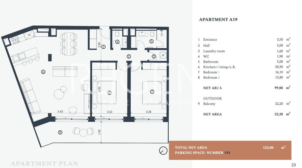 In the heart of Mediterranean Europe, in the Alberi microlocation right next to the sea, in Savudrija, in a modern complex with a touch of luxury that provides relaxation and rest, is located a modern three-room apartment on the 1st floor with an area of 122 m2. The apartment consists of: a hallway, two luxurious bedrooms, a bathroom, a spacious living room with a dining room and a kitchen, a toilet, a laundry room and a balcony and a parking space. The apartments and apartments are modern and open with a view, with the right dose of luxury and privacy that will allow you to enjoy all occasions without interruption. High construction standards ensure maximum privacy and undisturbed rest for you and everyone around you, even if your guests are a little loud. For each apartment, you can choose an interior design package that suits your style and preferences. You can also opt for a maintenance package. All our apartments include flawless and priority use of all the services that the resort offers. The price includes a parking space, VAT is not included. The price of the apartment with included furniture is: 794,020 euros.