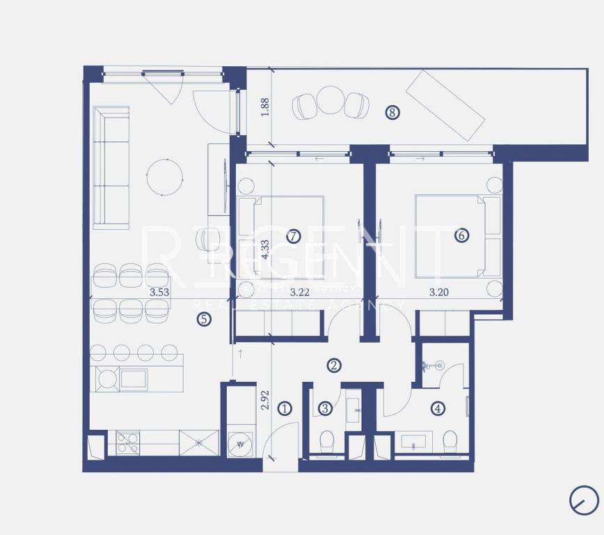 In the heart of Mediterranean Europe, in the Alberi micro-location right next to the sea, in Savudrija in a modern complex with a touch of luxury that provides relaxation and rest, there is a modern three-room apartment on the 3rd floor with a total living area of 97.30 m2. The apartment consists of : a hallway, two luxurious bedrooms, a bathroom, a spacious living room with a dining room and kitchen, a toilet and a balcony, and a parking space. The apartments are modern and open with a view, with the right amount of luxury and privacy that will allow you to enjoy all occasions unhindered. High construction standards ensure maximum privacy and undisturbed rest for you and everyone around you, even if your guests are a little loud. For each apartment, you can choose an interior design package that suits your style and preferences. You can also opt for a maintenance package. All our apartments include impeccable and priority use of all the services the resort offers. The price includes a parking space, VAT is not included. The price of the apartment with included furniture is: 575,565 euros.