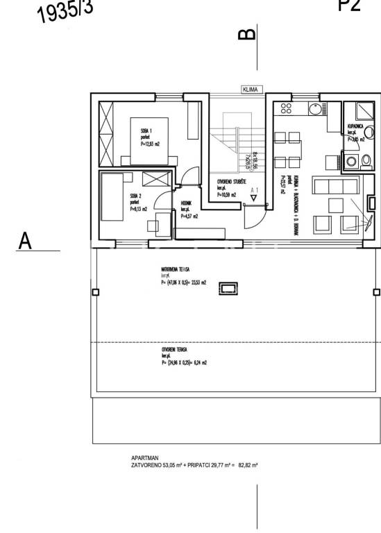 We are mediating the exclusive sale of a two-room apartment in a new building, located in Podstrana, near the Hotel “Lav”. Property Details: Net Area: 90.42 m² Floor: Second floor of a residential building Room Layout: Hallway: 2.52 m2 Bathroom: 4.76 m2 Bedroom 1: 12.62 m2 Bedroom 2: 14.30 m2 Living room with kitchen and dining room: 36.07 m2 Covered terrace: 25.08 m2 Open terrace: 30.44 m2 Construction Quality: The building is being built with high-quality materials, according to the highest construction standards; wool insulation, partition walls brick-knauf, fireproof and burglar-proof entrance doors, external PVC three-layer joinery Gealan, air conditioning in the living room, Italian ceramics and bathrooms with fully equipped sanitary ware. Possibility of buying an outdoor parking space. The apartment is oriented so that it is filled with natural light, higher floors in the building provide a view of the sea. Location Advantages: Distance from the sea: 800 m A new school is being built nearby Close to shops, kindergarten, restaurants and all the necessary facilities for everyday life This property is also ideal for tourist rental due to its location, proximity to the beach and all essential amenities. Feel free to contact us for more information!