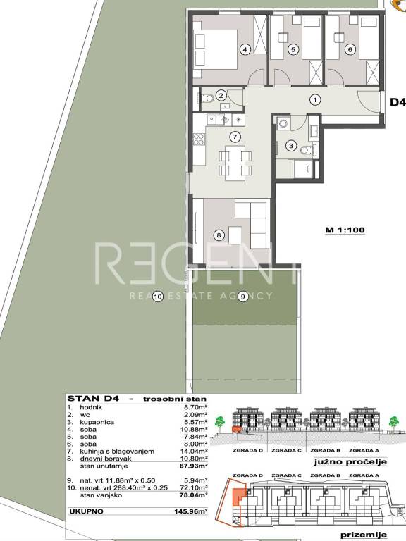 Two-room apartment located on the ground floor, in an excellent location in the Split settlement of Pazdigrad. The apartment is located in a modern new building. The apartment has a total net area of ​​78.17 m², and consists of a hallway, toilet, bathroom, two bedrooms and a kitchen with a dining room and living room. In addition to the interior space of 51.89 m², the apartment also has an outdoor area – a covered garden of 6.31 m² and an uncovered garden of 19.97 m², which makes an additional 26.28 m² of outdoor space. The apartment offers a practical layout of the rooms and direct access to its own garden. The property is located in a quiet part of Pazdigrad, close to all important amenities. Shops, schools, parks and public transport are available in the immediate vicinity, which makes this location extremely suitable for everyday life. The building is in the preparatory phase of construction, with a valid building permit. The start of construction is planned by the end of the year, after fulfilling all the conditions for the start of works. The deadline for completion of construction is 30 months from the start of construction. Parking spaces are available at a price of 2,000 EUR/m², while the price of the storage room is 2,200 EUR/m². Payment is possible in construction phases: 30% upon signing the preliminary contract, 40% upon completion of the concrete structure and the remaining 30% upon completion of the facade. Alternative payment models are possible by agreement with the buyer. For more information or to arrange a viewing, feel free to contact us.