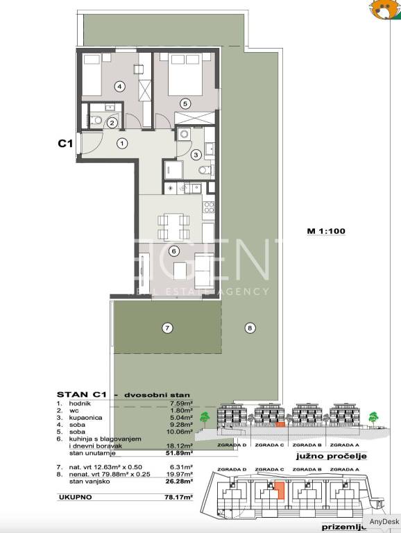 Two-room apartment located on the ground floor, in an excellent location in the Split settlement of Pazdigrad. The apartment is located in a modern new building. The apartment has a total net area of 78.17 m², and consists of a hallway, toilet, bathroom, two bedrooms and a kitchen with a dining room and living room. In addition to the interior space of 51.89 m², the apartment also has an outdoor area – a covered garden of 6.31 m² and an uncovered garden of 19.97 m², which makes an additional 26.28 m² of outdoor space. The apartment offers a practical layout of the rooms and direct access to its own garden. The property is located in a quiet part of Pazdigrad, close to all important amenities. Shops, schools, parks and public transport are available in the immediate vicinity, which makes this location extremely suitable for everyday life. The building is in the preparatory phase of construction, with a valid building permit. The start of construction is planned by the end of the year, after fulfilling all the conditions for the start of works. The deadline for completion of construction is 30 months from the start of construction. Parking spaces are available at a price of 2,000 EUR/m², while the price of the storage room is 2,200 EUR/m². Payment is possible in construction phases: 30% upon signing the preliminary contract, 40% upon completion of the concrete structure and the remaining 30% upon completion of the facade. Alternative payment models are possible by agreement with the buyer. For more information or to arrange a viewing, feel free to contact us.