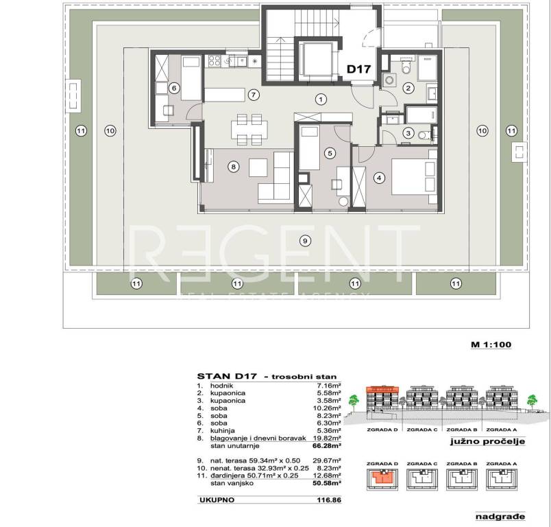 The offer is a two-bedroom apartment with a total area of 75.79 m² located on the ground floor of a new residential complex in a quiet location in Pazdigrad. It is intended for families, couples, and investors looking for a quality and functional home. The location offers excellent transport links to the city center, business zones, and public transport. There are schools, kindergartens, shops, and sports facilities nearby, and a quiet street guarantees a safe and pleasant life. The apartment comprises a hallway, a toilet, a bathroom, two bedrooms, a kitchen with dining area, and a living room. Additional outdoor space includes a covered and uncovered garden, ideal for relaxation and family activities. It is possible to purchase a parking space at a price of 2,000 EUR/m² and a storage room at a price of 2,200 EUR/m². The planned start of construction is by the end of the year. The project offers high-quality materials, energy efficiency, and modern heating and cooling systems. The purchase is without agency commission, with VAT included, and the possibility of financing. For additional information and viewing, please feel free to contact us.
