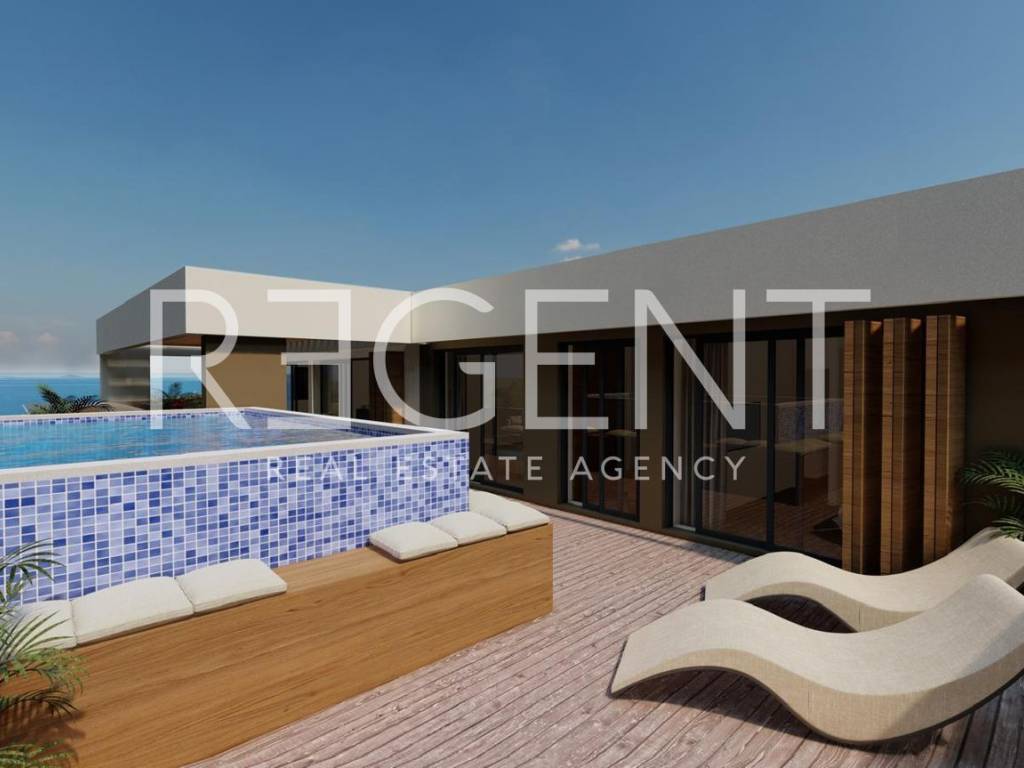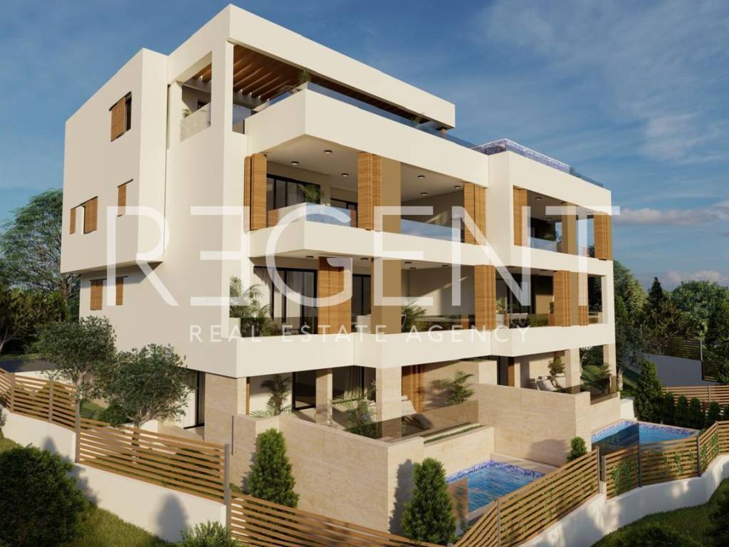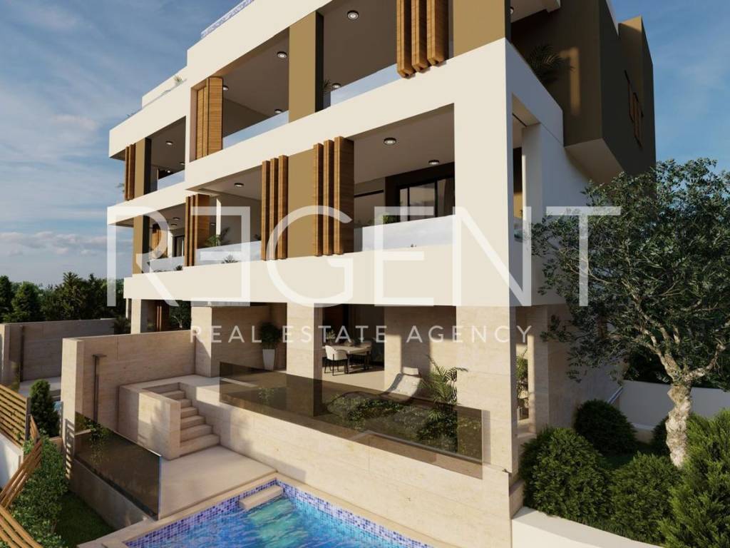 For sale is a luxurious three-room apartment of 132 m² in a top-quality new building in Primošten. The apartment is located on the ground floor of a modern residential building with seven apartments, oriented southwest, with an open sea view. Excellent location near the center and all necessary amenities. The apartment consists of: an entrance hall, a large open space living room with kitchen and dining room, two spacious bedrooms, two modern bathrooms, a laundry room, a balcony, and a storage room. The apartment comes with a luxurious terrace with a pool and a private garden with a jacuzzi. Equipment and features: – Smart home system – lighting, heating and security systems management – Security doors and intercom – Heat pump and air conditioners for optimal temperature throughout the year – Optical internet for fast and stable connection – Barbecue on the terrace – Aluminum joinery with triple glazing – Underfloor heating in all rooms – Elevator in the building Additional benefits: – Garage parking space – Outdoor parking space Location: The apartment is located in a quiet part of Primošten, with an open sea view and in the immediate vicinity of all important amenities – shops, restaurants, beaches and the town center. Completion date: The building will be completed on July 1, 2025. For more information or to arrange a viewing, feel free to contact us!