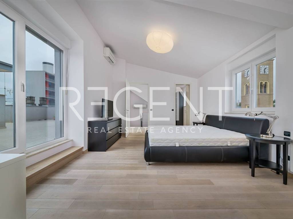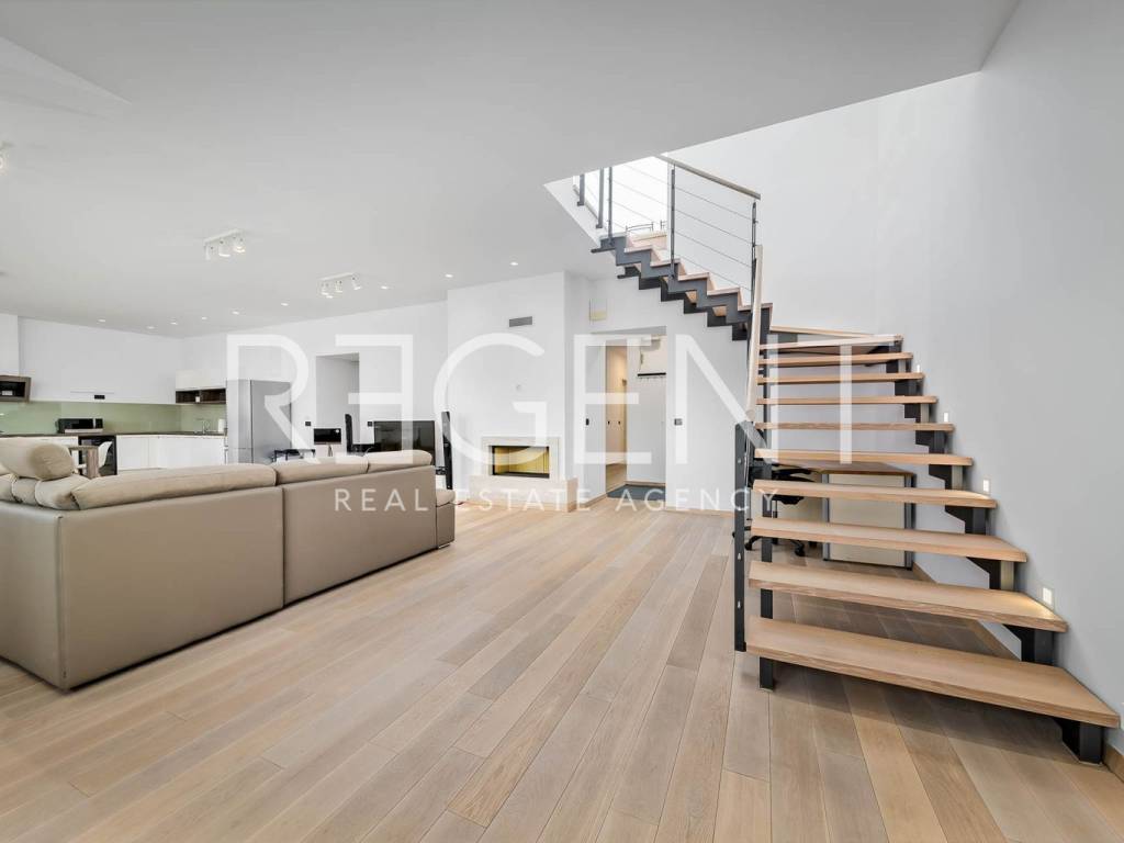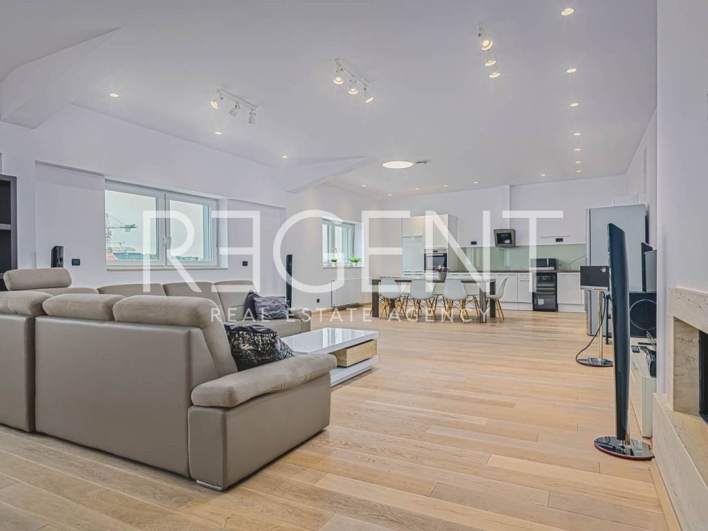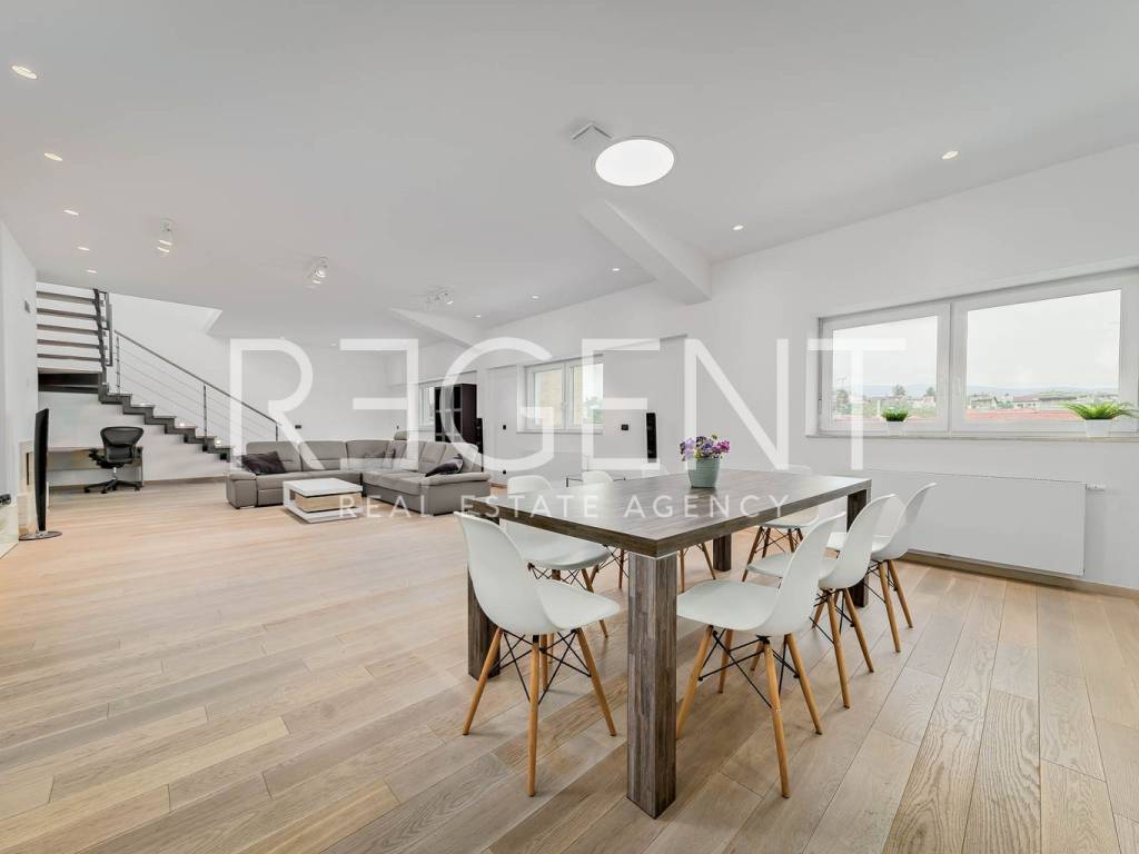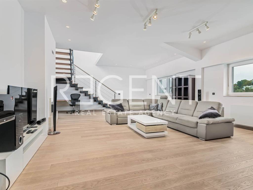 Near the city center on the 5th floor of a building with a private elevator, there is a luxurious four-room two-story penthouse with a net usable area of 225 m². The apartment was completely renovated in 2015, with a top-quality adaptation that includes the replacement of all installations (electricity, water, gas), installation of a concrete slab, three-layer PVC windows, oak parquet, designer radiators and a fireplace in the living room. The lower floor contains a comfortable entrance area, two bedrooms, two bathrooms, a separate utility room, a guest toilet and a spacious living room connected to the kitchen and dining room, creating an open space ideal for socializing and relaxing. The upper floor is reserved for the master bedroom with its own wardrobe and bathroom, while a special experience is provided on a large terrace of 106 m². The terrace is equipped with an outdoor kitchen, outdoor shower and a large jacuzzi, ideal for relaxing and enjoying privacy. The apartment also has two storage rooms - one of 4.82 m² and the other of 21.32 m², and it has a parking space in the yard of the building. In the immediate vicinity there is the Kvatrić market, shops, schools, health center, public transport and a hospital, which makes this property great for living in the center. For all additional information, feel free to contact us.