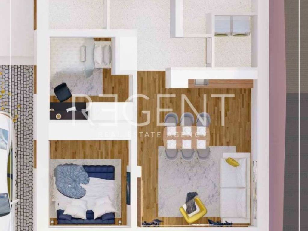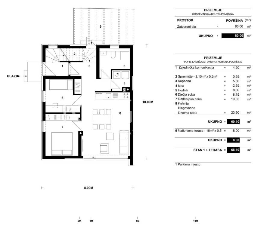 On the ground floor of a new building in the attractive Rudeš neighborhood, north of Trešnjevka, is located this sunny and modern residential unit with a net usable area of 72.60 m², whose orientation includes north, south and west. The apartment consists of: Storage (0.54 m²) Bathroom (5.60 m²) Pantry (3.96 m²) Hallway (7.27 m²) Children's room (8.15 m²) Master bedroom (10.85 m²) Kitchen + dining room + living room (23.57 m²) Covered terrace in the garden (8 m²) Garden (0.9 m²) Parking space (2.60 m²) Outdoor storage in the garden (1.15 m²).  The apartment also comes with a private part of the yard sheltered from view, an outdoor covered terrace, an outdoor storage room and 1 parking space. Equipment and quality: Construction: The walls are a combination of concrete and YTONG blocks 25 cm thick Reinforced concrete ceiling High earthquake resistance Flat roof made of reinforced concrete Coatings: ETICS facade Ceramics and three-layer CHEVRON oak parquet (for underfloor heating) Flat roof covered with TPO foil Equipping: Bathroom with walk-in shower, console toilet bowl and sanitary ware from renowned manufacturers (Geberit, Tece, Hansgrohe, Armal) Video intercom Electric blinds Preparation for Internet and TV in every room Separate heating regulation in each room Joinery: PVC windows with 6 chambers + 3 seals (GEALAN) in anthracite color Lift-and-slide glass walls (HST) Interior wooden doors with hidden hinges and magnetic lock Anti-burglary and fire-resistant entrance door Heating and air conditioning: Heat pump with underfloor heating and radiator in the bathroom Inverter air conditioning unit Preparation for electric vehicle charging station Infrastructure: Separate meters for electricity and water Connection to sewerage and cable network Preparation for induction hob Special features: A+ energy class Possibility of interior design according to visualization Access for people in wheelchairs. The apartment is located in an excellent location, close to all important amenities. The distance from the nearby elementary school and kindergarten is only 300 meters, while the supermarket and pharmacy are only a few minutes' walk away. Lake Jarun, ideal for recreation, is 1.5 km from this new building, and Zagreb Avenue is only 250 meters away, providing excellent connections to the rest of the city. This location offers a comfortable and modern life with access to nature, perfect for families or couples. Planned move-in: II. quarter of 2025. For additional information and to view the property, feel free to contact us!