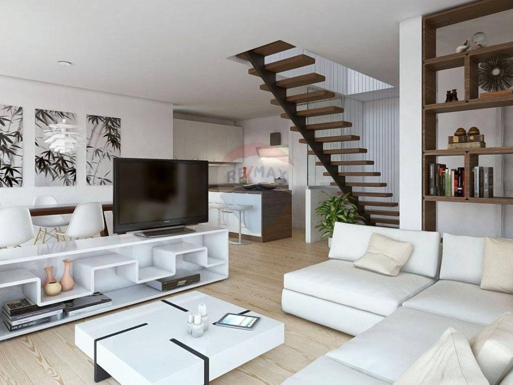 The first floor consists of an entrance area, a large open space living room with a kitchen, a bedroom with a bathroom, a toilet and a terrace where there is a swimming pool. An internal staircase leads to the upper floor, which consists of two bedrooms, each with its own bathroom and a terrace.