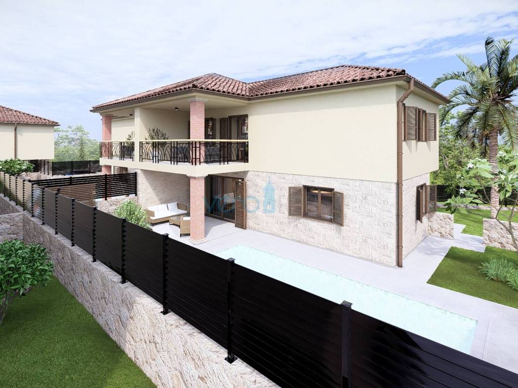 Island of Krk, town of Krk, Linardići, a building plot is for sale in an excellent location with a westward orientation. A project for a villa with two two-story apartments is in preparation. Of the total house area of 135m2, each apartment will have 67.5m2 across the ground floor and the first floor. On the ground floor, there is an open living space, kitchen, toilet, and covered terrace. Internal stairs lead to the first floor, where there are three bedrooms, two bathrooms, and a covered terrace. One bedroom has its own bathroom, and two bedrooms share the second bathroom. Also, two bedrooms have access to the covered terrace. Each apartment has its own pool. The sea is approximately 2000m away. An excellent opportunity for a tourist investment.