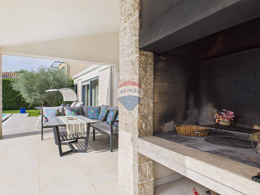 The house is very modern and built with high-quality materials. It features a spacious living room and kitchen with access to the terrace, and five bedrooms, each with its own bathroom. One of the bedrooms also includes a bathtub.