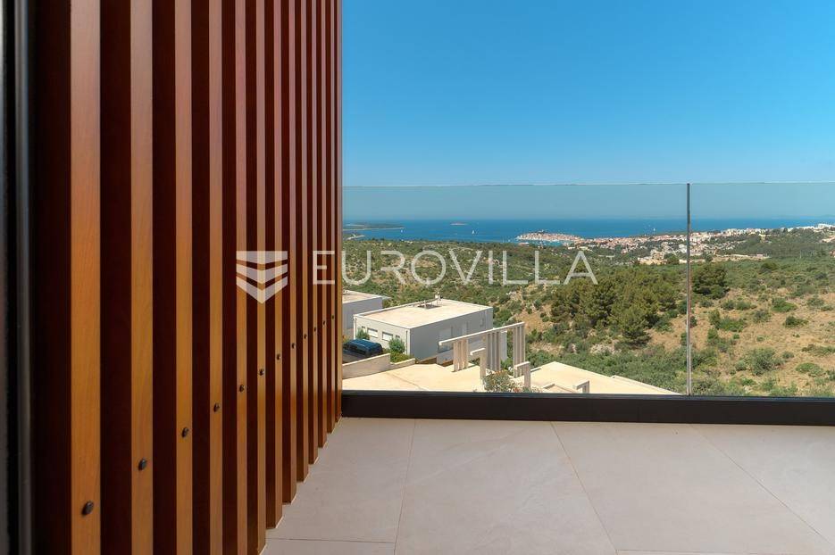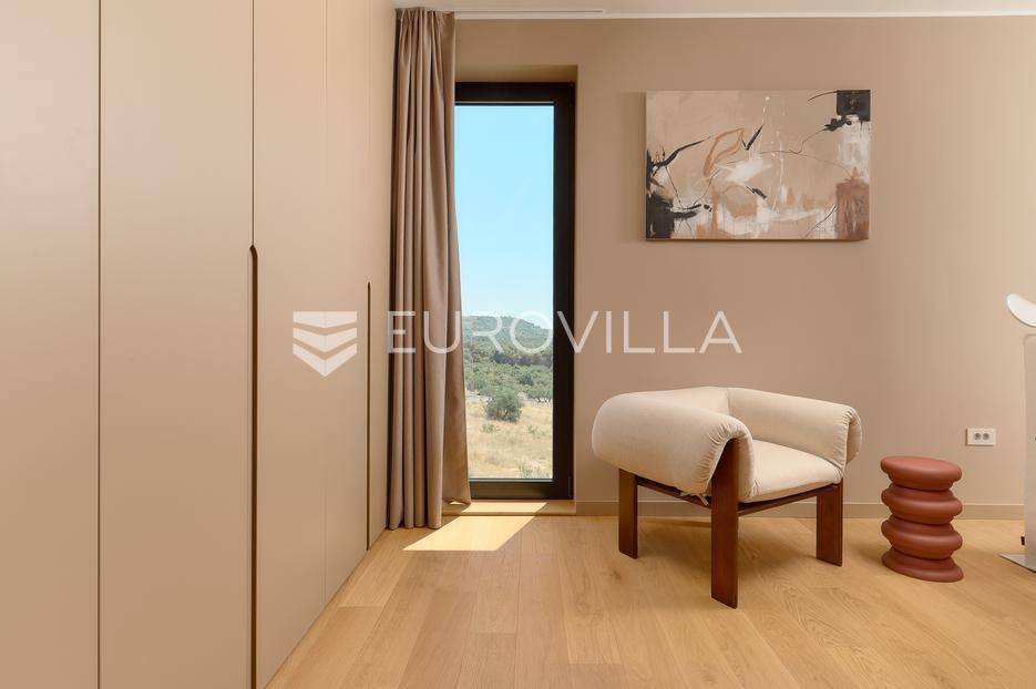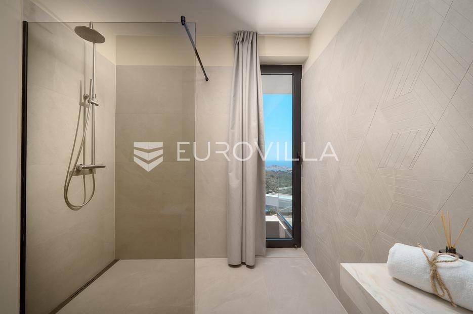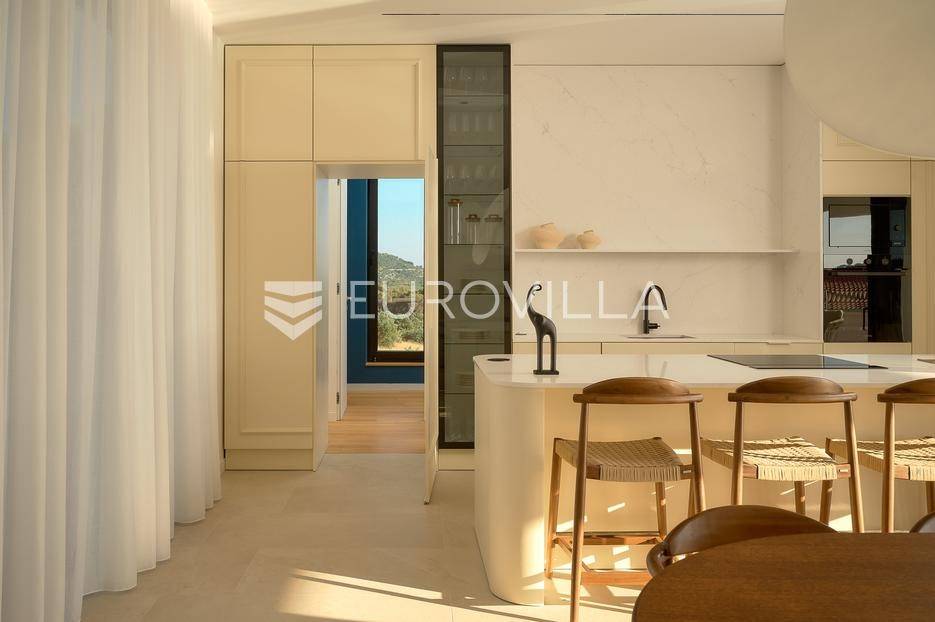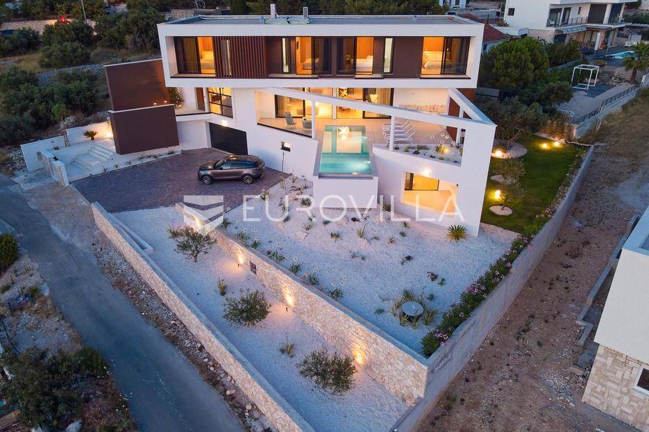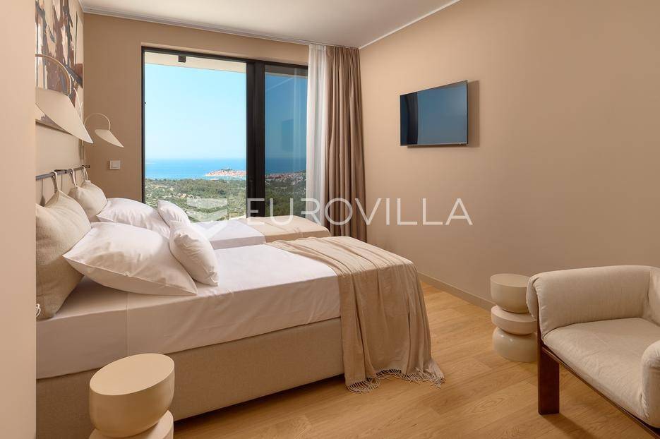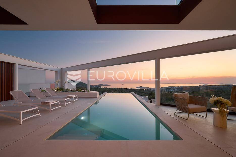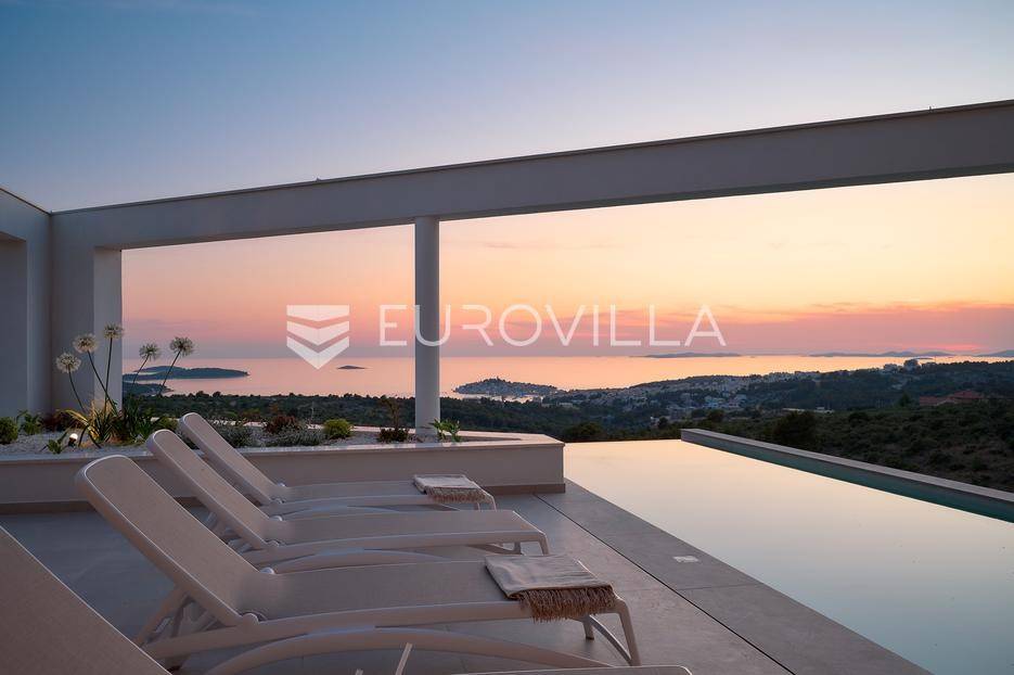 U suterenu se nalazi prostrana garaža s dva parkirna mjesta, te dodatni funkcionalni prostori - strojarnica, ostava i kotlovnica. Na istoj etaži smješten je i zaseban studio apartman s vlastitom terasom, idealan za goste ili osoblje.Unutarnjim stepeništem dolazi se do prizemlja, koje se otvara u raskošnu dnevnu zonu - prostrani dnevni boravak povezan s blagovaonicom i modernom kuhinjom, uz dodatnu ostavu i gostinjski toalet. Velike staklene stijene omogućuju obilje prirodnog svjetla i izravan izlaz na velike terase: na jednoj se nalazi spektakularan infinity bazen s prostorom za sunčanje, dok je druga opremljena ljetnom kuhinjom i roštiljem - savršeno za druženja i opuštanje.Na katu se nalaze četiri elegantne spavaće sobe, svaka s privatnom kupaonicom i izlazom na balkon s pogledom na more, što pruža osjećaj ekskluzivnosti i potpunog mira.Vila je izgrađena s naglaskom na vrhunske materijale, suvremenu arhitekturu i napredne pametne sustave upravljanja, kako bi pružila najvišu razinu funkcionalnosti, sigurnosti i estetike.Ovaj dom omogućuje iznimnu razinu privatnosti, komfora i prestiža, te je koncipiran da zadovolji najzahtjevnije kriterije modernog stanovanja. Smještena u ambijentu netaknute prirode, okružena maslinicima i vinogradima, vila nudi potpuni mir, dok je istodobno tek nekoliko minuta hoda od centra Primoštena.Za dodatne informacije ili dogovor razgledavanja, rado stojimo na raspolaganju.