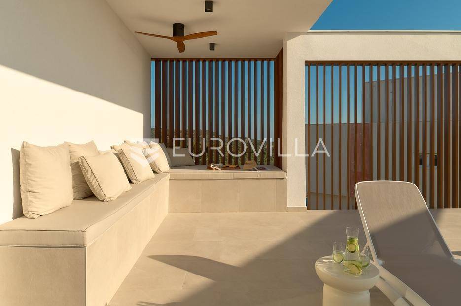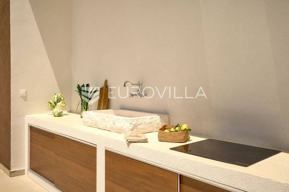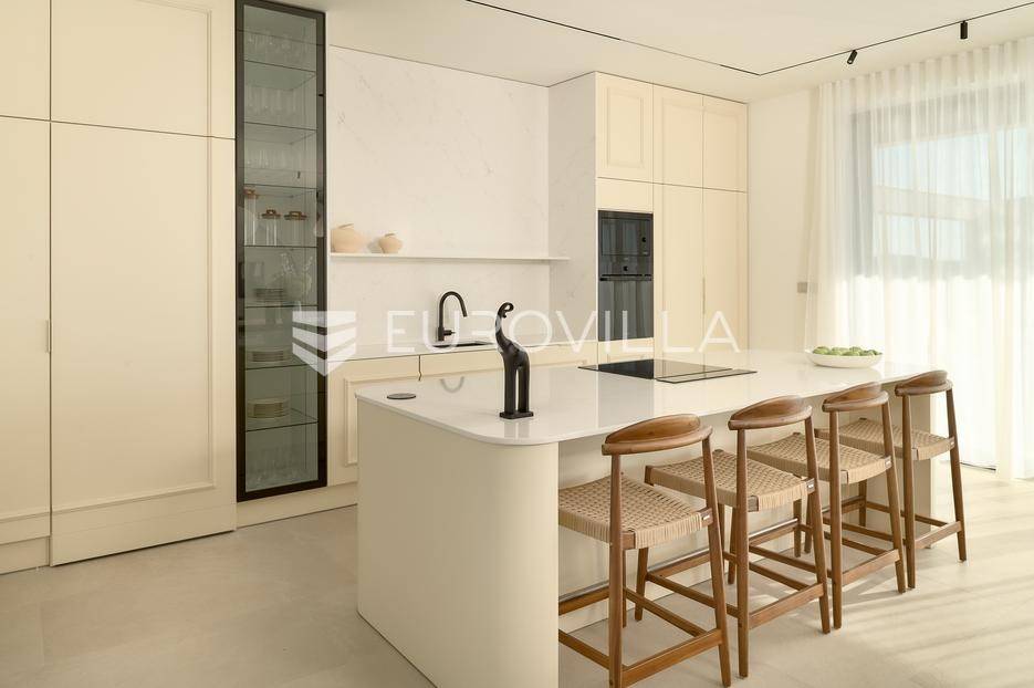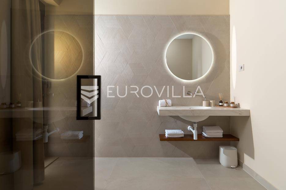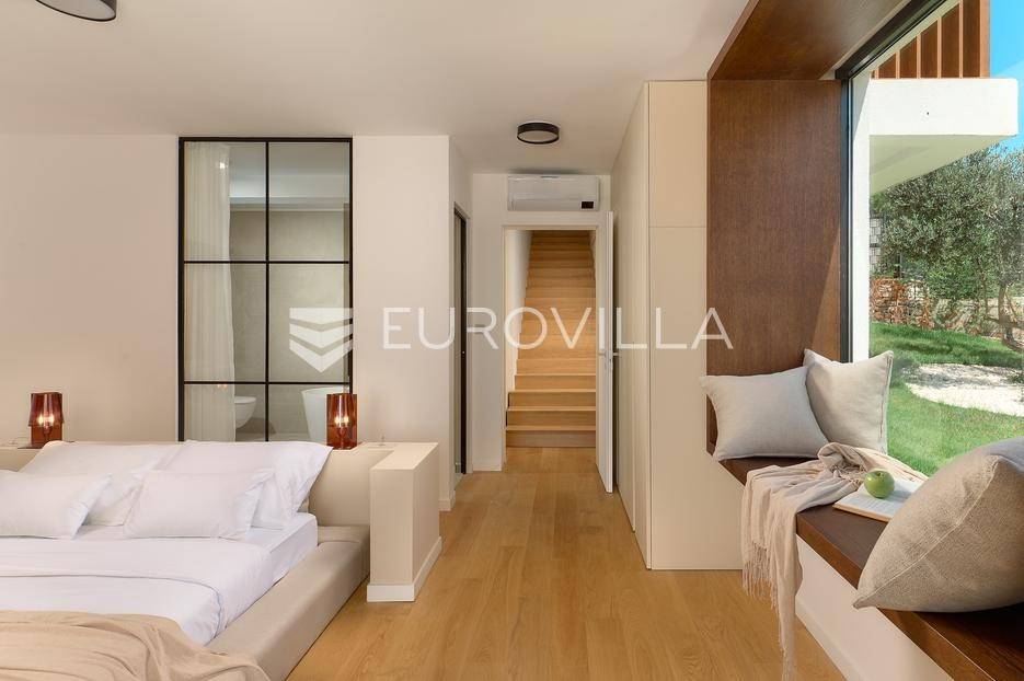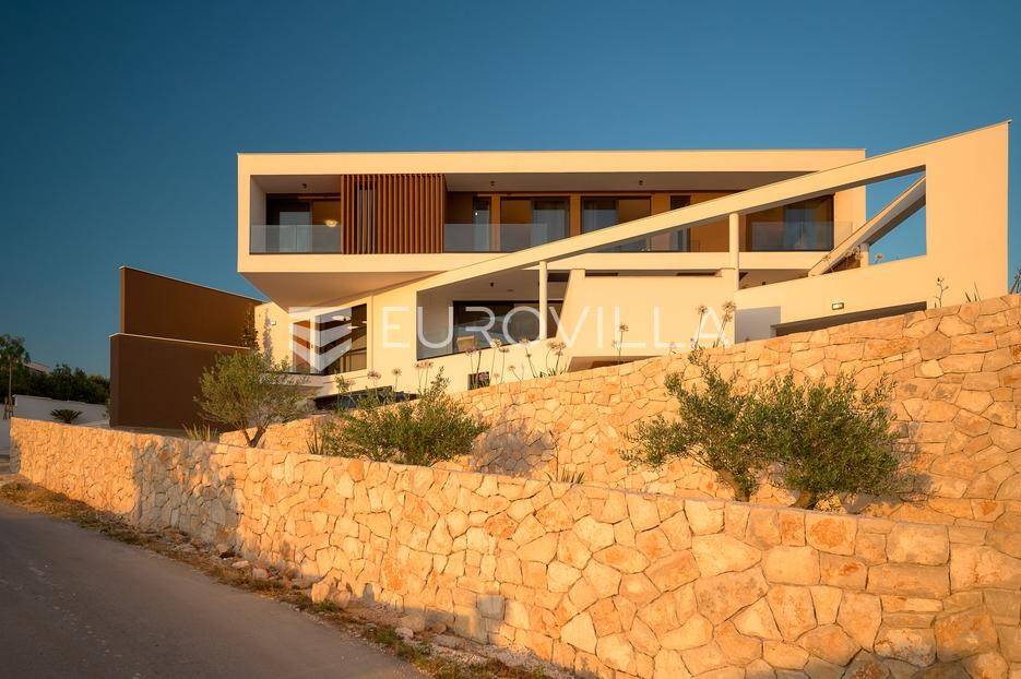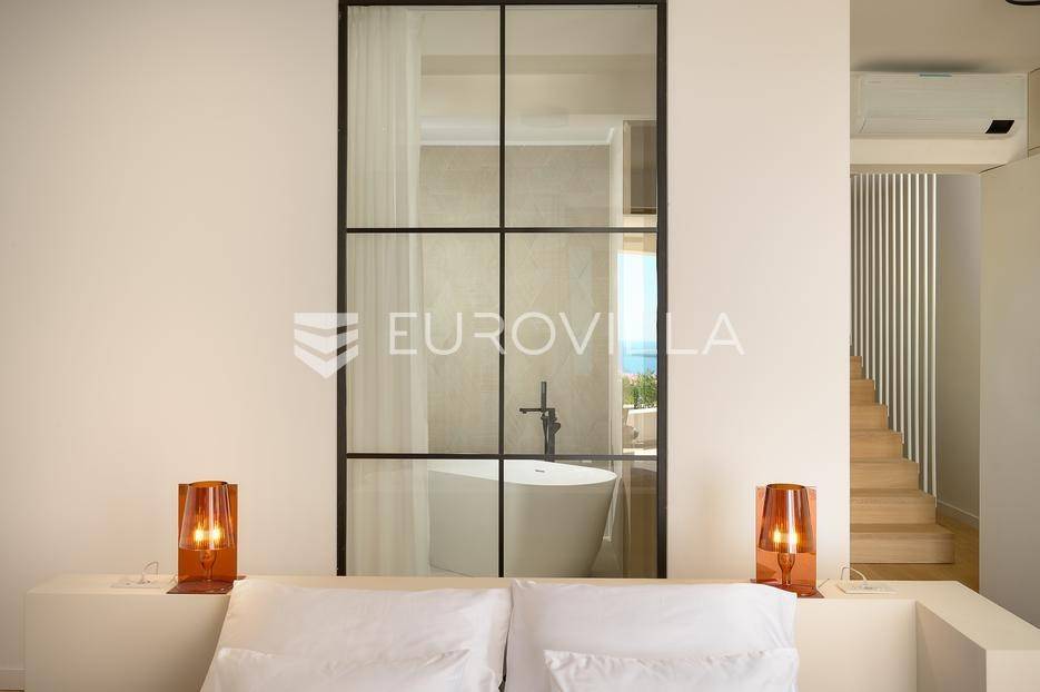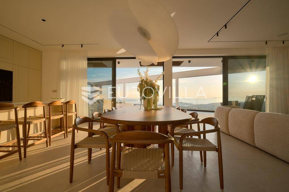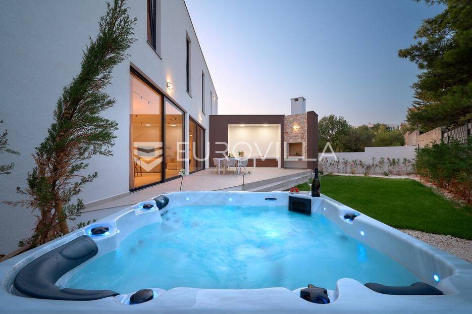 U suterenu se nalazi prostrana garaža s dva parkirna mjesta, te dodatni funkcionalni prostori - strojarnica, ostava i kotlovnica. Na istoj etaži smješten je i zaseban studio apartman s vlastitom terasom, idealan za goste ili osoblje.Unutarnjim stepeništem dolazi se do prizemlja, koje se otvara u raskošnu dnevnu zonu - prostrani dnevni boravak povezan s blagovaonicom i modernom kuhinjom, uz dodatnu ostavu i gostinjski toalet. Velike staklene stijene omogućuju obilje prirodnog svjetla i izravan izlaz na velike terase: na jednoj se nalazi spektakularan infinity bazen s prostorom za sunčanje, dok je druga opremljena ljetnom kuhinjom i roštiljem - savršeno za druženja i opuštanje.Na katu se nalaze četiri elegantne spavaće sobe, svaka s privatnom kupaonicom i izlazom na balkon s pogledom na more, što pruža osjećaj ekskluzivnosti i potpunog mira.Vila je izgrađena s naglaskom na vrhunske materijale, suvremenu arhitekturu i napredne pametne sustave upravljanja, kako bi pružila najvišu razinu funkcionalnosti, sigurnosti i estetike.Ovaj dom omogućuje iznimnu razinu privatnosti, komfora i prestiža, te je koncipiran da zadovolji najzahtjevnije kriterije modernog stanovanja. Smještena u ambijentu netaknute prirode, okružena maslinicima i vinogradima, vila nudi potpuni mir, dok je istodobno tek nekoliko minuta hoda od centra Primoštena.Za dodatne informacije ili dogovor razgledavanja, rado stojimo na raspolaganju.