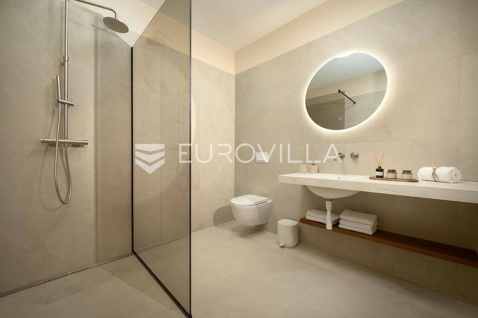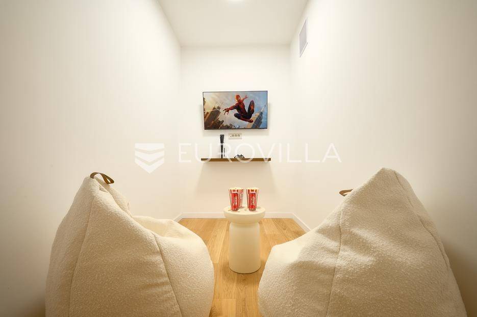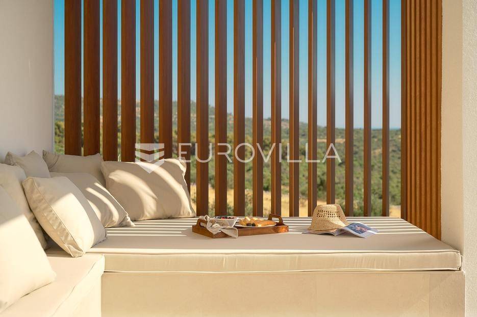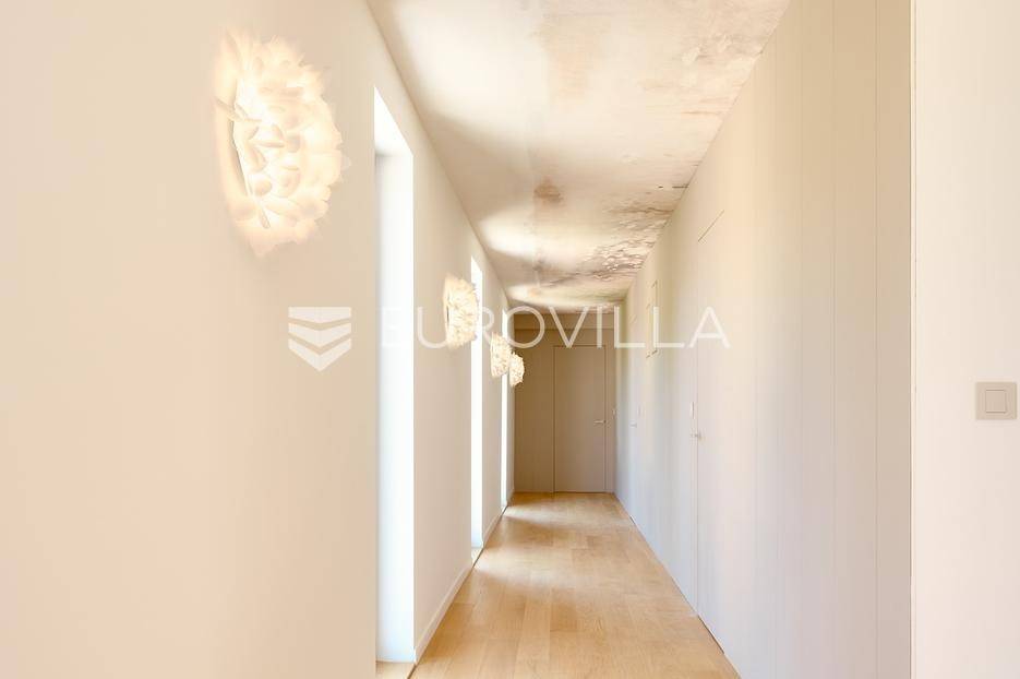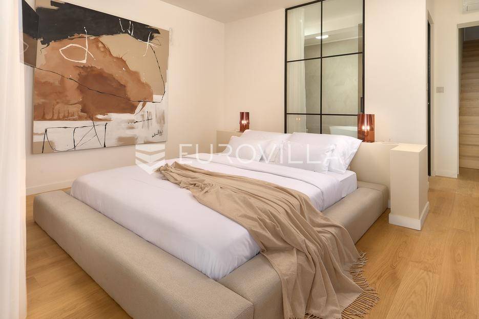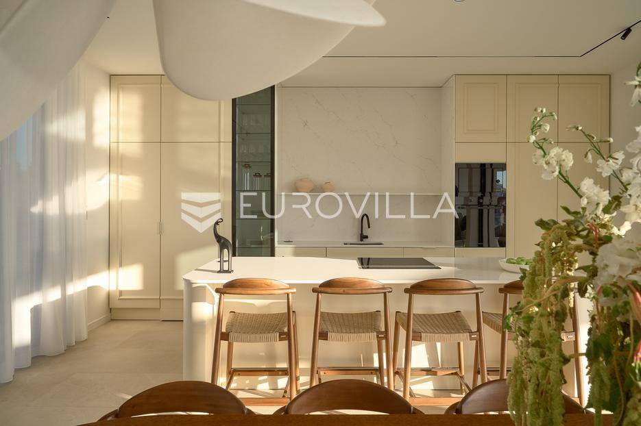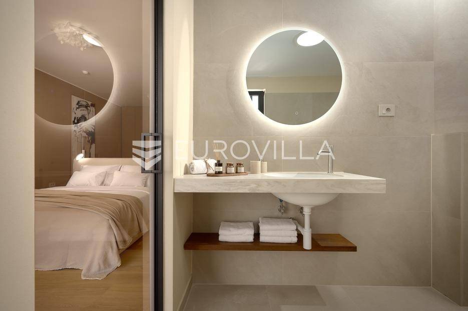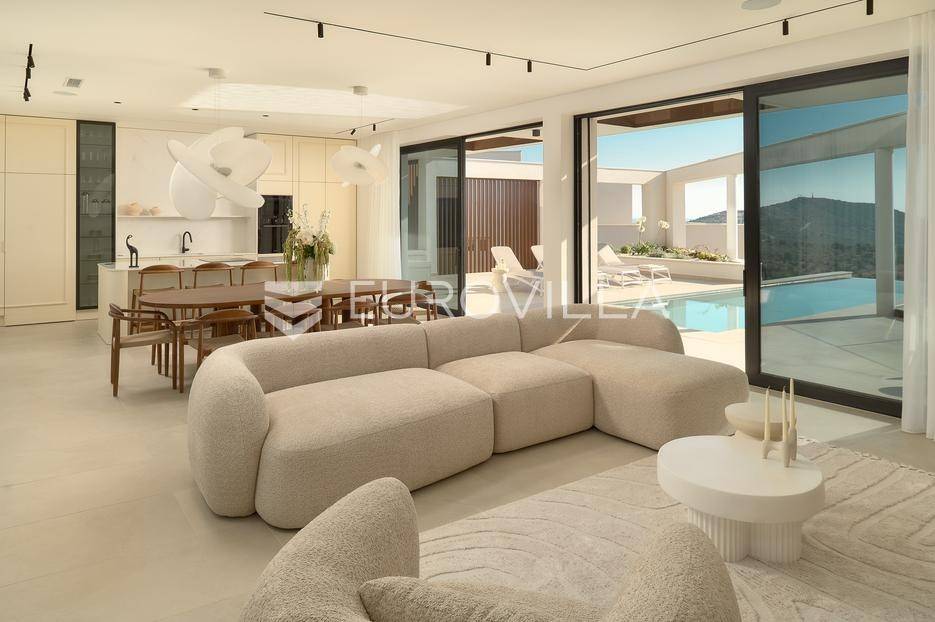 U suterenu se nalazi prostrana garaža s dva parkirna mjesta, te dodatni funkcionalni prostori - strojarnica, ostava i kotlovnica. Na istoj etaži smješten je i zaseban studio apartman s vlastitom terasom, idealan za goste ili osoblje.Unutarnjim stepeništem dolazi se do prizemlja, koje se otvara u raskošnu dnevnu zonu - prostrani dnevni boravak povezan s blagovaonicom i modernom kuhinjom, uz dodatnu ostavu i gostinjski toalet. Velike staklene stijene omogućuju obilje prirodnog svjetla i izravan izlaz na velike terase: na jednoj se nalazi spektakularan infinity bazen s prostorom za sunčanje, dok je druga opremljena ljetnom kuhinjom i roštiljem - savršeno za druženja i opuštanje.Na katu se nalaze četiri elegantne spavaće sobe, svaka s privatnom kupaonicom i izlazom na balkon s pogledom na more, što pruža osjećaj ekskluzivnosti i potpunog mira.Vila je izgrađena s naglaskom na vrhunske materijale, suvremenu arhitekturu i napredne pametne sustave upravljanja, kako bi pružila najvišu razinu funkcionalnosti, sigurnosti i estetike.Ovaj dom omogućuje iznimnu razinu privatnosti, komfora i prestiža, te je koncipiran da zadovolji najzahtjevnije kriterije modernog stanovanja. Smještena u ambijentu netaknute prirode, okružena maslinicima i vinogradima, vila nudi potpuni mir, dok je istodobno tek nekoliko minuta hoda od centra Primoštena.Za dodatne informacije ili dogovor razgledavanja, rado stojimo na raspolaganju.
