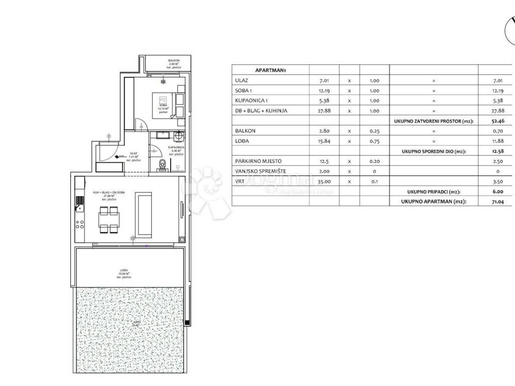 SV. FILIP I JAKOV - LUXURIOUS APARTMENT 1 ON THE GROUND FLOOR OF THE BUILDING  In a peaceful location in St. Filip and Jakov, a building with a total of 12 residential units is being constructed, offering a perfect blend of peace and comfort. Here, a tranquil life intertwines with modern luxury.  Apartment 1 is located on the ground floor and consists of an entrance area, a living room and kitchen, a bedroom, a bathroom, and a covered terrace of 15.84 m2, as well as a smaller terrace accessible from the bedroom with an area of 2.80 m2. The apartment includes a private garden of 35 m2 and one parking space next to the building. The internal living area of the apartment is 52.46 m2, and the total net sales area is 71.04 m2. Additionally, there is the possibility to purchase additional storage space behind the building.  The building is constructed according to all modern construction standards, and noteworthy features include:  Elevator PVC windows with triple glazing and electric aluminum shutters, mosquito nets Connection to city water supply and sewage Built with brick blocks + 10 cm Styrofoam insulation Electric underfloor heating in the bathroom Heating and cooling through air conditioning Intercom Floor coverings: high-quality ceramic tiles in the kitchen, living room, bathroom, WC, and hallway. In the early construction phase, there is an option to choose floor coverings in consultation with the investor. The rooftop terrace will have connections for electricity and water  Expected Completion of Works: 06/2025.  This apartment is not just a home; it's an investment in the quality of life. Fulfill your dreams of a family home or a tourist oasis in the heart of Dalmatia.  St. Filip and Jakov offer a perfect balance of tranquility and proximity to urban amenities. You can reach Zadar in half an hour and Zadar Airport in just 25 minutes. The building is located near all amenities: shops, cafes, restaurants, only 800 meters from the sea...  For any additional information or to schedule a viewing, feel free to contact me at +385 91 9077 396.  Contact: Vedrana Bašić Mobile: +385 91 9077 396 Email: vedrana.basic@dogma-nekretnine.com  ID CODE: DA100061928  Vedrana Bašić  Asistent u posredovanju Mob: 091/907-7396 Tel: 023/551-400 E-mail: vedrana.basic@dogma-nekretnine.com www.dogma-nekretnine.com