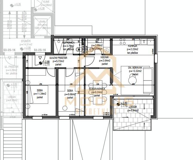 Stan S4 je položen na prvom katu objekta, sastoji se od dvije spavaće sobe, ulaznog prostora, hodnika, kupaonice, wc-a te dnevnog boravka, kuhinje i blagavaonice u povezanoj cjelini s izlazom na loggiu.