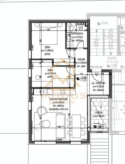 Stan S5 je položen na drugom katu objekta, sastoji se od dvije spavaće sobe, ulaznog prostora, hodnika, kupaonice te dnevnog boravka, kuhinje i blagavaonice u povezanoj cjelini s izlazom na loggiu.