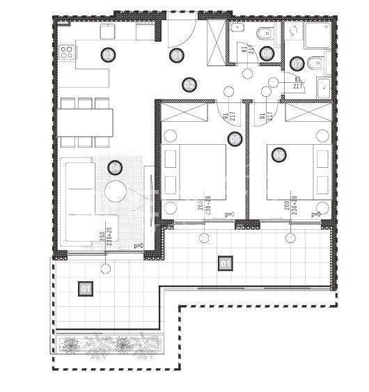 The layout is well-designed and functional. The net usable area is 67.37 m². The entrance opens into a bright open-concept living area where the kitchen, dining room and living room flow naturally together and are oriented west and south, ensuring plenty of natural light. Two comfortable bedrooms are positioned in the quieter part of the apartment, while the layout of the bathroom and additional toilet increases everyday practicality and privacy.